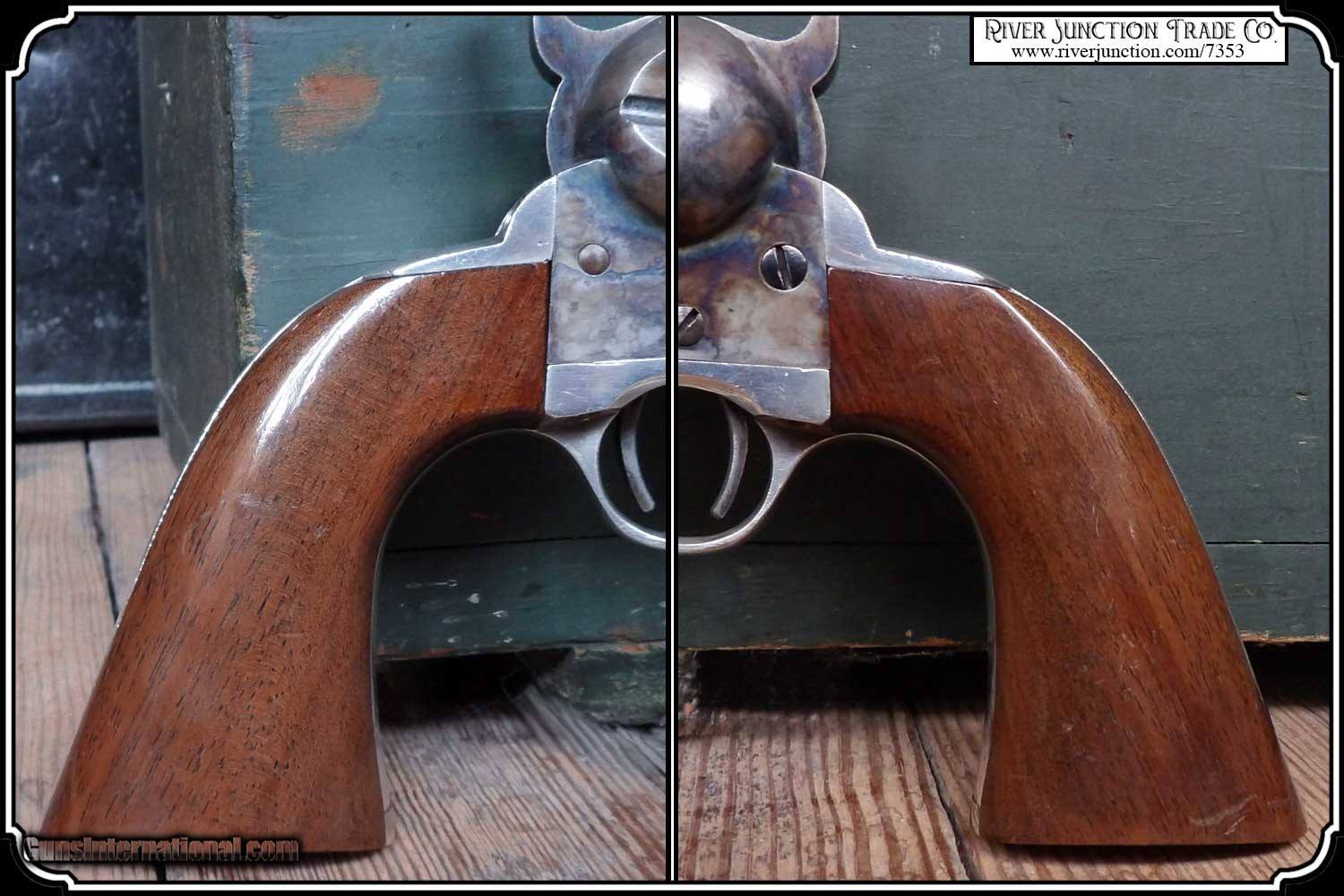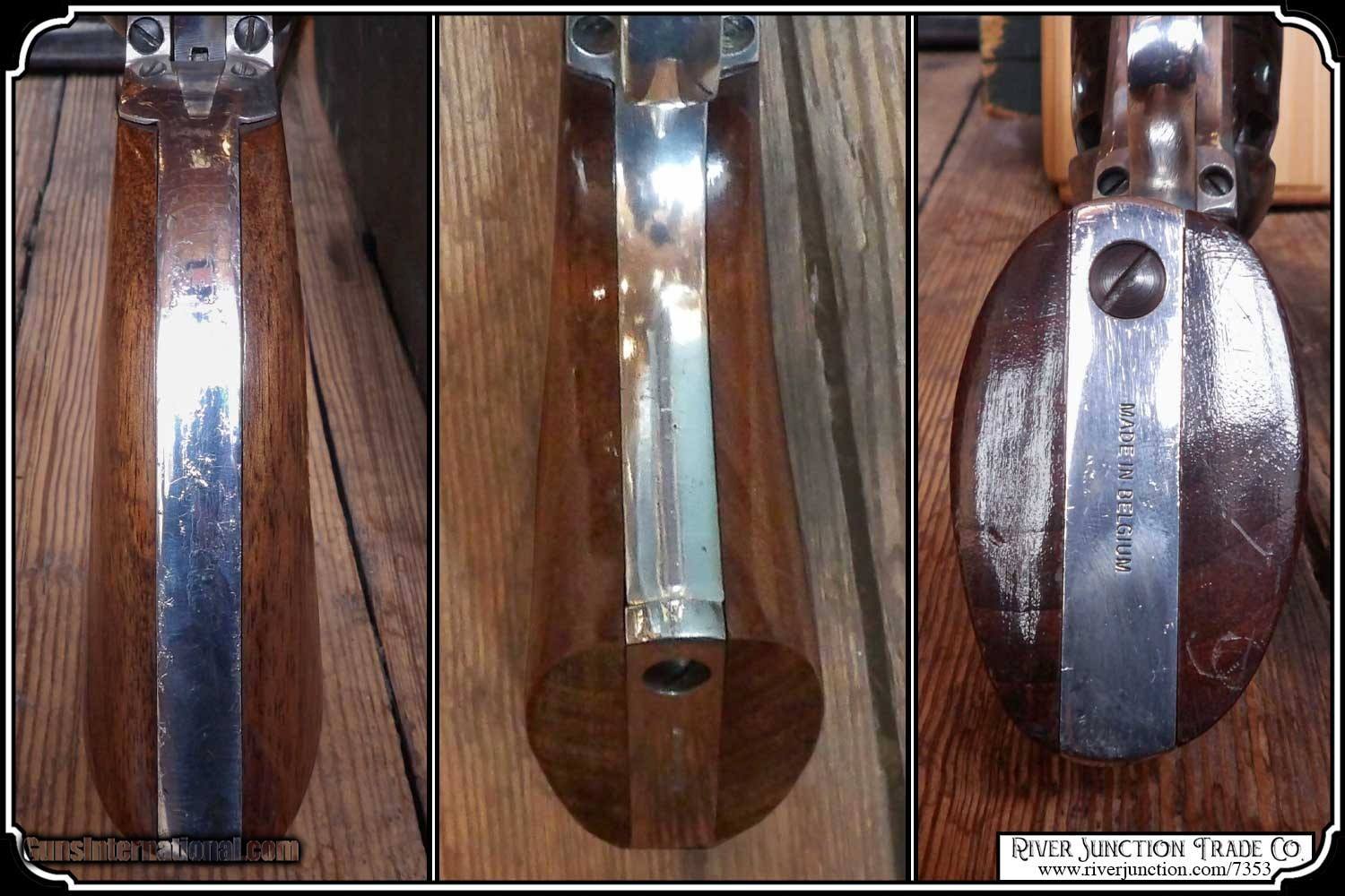 Description: Collectors consider this direct-line descendant from the original Civil War era 1860 Colt. They feel these are more authentic than the 2nd and 3rd generation Colts, produced by Colt in the late 21st Century. In 1853 Samuel Colt traveled overseas and licensed Belgian gun manufacturers to produce his revolvers, but the Civil War ended before they got into production. Then one hundred years later, these Belgian companies regrouped and began producing this six shooter with modern steel. The new pistols were marketed as 1960 New Model Army and were stamped Made in Belgium. At that time the upcoming centennial of the American Civil War, and no reproductions for reenactors all pointed to an obvious need. There to answer that need were two important ingredients, original Colt equipment waiting silently in Belgium for nearly a century and a young man by the name of William B. Edwards. Edwards was one of the principals of Centennial Arms Corp. of Chicago. Edwards realized there was a ready market for a second issue of the Colt Army. Edwards entrusted Fabriques de Armes Unies de Li_ge in Belgium with the production of the New Army. This 1860/1960 NEW MODEL ARMY is mechanically perfect. The action positive and locks up tight. This gun shows almost no signs of being used. The serial number is (C210). The (C) stands for CIVILIAN MODEL. The back strap and trigger guard are completely POLISHED SILVER PLATE (not nickel plated). The frame, hammer, and loading leaver are case hardened. Price: $1,295.00 Buy Now Contact Seller |