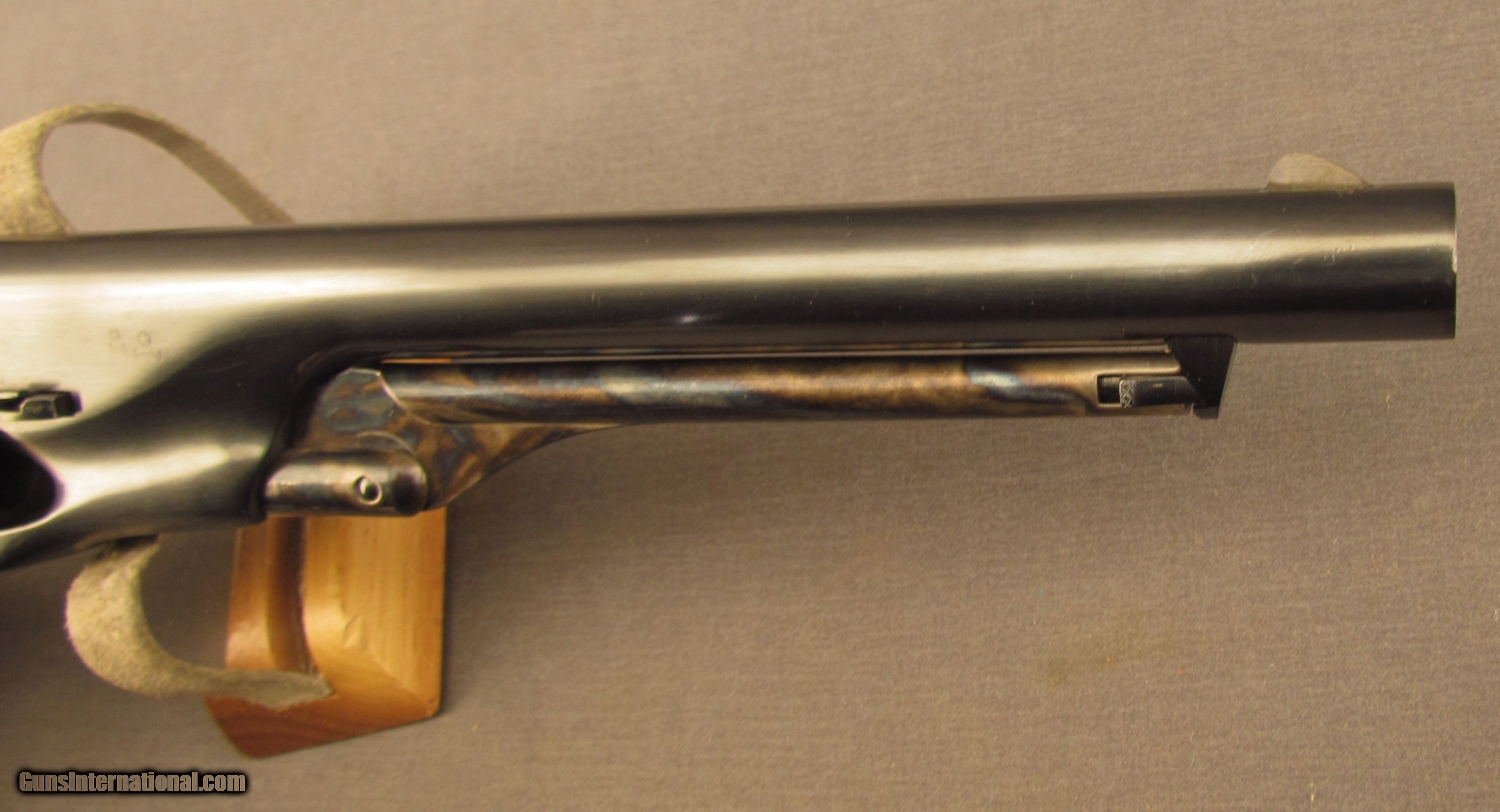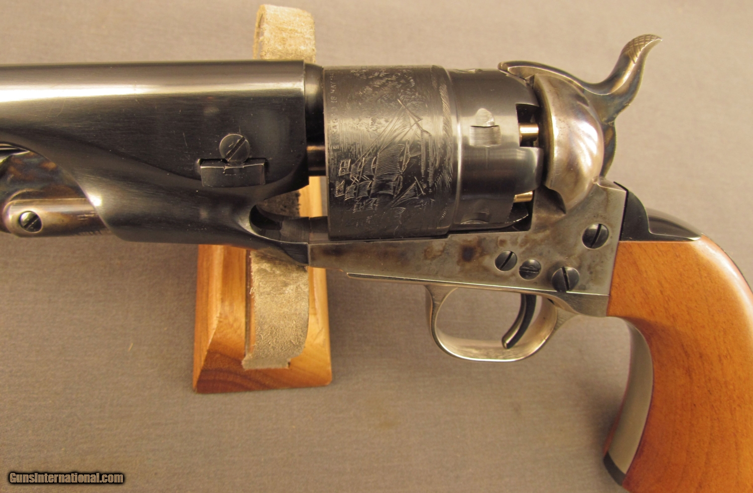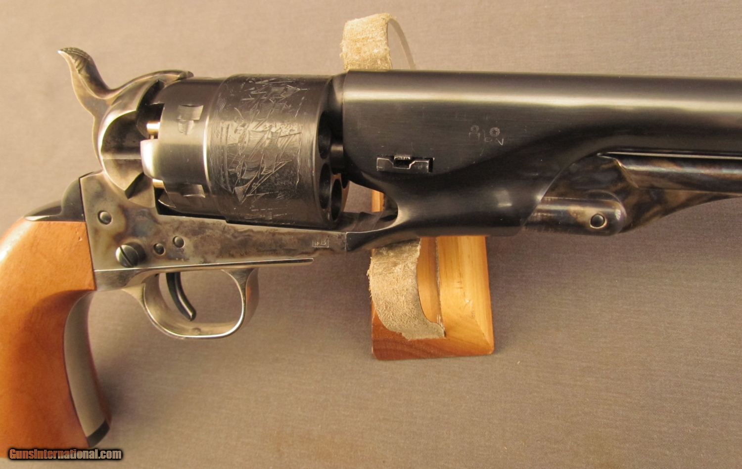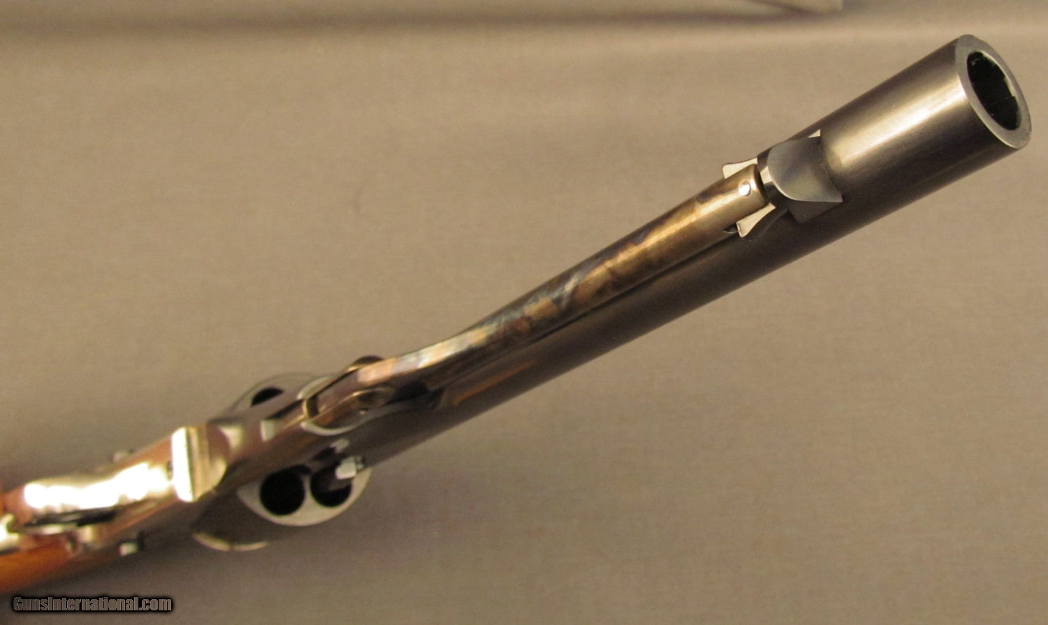 Description: S# A 63358, .44 caliber percussion, 8 inch barrel, new bore. This 2007 proofed revolver remains in near new probably unfired condition. features include silver plated triggerguard, gold plated nipples, case colored loading lever, frame and hammer, and one piece grips. Cylinder shows a hint of a turn ring, barrel has a few very light scratches, backstrap has a couple tiny dings with a light scratch on butt. Loading lever has a small rub from plunger. All these blemishes are very small and light, they are only mentioned because the piece is so nice. Frame is cut for a shoulder stock tht is not present. A very attractive percussion revolver antique. SOLD Manufacturer: Uberti Model: 1860 Caliber Info: .44 Cal Gauge Info: .44 Cal |