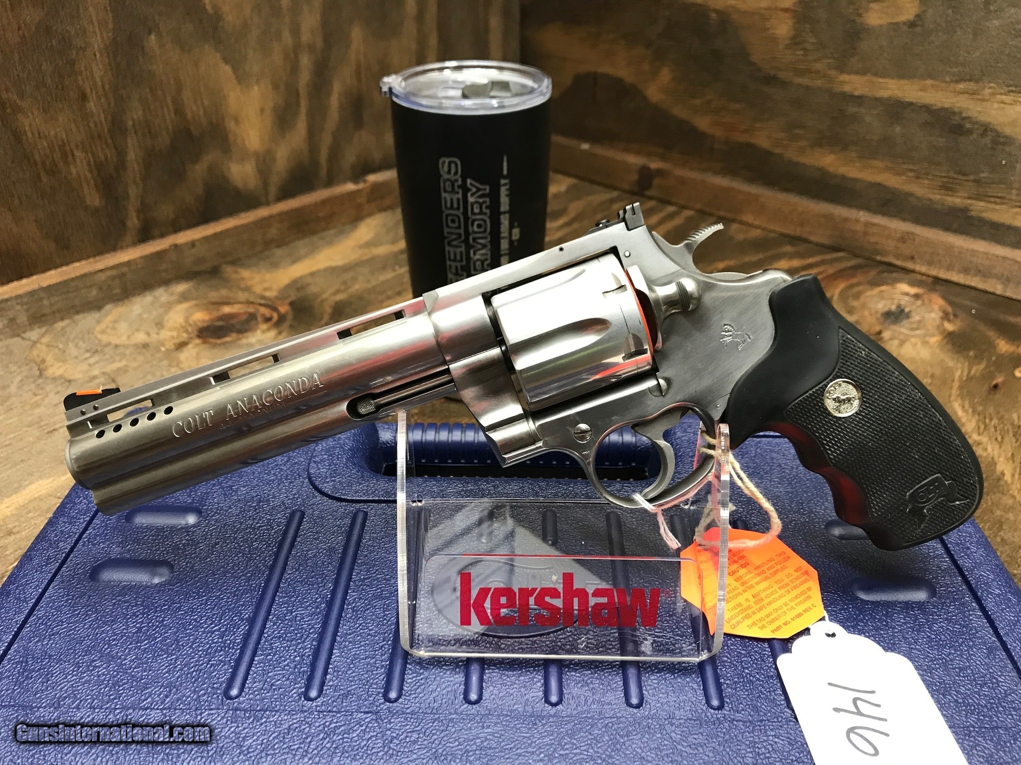 Description: Guns Listing ID: 356362 Colt, Anaconda , stainless with 6” factory ported barrel, appears unfired with cylinder check still in it, comes with factory box and papers. Research shows a 1998 production year but DO NOT quote me on that. See pictures for exact condition. SOLD Manufacturer: COLT Model: ANACONDA (PORTED) Caliber Info: 44 MAG Condition: Used - Non-Certified Barrels: 6 BARREL Finish: STAINLESS |