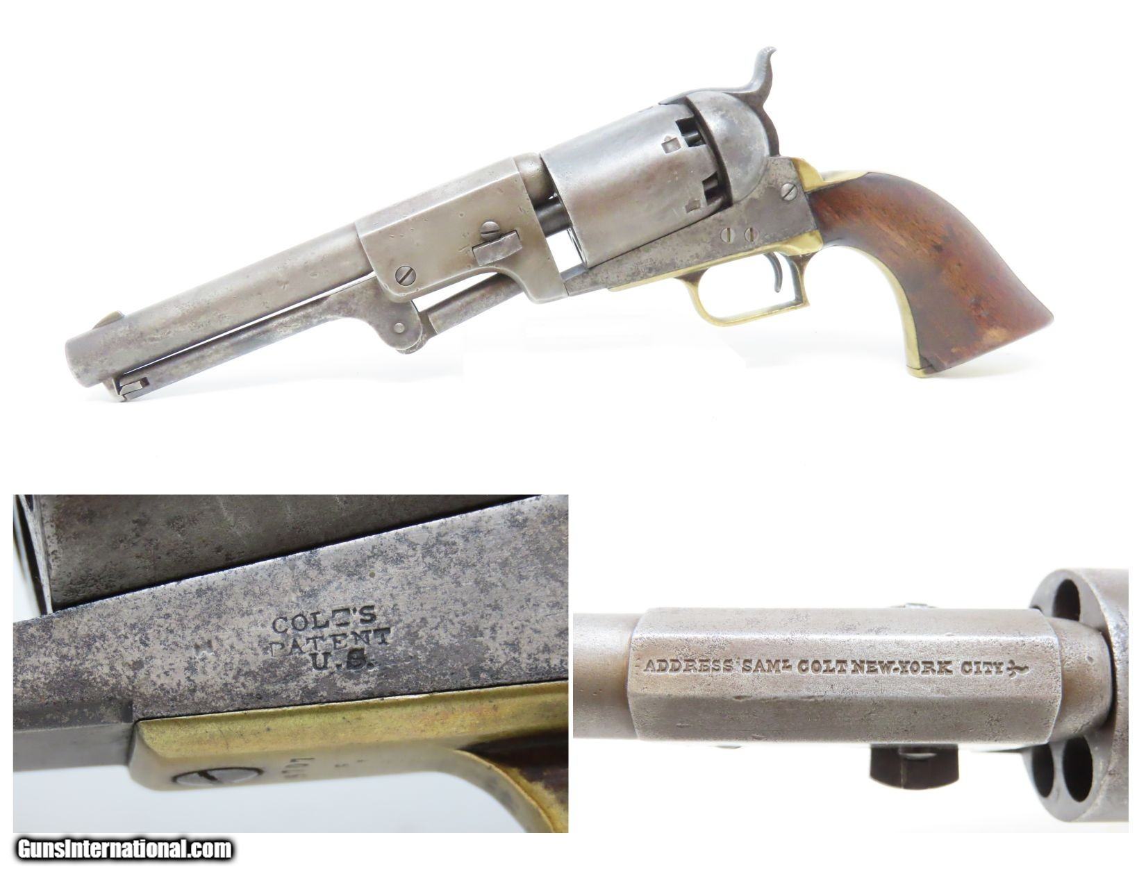 Description: c1851 Antique CIVIL WAR Era 2nd Model COLT DRAGOON .44 PERCUSSION Revolver One of 2,700; Second Year Production, Made in 1851 Here we present an antique U.S. issue Colt 2nd Model Dragoon Revolver, manufactured in 1851 in Hartford, Connecticut. Colt produced about 2700 2nd Model Dragoon Revolvers between 1850 and 1855. At least part of an Army contract for 1,000 revolvers dated February 4, 1850, was filled with 2nd Models. The revolver has the distinctive combination of a square-back, brass trigger guard and rectangular cylinder stops found only on the 2nd Model Dragoons and has the V-shaped mainspring used to about serial number 10,000. The half round barrel is marked: "-ADDRESS SAML COLT NEW-YORK CITY-" reading from the muzzle to the breech. The left front of the frame is roll-stamped: "COLT'S/PATENT/U.S." in three lines. The full serial number, "9707" is located on the barrel lug, frame, trigger guard, backstrap, cylinder and loading lever. The overall condition is good. Original gray patina. Strong action. Good, clear bore. Numbers match. The left side of the grip is missing a chip in the toe, and the right side has heart carved in. Here is a great historical revolver from the pre-Civil War era! Own the original! This is a legitimate antique and not a reproduction. Barrel is 7 inches. Caliber: .44 Percussion Overall condition as seen in photos. Very Fast. Very Safe. FREE SHIPPING WORLDWIDE. Delivered directly to your door by express mail! Guaranteed AUTHENTIC & Includes CERTIFICATE OF AUTHENTICITY. ancestryguns $6600 #217166 SOLD Antique: Yes |