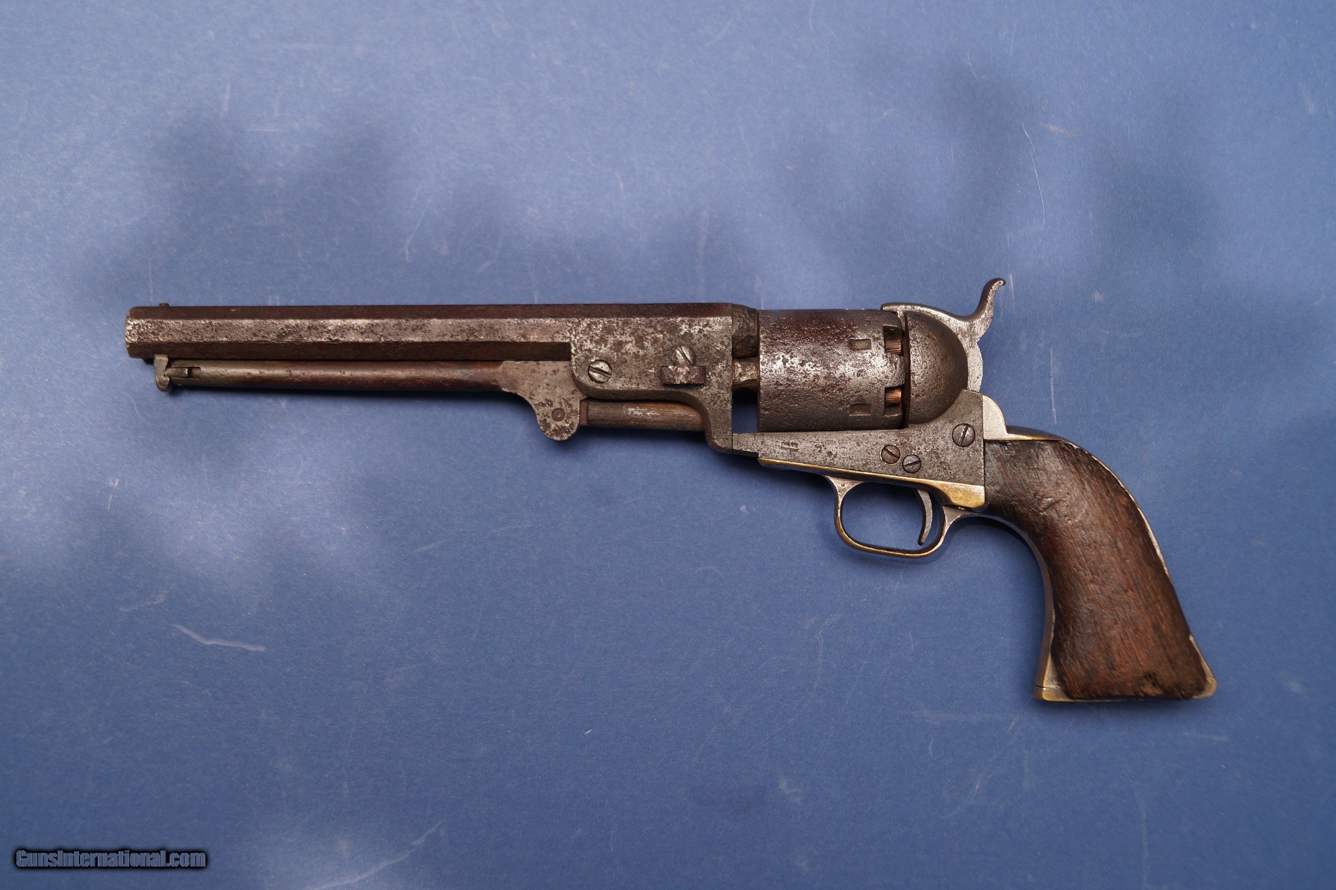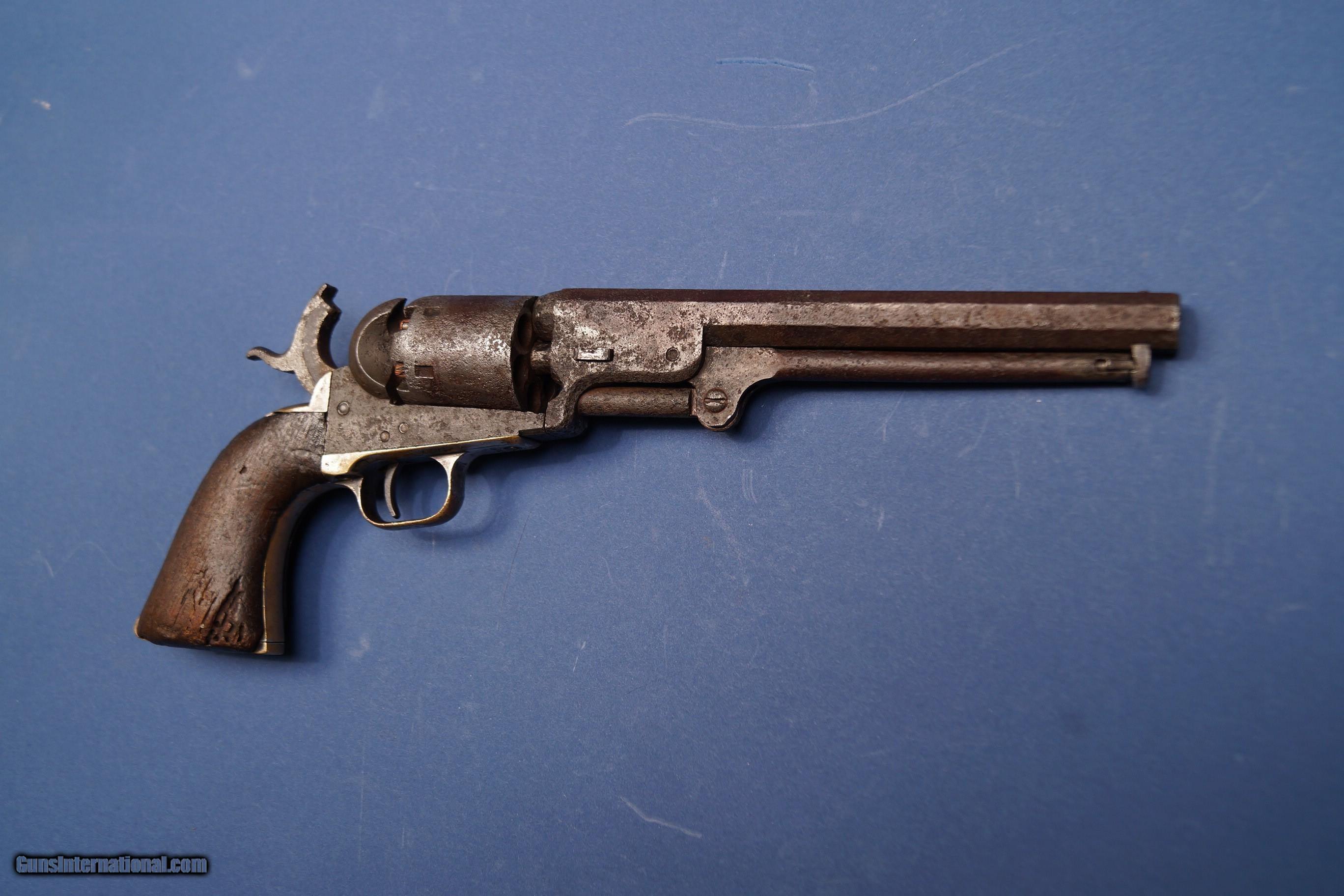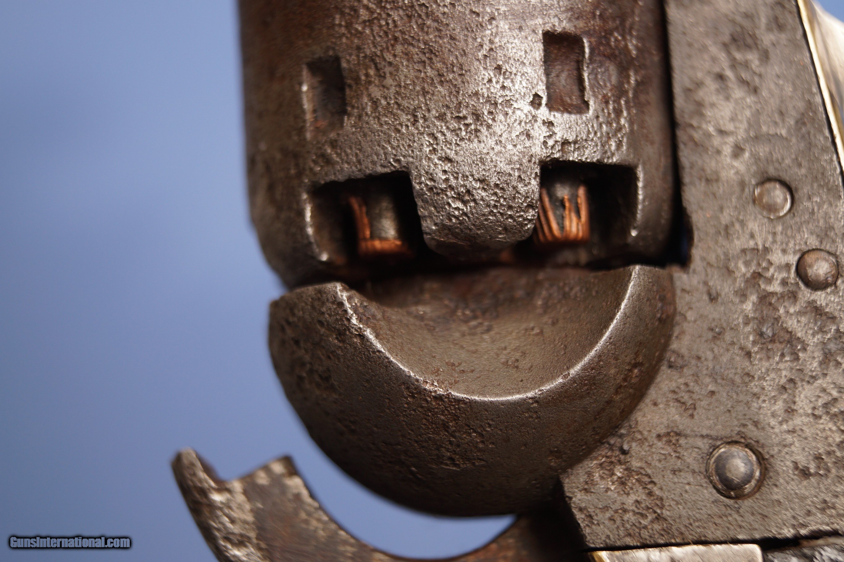 Description: Remarkable early 3rd Model Colt 1851 Navy Pistol dup up from a Northern California mining town found some years ago. It was found with 4 copper percussion caps on the cylinder cones and still had its original wooden grips almost completely intact. This is a true California Gold Rush Colt Navy and I'm sure it would have quite a story to tell if it could talk but the surfaces of this gun do a fair bit of talking on its behalf. The serial number is in the 15,000 range which dates it to the year 1852 which puts it right in the middle of the California Gold Rush era.Gold Miners, lawmen, and outlaws were quite fond of Sam Colt invention. As the saying goes, God created man, Sam Colt made them equal. It seems that after this one was emptied, it was dropped or discarded and left to the elements for over 100 years. Fortunately, the West is a lot more kind to old iron than back East where the ground and the climate consume any kind of ferrous metal or organic material like wood at a faster pace. That said, you will look for a long time before you ever find a dug up gun that still has its original wood like this one. I've attended a lot of Civil War shows when they unearth a musket or a pistol...it's basically almost down to a chunk of solid rust most of the time. You never see an intact relic like this one with the original grips. You can see where it was either on or in the ground for a very long time by the open grain and a few worm or termite holes at the base. We got this from a gentleman from California in 2018 and at that time, the action was completely frozen but it didn't look like it was too far gone from mechanically functioning once again so we gave it to our gunsmith to see what he could do. His efforts proved to be successful. Though not inexpensive to bring back to life, the action now cycles so it cocks, indexes, and the trigger works. When we got it back, he handed me a plastic back of all the stuff that come from inside the action when he cleaned it out. A few of the screws had to be replaced and it was missing the original wedge...which he was able to replace with an original one that matches up pretty well. The steel parts have quite a bit of light to moderate pitting but surprisingly, the Colt Barrel Address is intact and you can read all the serial numbers...even the cylinder still has traces of original scene. COLT'S PATENT is still clearly visible on the left side of the frame. The brass gripstraps survived just fine and if there was ever a testament to just how good Sam Colt's silver plating was back in the 1850's, remember this gun. This dug up 1851 HAS OVER HALF THE ORIGINAL SILVER PLATING on the trigger guard and back strap. Just amazing? You can pick up a Colt from the post Civil War era that's almost in mint condition and has never been fired and there will be little to no signs of silver plating remaining. I doubt the silver on late Colts was more than a couple atoms thick but in the 1850's, Colt plated their trigger guards and backstraps to survive the apocolypse...and here is the proof! If you're looking for a conversation piece or something to put under the glass of your coffee table or that shadow box on the wall, I promise you...this will get people talking! You can spend hours and hours looking at a relic like this...more so than one in fine condition. It doesnt speak so much in words as it does with its appearance. The good thing is that someone found it before it was too far gone. It's really to find one like this with original wood, silver, and the markings intact. Antique, Pre-1898. No FFL Required under Federal Law. No sales to DC, Chicago, or NYC. 30.00 shipping. SOLD Manufacturer: Colt Model: 1851 |