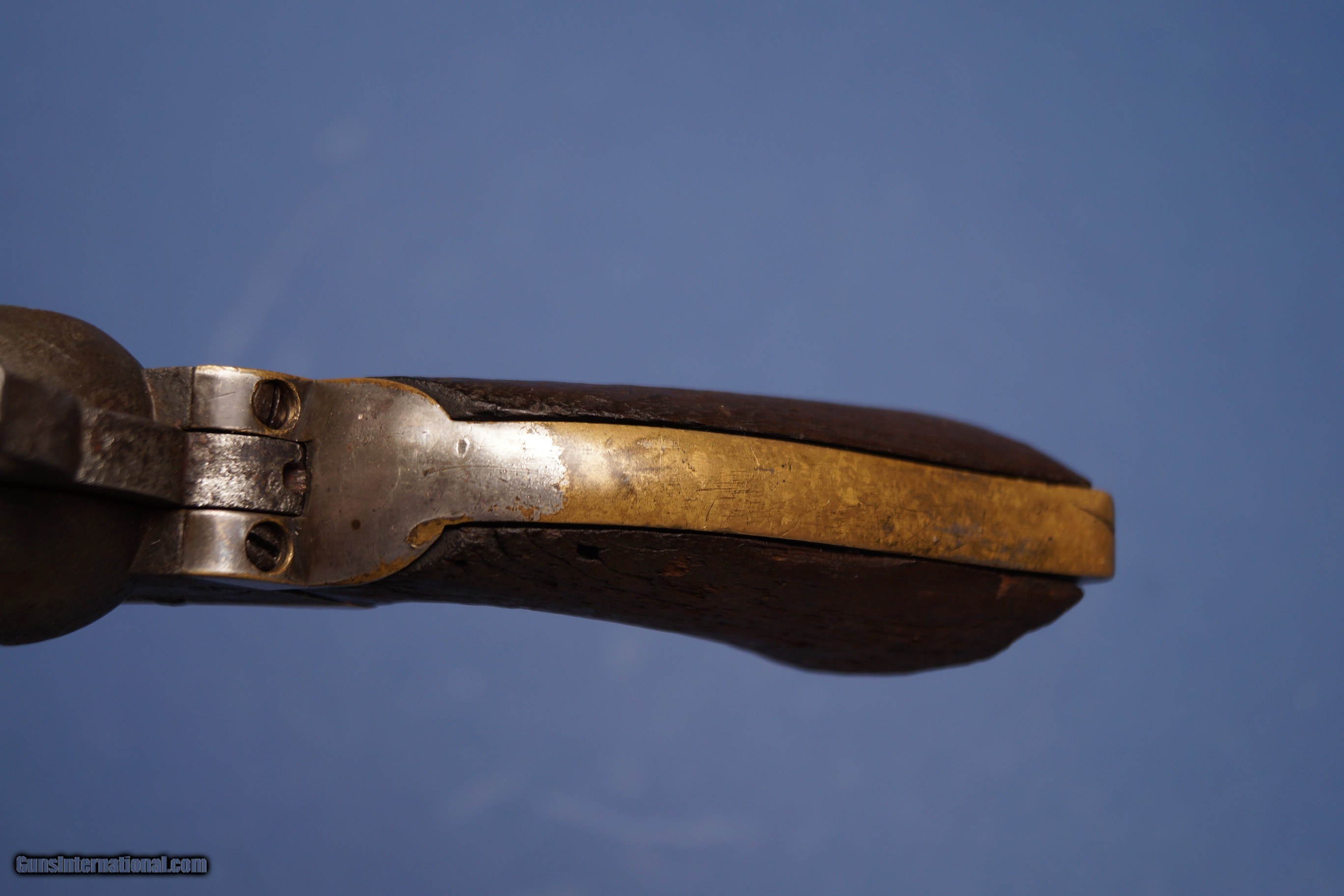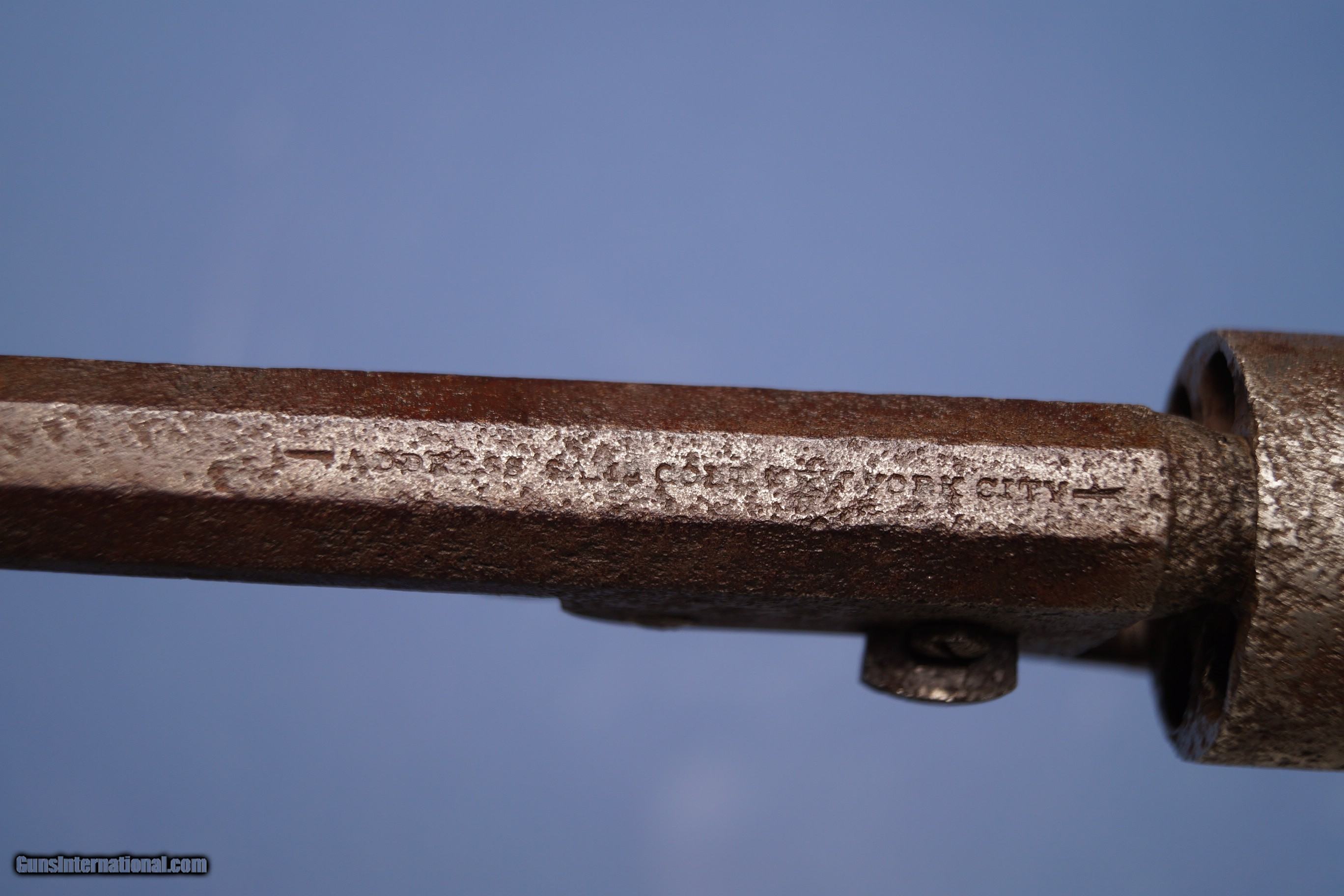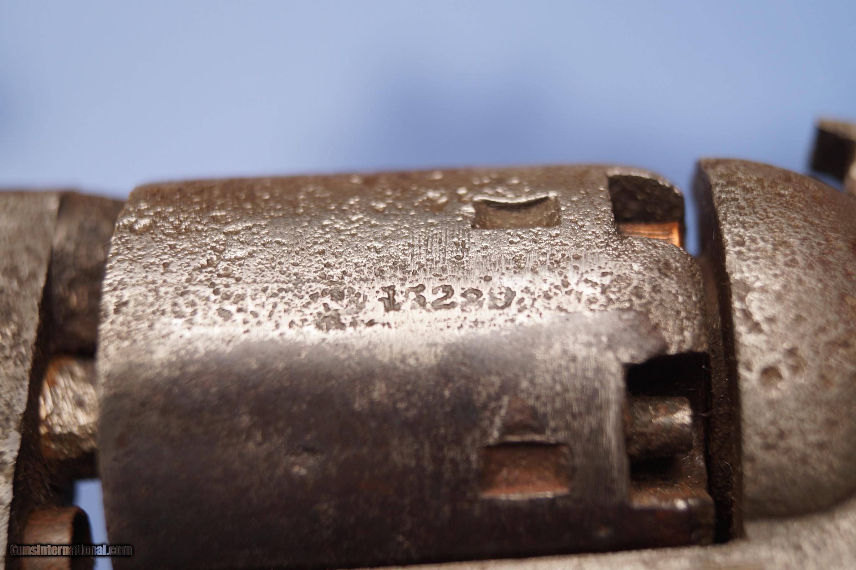 Description: Remarkable early 3rd Model Colt 1851 Navy Pistol dup up from a Northern California mining town found some years ago. It was found with 4 copper percussion caps on the cylinder cones and still had its original wooden grips almost completely intact. This is a true California Gold Rush Colt Navy and I'm sure it would have quite a story to tell if it could talk but the surfaces of this gun do a fair bit of talking on its behalf. The serial number is in the 15,000 range which dates it to the year 1852 which puts it right in the middle of the California Gold Rush era.Gold Miners, lawmen, and outlaws were quite fond of Sam Colt invention. As the saying goes, God created man, Sam Colt made them equal. It seems that after this one was emptied, it was dropped or discarded and left to the elements for over 100 years. Fortunately, the West is a lot more kind to old iron than back East where the ground and the climate consume any kind of ferrous metal or organic material like wood at a faster pace. That said, you will look for a long time before you ever find a dug up gun that still has its original wood like this one. I've attended a lot of Civil War shows when they unearth a musket or a pistol...it's basically almost down to a chunk of solid rust most of the time. You never see an intact relic like this one with the original grips. You can see where it was either on or in the ground for a very long time by the open grain and a few worm or termite holes at the base. We got this from a gentleman from California in 2018 and at that time, the action was completely frozen but it didn't look like it was too far gone from mechanically functioning once again so we gave it to our gunsmith to see what he could do. His efforts proved to be successful. Though not inexpensive to bring back to life, the action now cycles so it cocks, indexes, and the trigger works. When we got it back, he handed me a plastic back of all the stuff that come from inside the action when he cleaned it out. A few of the screws had to be replaced and it was missing the original wedge...which he was able to replace with an original one that matches up pretty well. The steel parts have quite a bit of light to moderate pitting but surprisingly, the Colt Barrel Address is intact and you can read all the serial numbers...even the cylinder still has traces of original scene. COLT'S PATENT is still clearly visible on the left side of the frame. The brass gripstraps survived just fine and if there was ever a testament to just how good Sam Colt's silver plating was back in the 1850's, remember this gun. This dug up 1851 HAS OVER HALF THE ORIGINAL SILVER PLATING on the trigger guard and back strap. Just amazing? You can pick up a Colt from the post Civil War era that's almost in mint condition and has never been fired and there will be little to no signs of silver plating remaining. I doubt the silver on late Colts was more than a couple atoms thick but in the 1850's, Colt plated their trigger guards and backstraps to survive the apocolypse...and here is the proof! If you're looking for a conversation piece or something to put under the glass of your coffee table or that shadow box on the wall, I promise you...this will get people talking! You can spend hours and hours looking at a relic like this...more so than one in fine condition. It doesnt speak so much in words as it does with its appearance. The good thing is that someone found it before it was too far gone. It's really to find one like this with original wood, silver, and the markings intact. Antique, Pre-1898. No FFL Required under Federal Law. No sales to DC, Chicago, or NYC. 30.00 shipping. SOLD Manufacturer: Colt Model: 1851 |