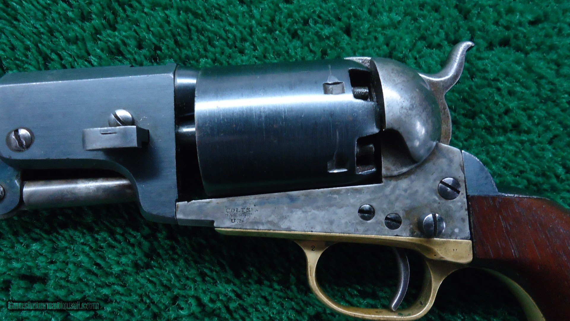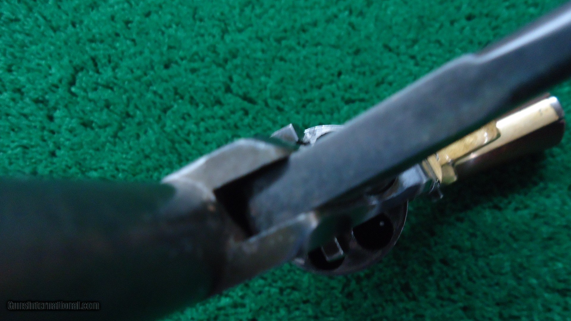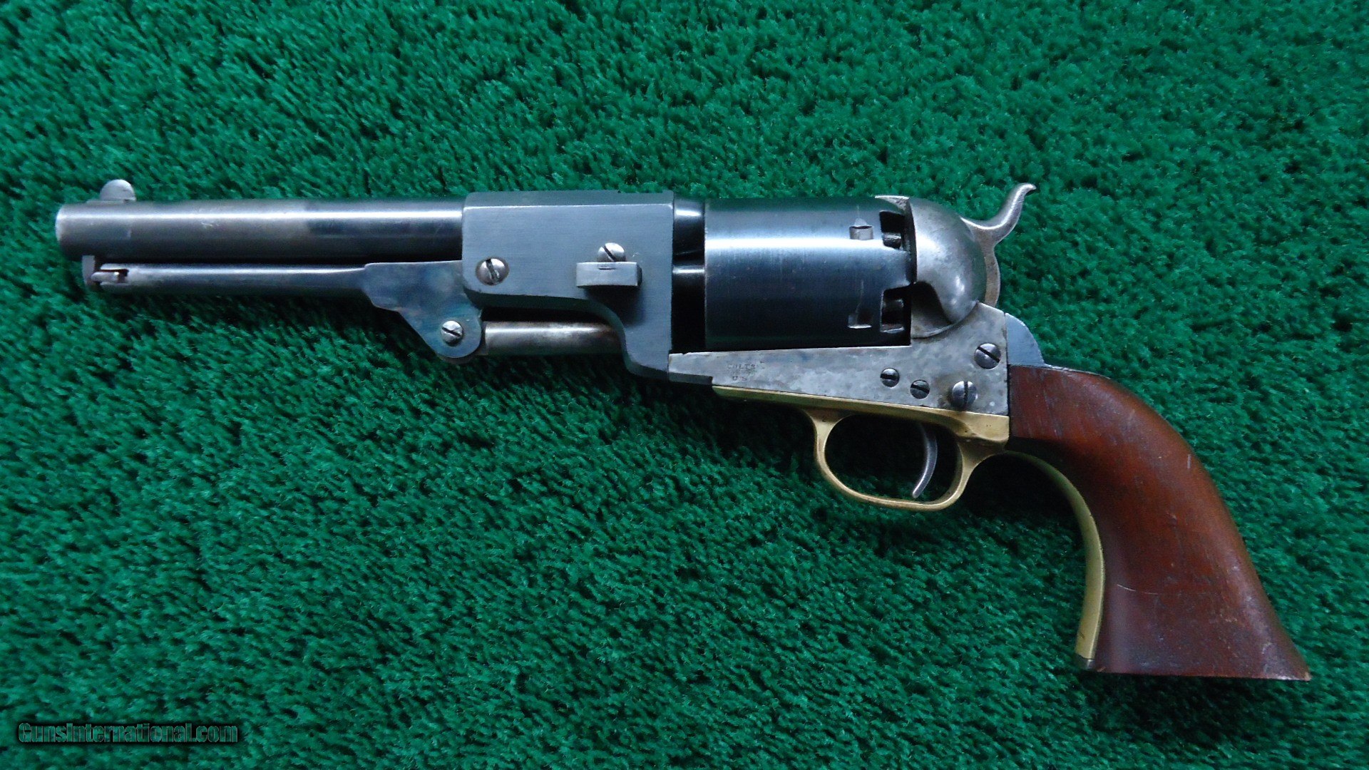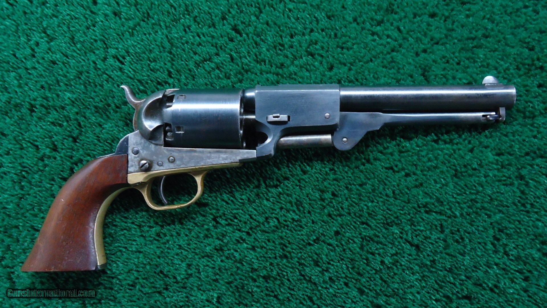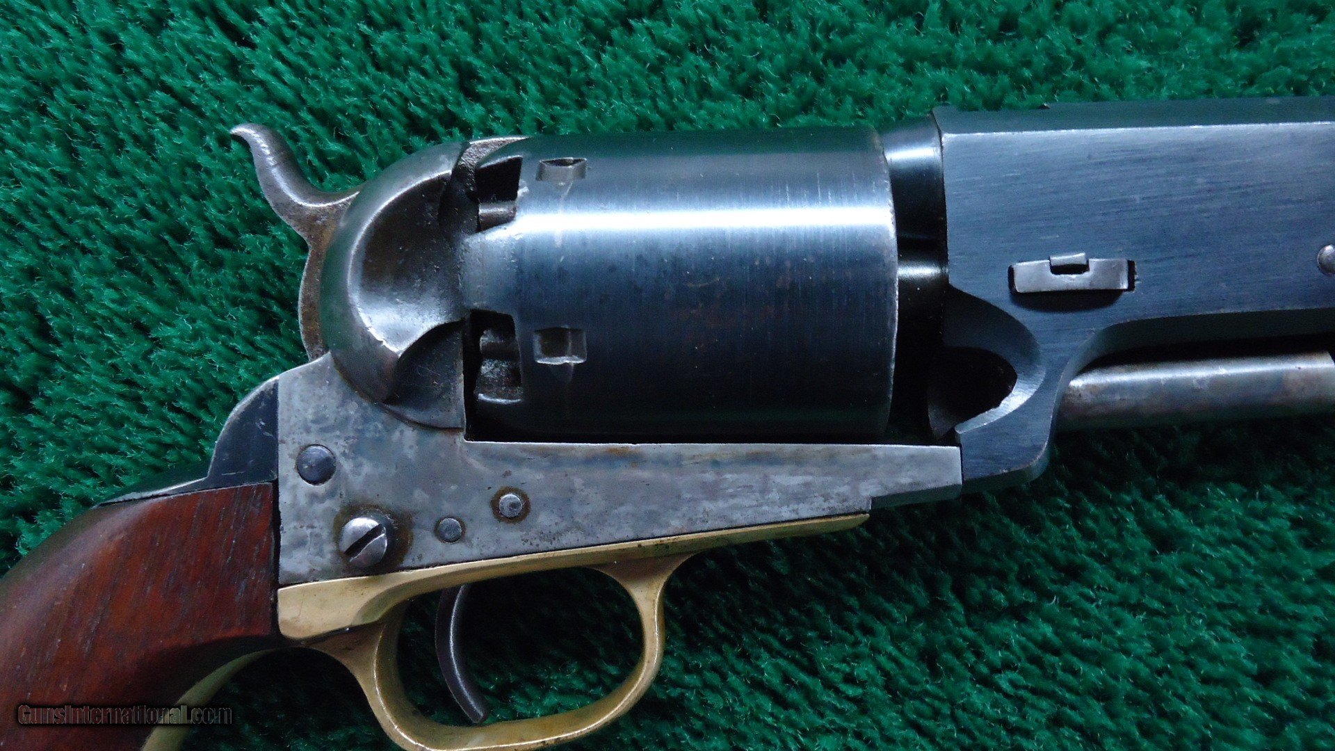 Description: 6 Shot Percussion Revolver with 7-1/2 inch round and part octagon barrel chambered in 44 caliber. This has the extra pin and the cut-away at the back of the frame for the shoulder stock. Overall gun has been cleaned and re-finished a long time ago. Looks good with most of the re-finish blue remaining. Frame has case colors with a brass trigger guard. Nice functioning action. Cylinder serial number is fairly light but the rest are visible and in the 16k range. Barrel wedge is most likely a replacement. Blade front sight. Rear sight is missing. Grips could be replacements. I'm not sure. This is a good looking gun. These were made from 1851-1861. Leroy Merz Antique Firearms specializes in antique and vintage Winchesters and other fine American firearms. Since 1965 Mr. Merz has taken part in the world of firearms and has been a contributor to many well known reference books. We have hundreds of additional guns in every price range at our home online. Search for Merz Antiques in google. SOLD Antique: Yes Handgun Caliber: .44 |