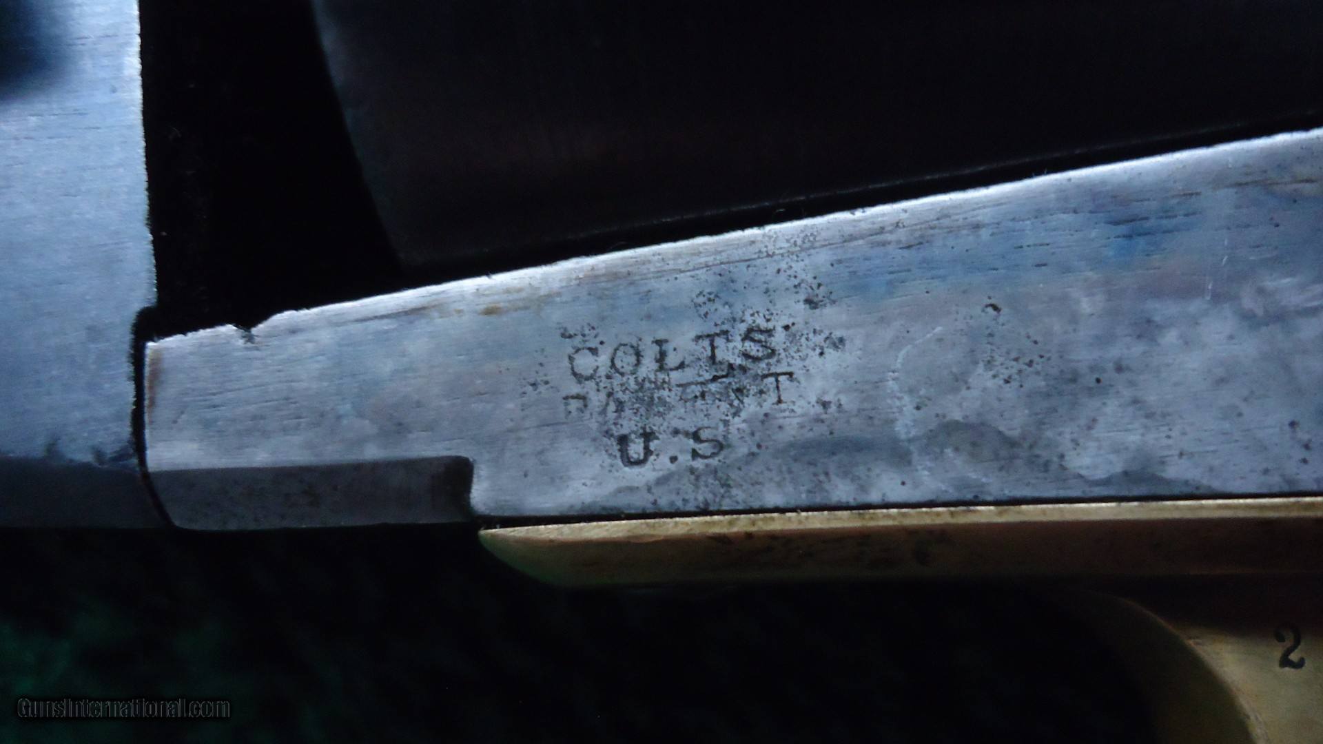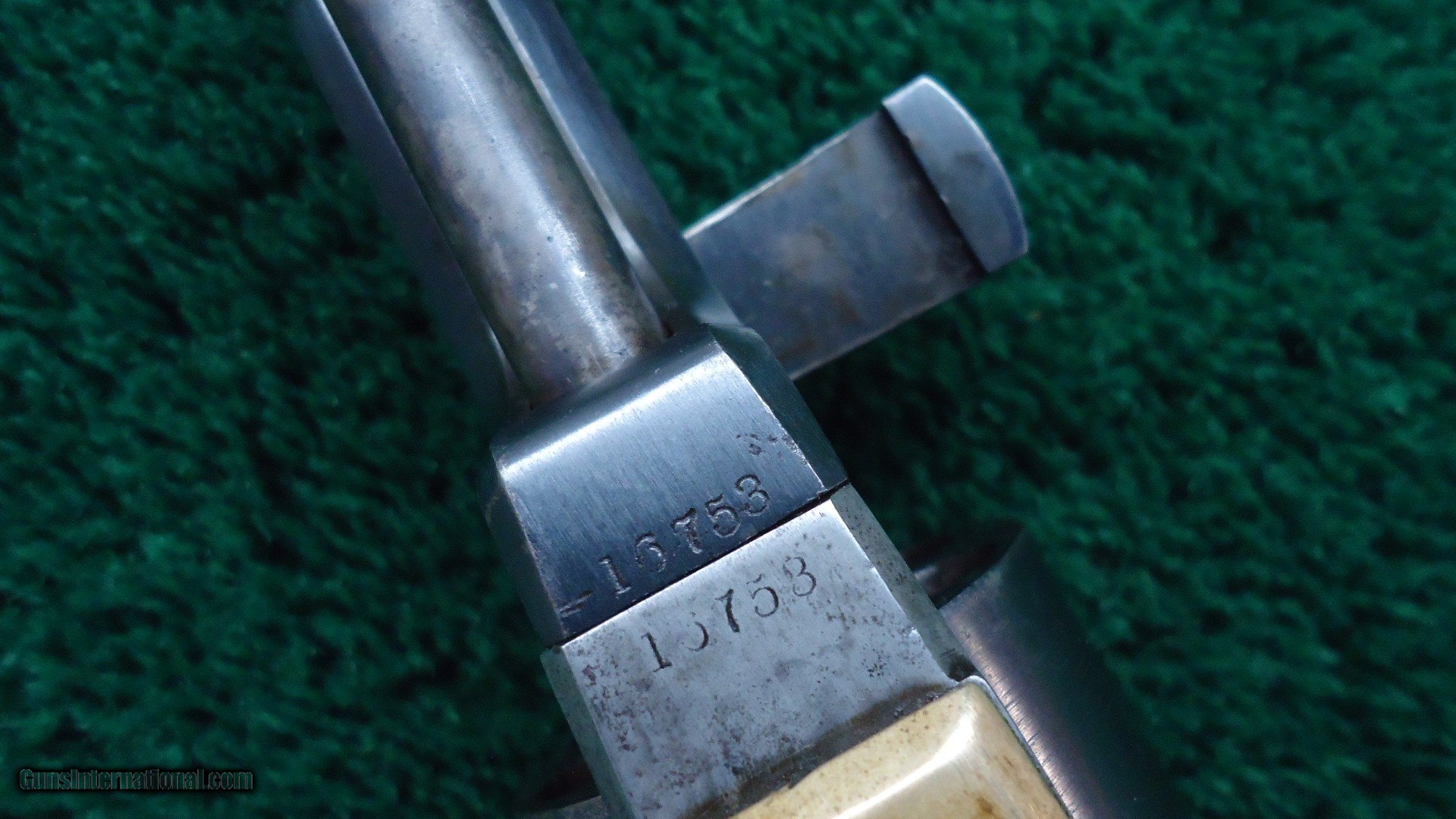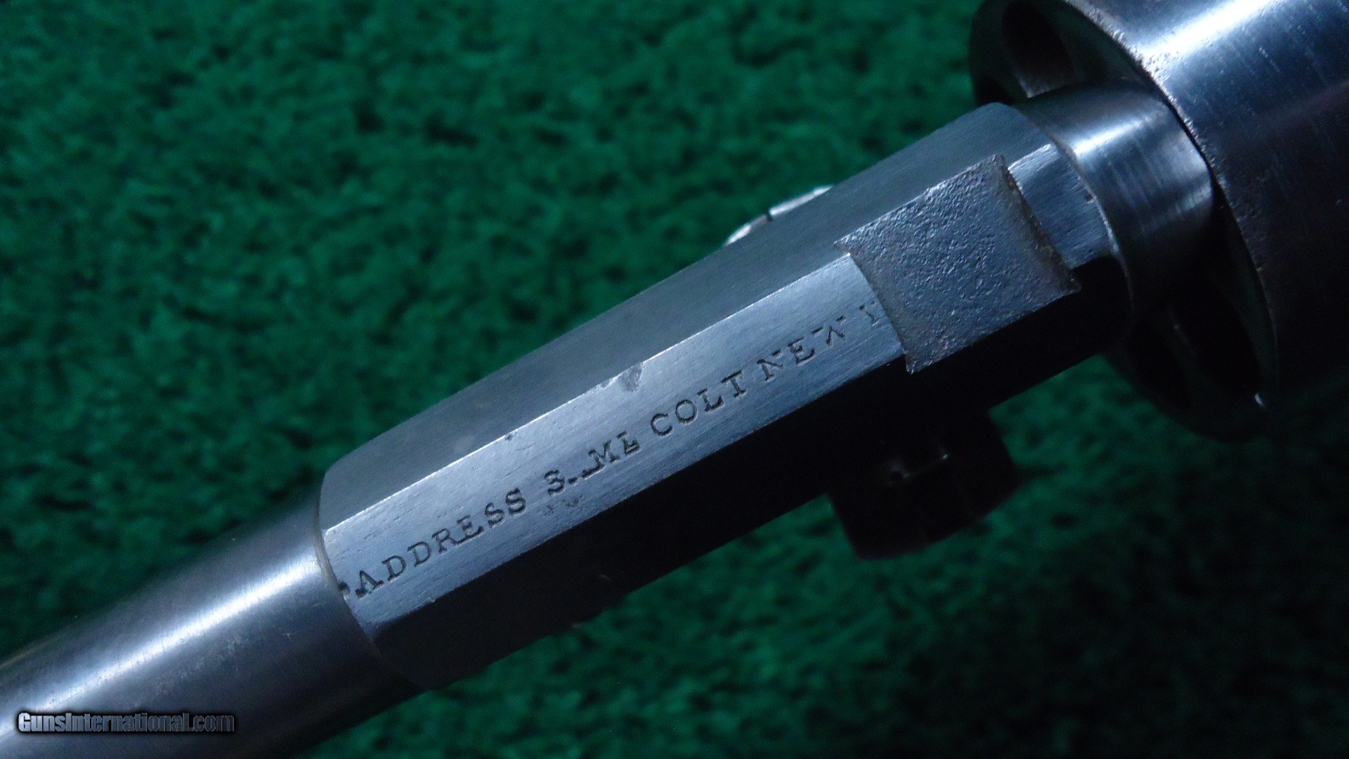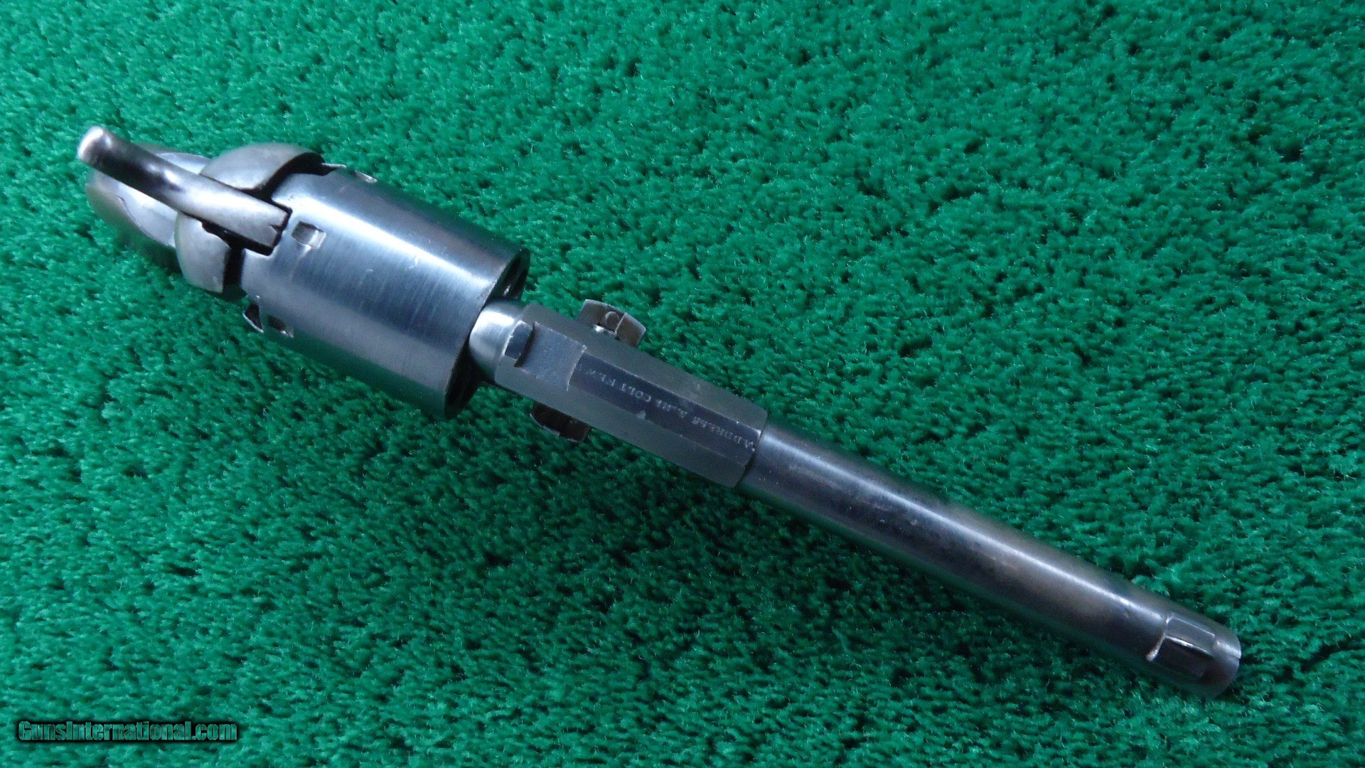 Description: 6 Shot Percussion Revolver with 7-1/2 inch round and part octagon barrel chambered in 44 caliber. This has the extra pin and the cut-away at the back of the frame for the shoulder stock. Overall gun has been cleaned and re-finished a long time ago. Looks good with most of the re-finish blue remaining. Frame has case colors with a brass trigger guard. Nice functioning action. Cylinder serial number is fairly light but the rest are visible and in the 16k range. Barrel wedge is most likely a replacement. Blade front sight. Rear sight is missing. Grips could be replacements. I'm not sure. This is a good looking gun. These were made from 1851-1861. Leroy Merz Antique Firearms specializes in antique and vintage Winchesters and other fine American firearms. Since 1965 Mr. Merz has taken part in the world of firearms and has been a contributor to many well known reference books. We have hundreds of additional guns in every price range at our home online. Search for Merz Antiques in google. SOLD Antique: Yes Handgun Caliber: .44 |