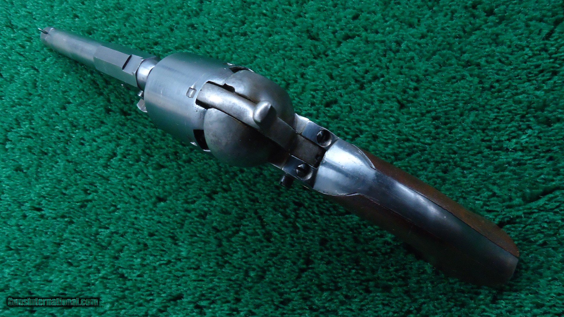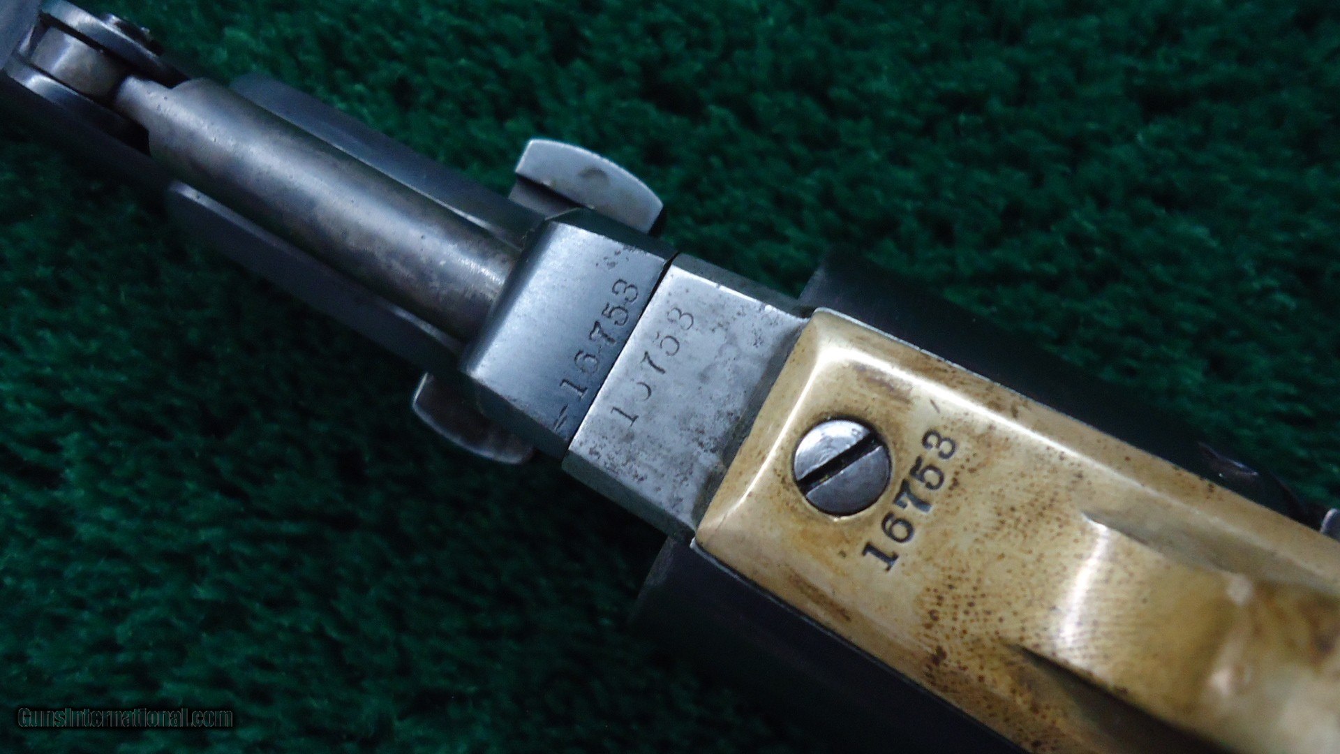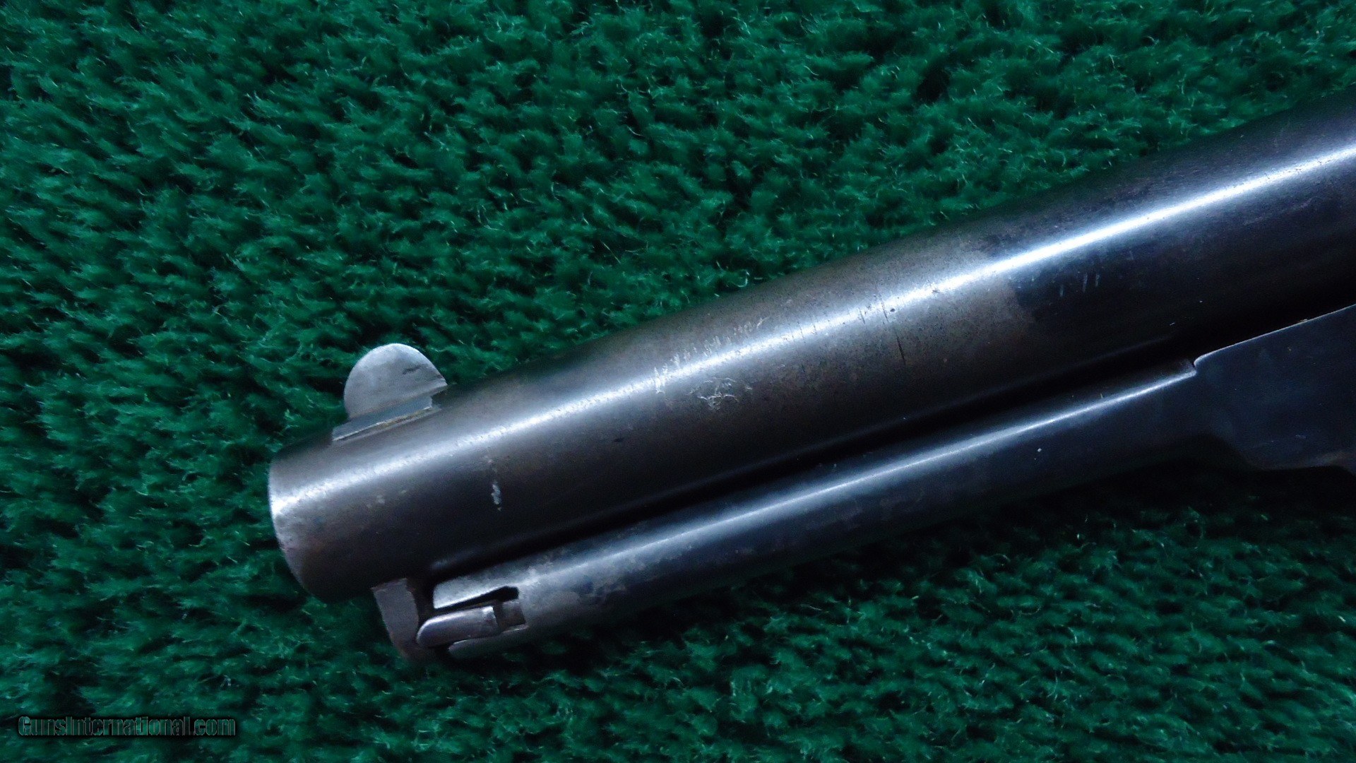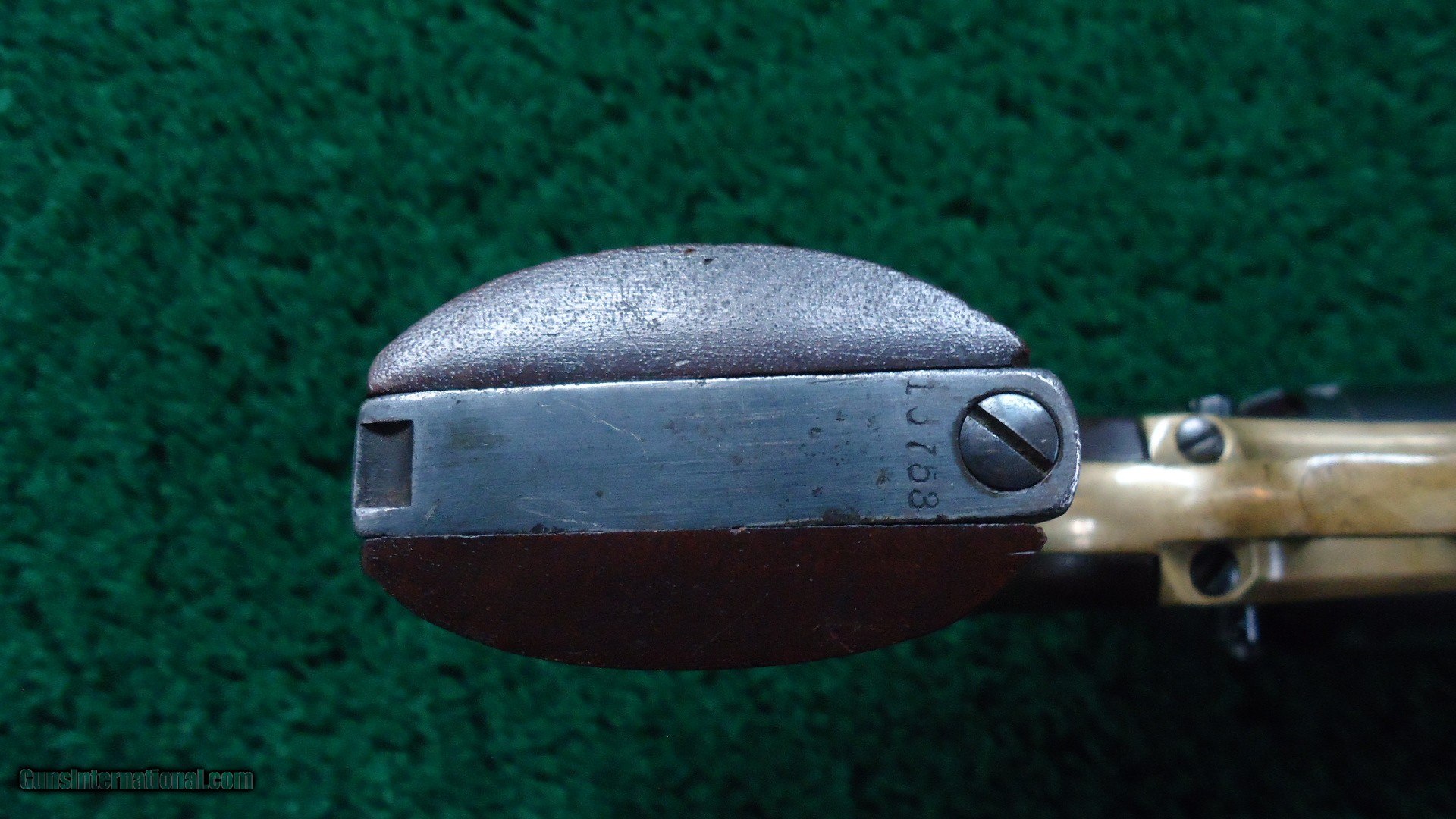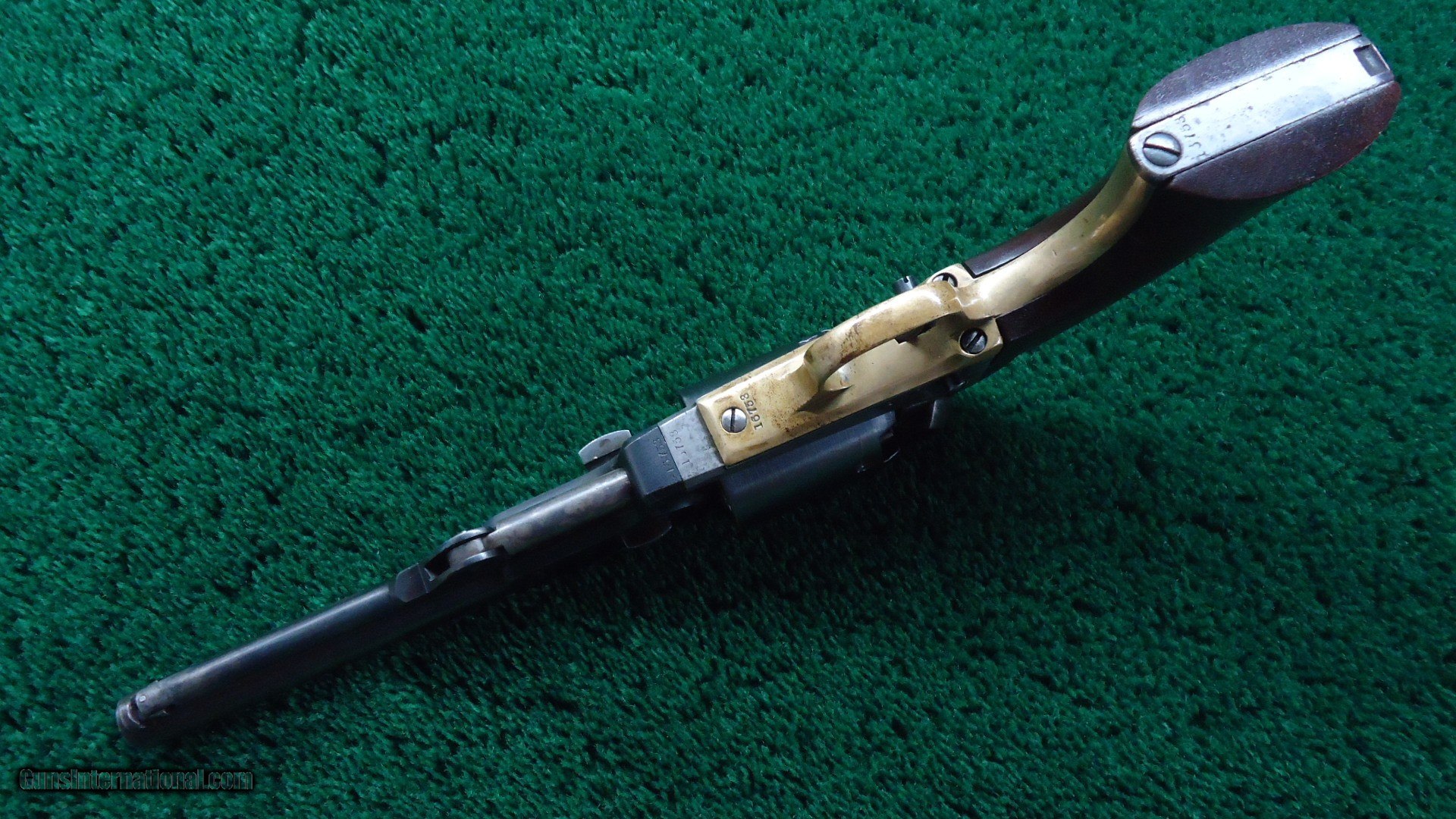 Description: 6 Shot Percussion Revolver with 7-1/2 inch round and part octagon barrel chambered in 44 caliber. This has the extra pin and the cut-away at the back of the frame for the shoulder stock. Overall gun has been cleaned and re-finished a long time ago. Looks good with most of the re-finish blue remaining. Frame has case colors with a brass trigger guard. Nice functioning action. Cylinder serial number is fairly light but the rest are visible and in the 16k range. Barrel wedge is most likely a replacement. Blade front sight. Rear sight is missing. Grips could be replacements. I'm not sure. This is a good looking gun. These were made from 1851-1861. Leroy Merz Antique Firearms specializes in antique and vintage Winchesters and other fine American firearms. Since 1965 Mr. Merz has taken part in the world of firearms and has been a contributor to many well known reference books. We have hundreds of additional guns in every price range at our home online. Search for Merz Antiques in google. SOLD Antique: Yes Handgun Caliber: .44 |