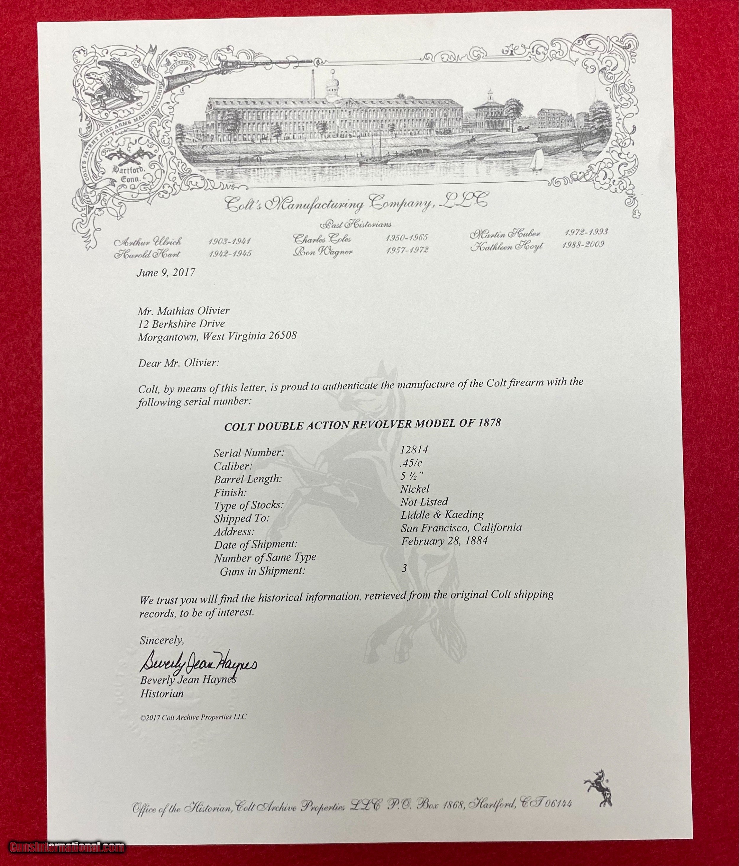 Description: Antique Colt 1878 Frontier DA .45 with Nickel Finish and a 5 1/2" barrel. Accompanied with a Colt letter and manufactured in 1884. All matching numbers. Very nicely restored Colt. Action functions well but cylinder does have a slight play when locked up. Rare collectible and would look good in any collection. Sharp early DA Colt revolver. $50.00 insured shipping anywhere within the USA. SOLD Antique: Yes Handgun Caliber: .45 Colt Manufacturer: Colt Model: 1878 Serial Number: 12814 Barrel Length: 5 1/2” Chambers: Six Condition: Excellent Metal Condition: Excellent Bore Condition: Very good Action: DA Finish: Nickel Sights: Fixed Manufacture Date: 1884 Extras: Colt Letter Item Location: WV |