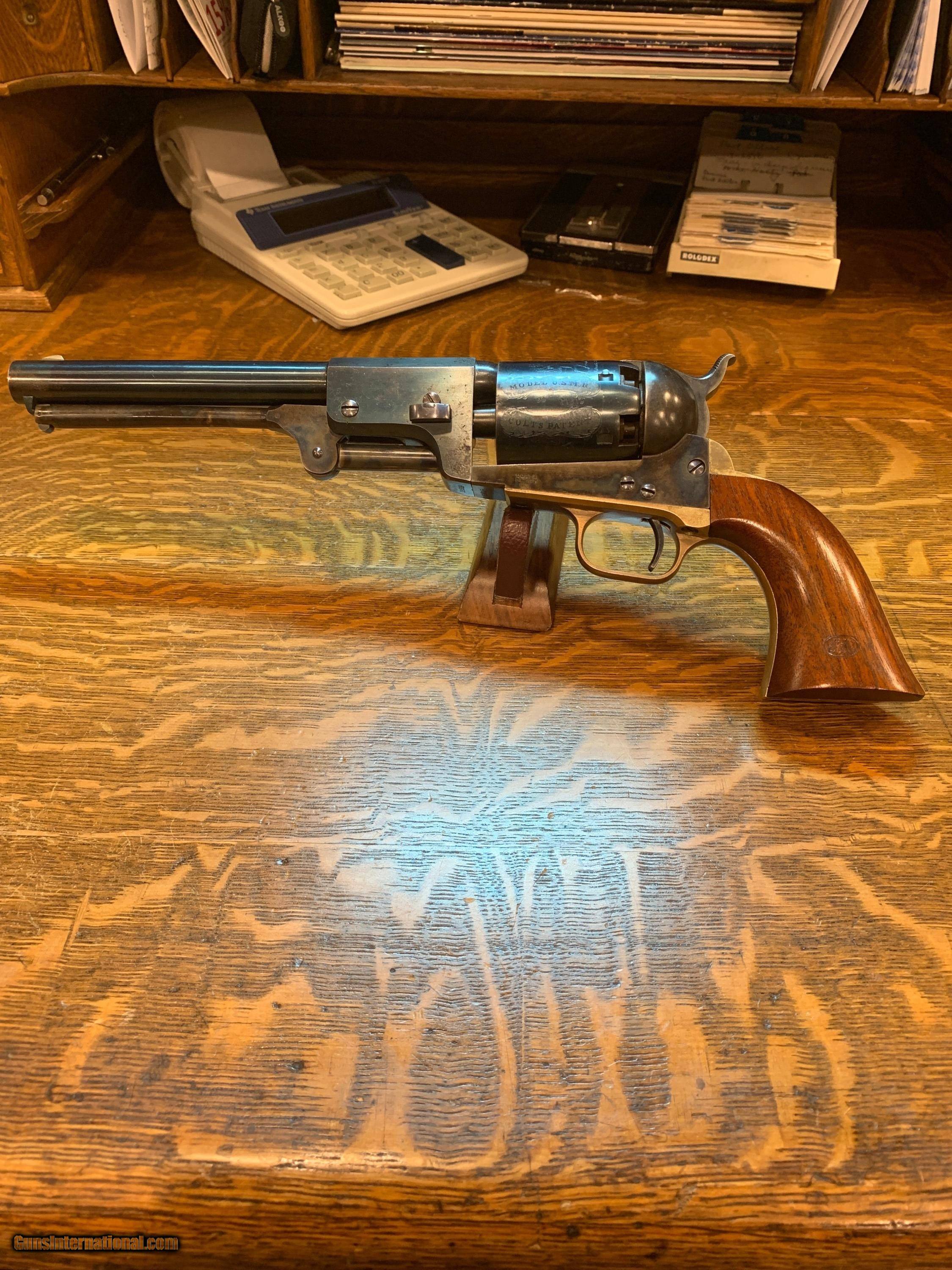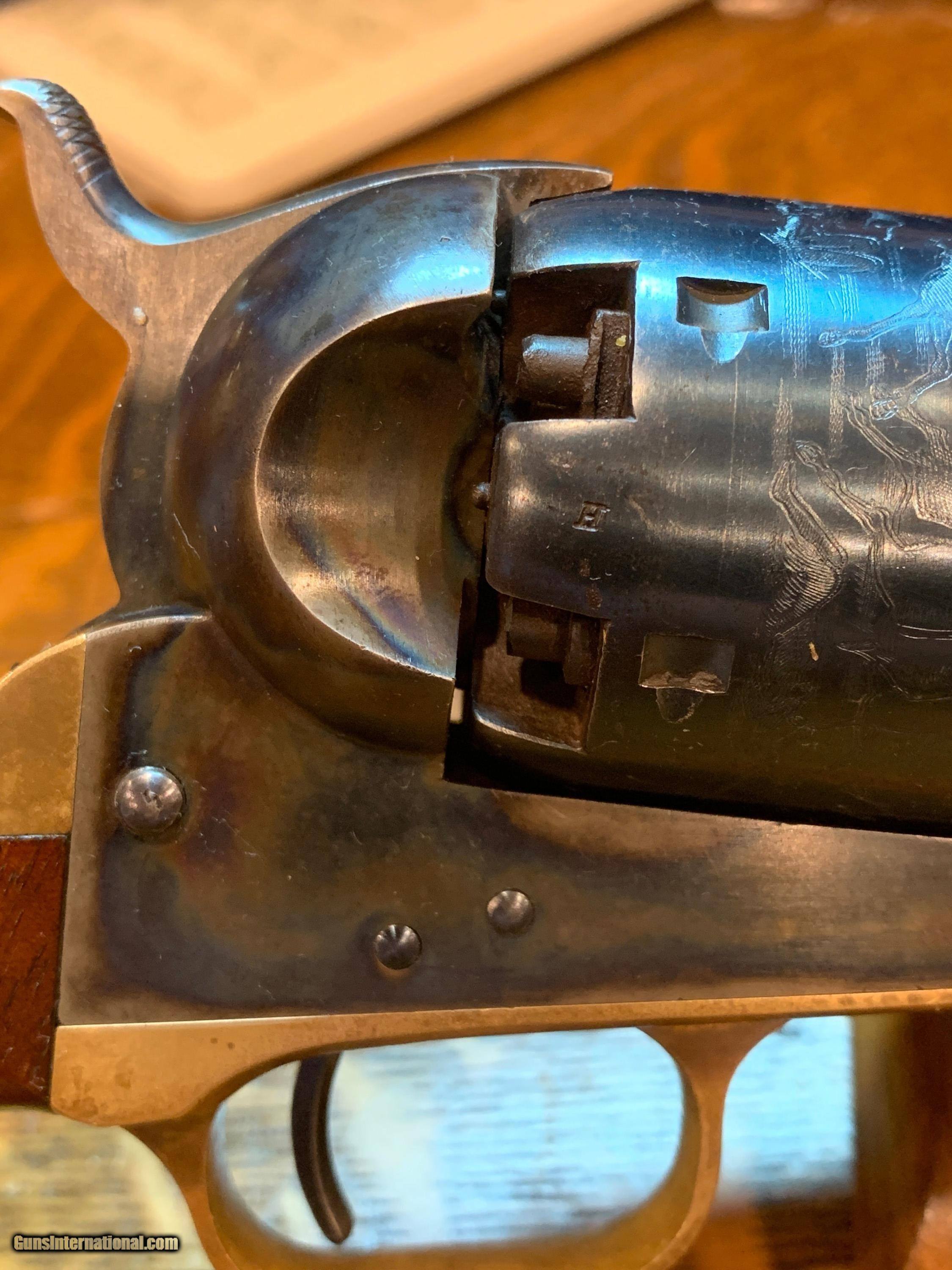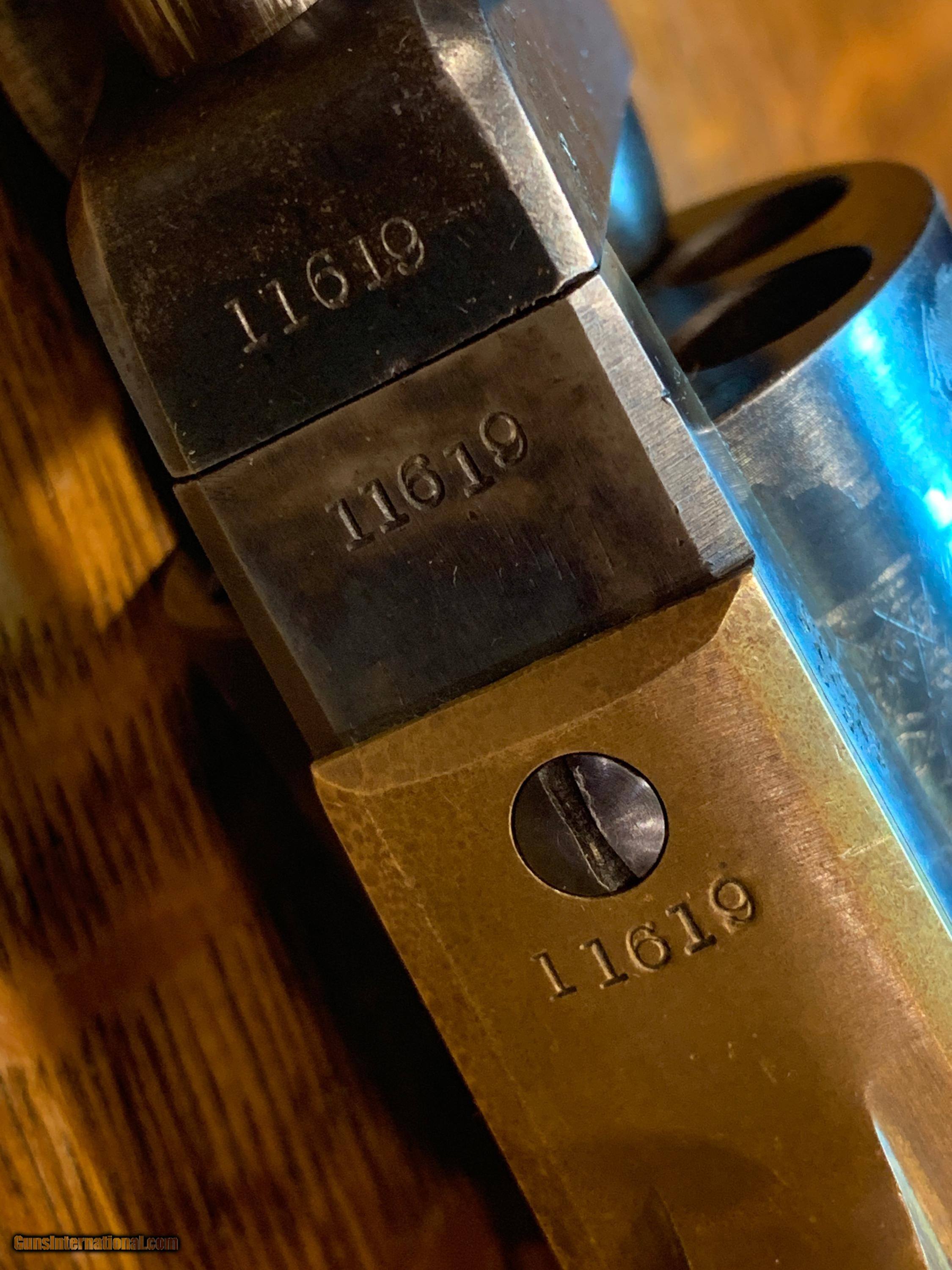 Description: COLT 1848 THIRD MODEL MARTIAL DRAGOON. SERIAL NO.11619. PRODUCED IN 1851.THIS EXQUISITE EXAMPLE HAS BEEN EXPERTLY RESTORED BY TOM HAAS SR. YEARS AGO. IT WAS IN THE FAMOUS COLLECTION OF EDWARD SCOTT MEADOWS, AUTHOR OF MANY PUBLICATIONS IN THE U.S.MILITARY PISTOL COLLECTING AND RESEARCH HOBBY. THE BLUEING IS JUST LIKE COLT DID. CASECOLORS THE SAME. ALL CORRECT MILITARY SMALL INSPECTION MARKS AND CARTOUCHES ARE PRESENT. CYLINDER SCENE IS PERFECT. ALL NUMBERS MATCH. GRIPS HAVE SOME RAISED GRAIN AND ARE GORGEOUS. ACTION IS TIGHT. BORE HAS GREAT RIFLING WITH SOME DARKNESS. THIS COLT DRAGOON HAD TO BE IN EXCELLENT CONDITION BEFORE TOM HAAS SELECTED IT FOR A WORLD CLASS RESTORATION. IT DOES HAVE A FEW TINY AREAS OF PATINA AFTER THE RESTORATION THAT ADDS TO THE BEAUTY OF IT. THEY DON'T EXIST ANY BETTER! AN ORIGINAL CONDITION EXAMPLE, IN THIS CONDITION (IF ONE EXISTS), WOULD BE $200-300 THOUSAND DOLLARS. A GREAT DRAGOON FOR YOUR COLLECTION. PLEASE CALL 973-214-3407 WITH QUESTIONS. THANKYOU SOLD Antique: Yes |