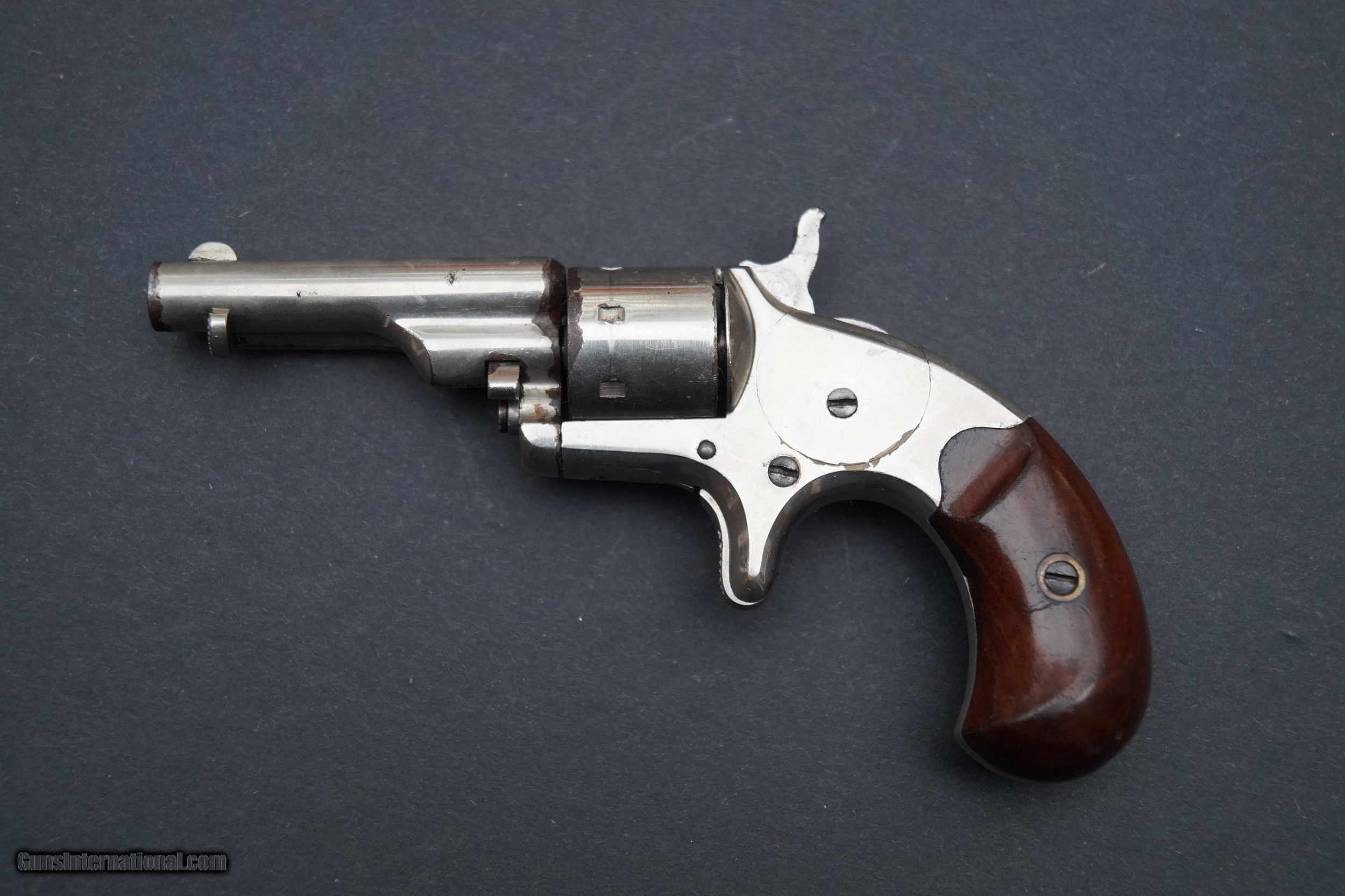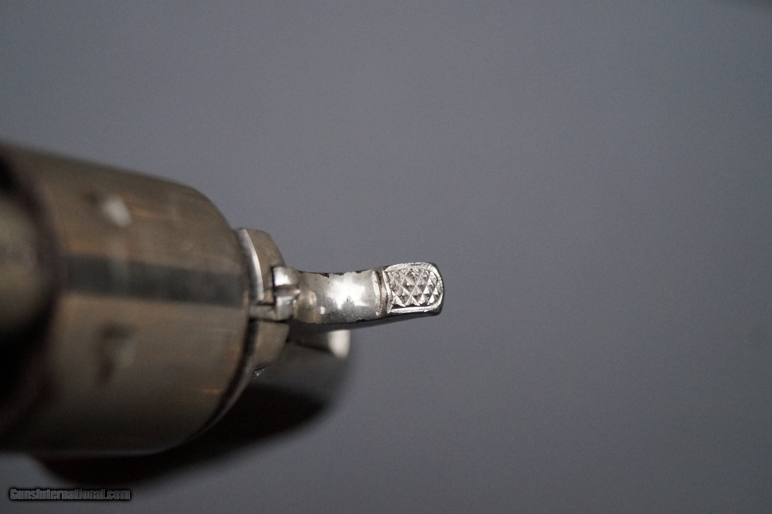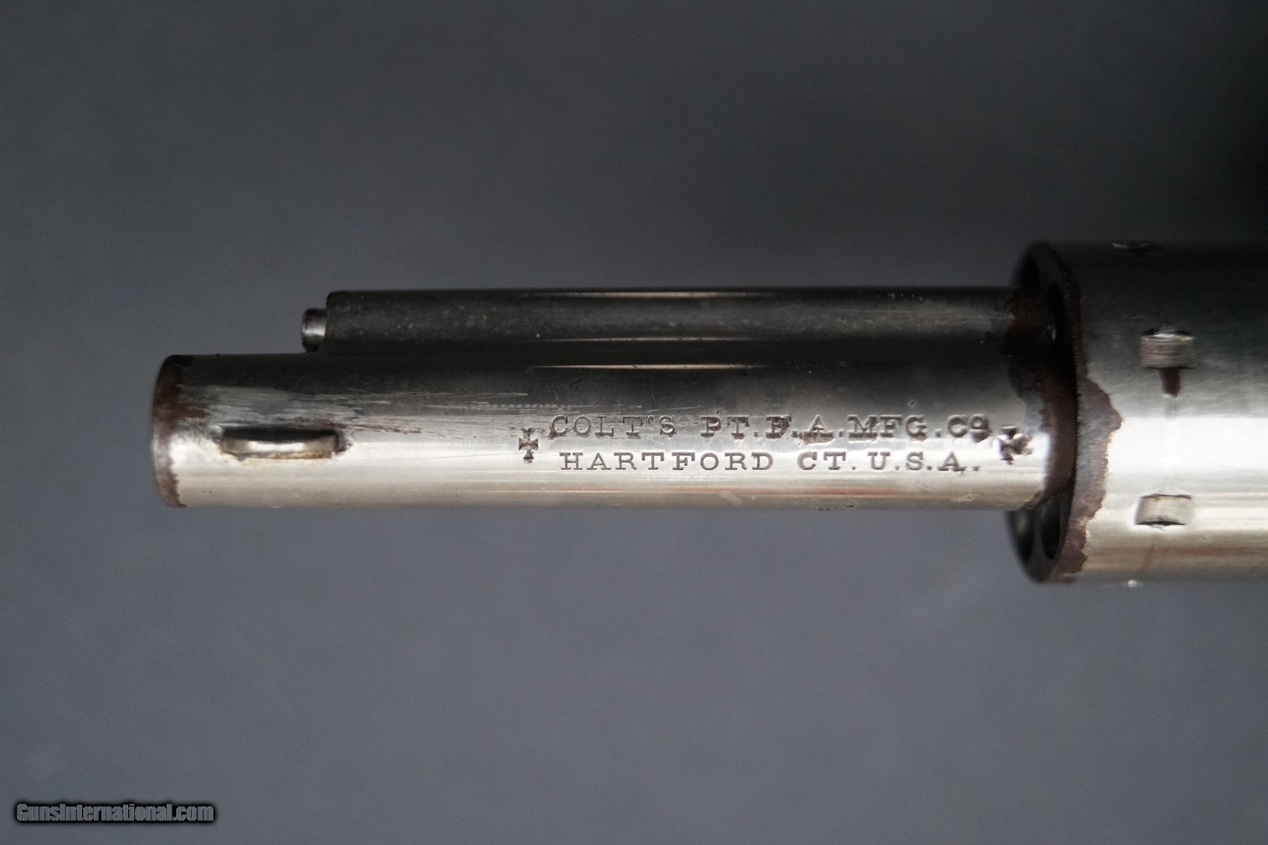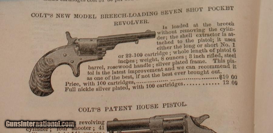 Description: Colt Model 1871 Open Top Rare very early Colt Model 1871 Open Top Revolver in .22 caliber with integral ejector housing on the barrel and first style high spur hammer, seven-shot cylinder. This one has the 2 3/8" Barrel instead of the 2 7/8" which I believe is the scarcer of the two factory lengths. Nickel plated with varnished walnut grips. This revolver cost $12.00 with nickel full nickel plated finish compared to $10 for blue/bare brass frame back in the early 1870's. That was A LOT of Money back then! This was Colt's First .22 Caliber Cartridge Revolver that went into production as soon as the Smith and Wesson controlled Rollin White Patent expired in 1871. Rollin White nearly had his patent extended via Congress but President Grant refused to sign off on it. The result was that every manufacturer of revolvers was now finally in the cartridge gun business. Being a 7 shooter, the Open Top was obviously meant to go up against the Smith and Wesson Model One, 1st, 2nd, and 3rd Issue Tip Up Revolvers. As the Smith and Wessons had static ejector rods mounted underneath their barrels to shove out spent casings, Colt decided to one up their competition with a side mounted ejector rod assembly so the cylinder could be unloaded without having to be removed. Just a few thousand of these early ones were built before Colt almost certainly had to cut production costs. as rather than S&W, Colt's real competition was a tidal wave of more cheaply made pocket revolvers by other New England competitors such as Hopkins and Allen and Forehand and Wadsworth. To cut down on mfg costs, Colt eliminated the ejector housing and rod with its hand checkered thumbpiece. The housing was actually formed integrally to the barrel wall . As collectors, we tend to overlook the Open Top in favor of later models with improvements but historically, this Model was one of the very first cartridge revolvers offered by Colt M'fg in 1871 following the Rollin White patent restriction for bored through cylinders.. J.H. Johnston of the Great Western Gunworks had this to say about this new Colt in its 1873 mail order catalog (See photo): COLT'S NEW MODEL BREECH-LOADING SEVEN SHOT POCKET REVOLVER Is loaded at the breech without removing the cylinder; the shell extractor is attached to the pistol; it uses either the long or short No.1 or 22-100 cartridge; whole length of pistol 6 inches; weight, 8 ounces; 3 inch rifled, steel barrel, rosewood handle; silver plated frame. This pistol is the latest improvement and we can recommend it as one of the best, if not the best ever brought out. Price, with 100 cartridges,......................................$10.00 Full nickel plated, with 100 cartridges........................12.00 This particular revolver is in the 2400 serial range which dates it to first year production.Overall Condition grades to NRA Antique Excellent with 94% Original nickel remaining with a little flaking around the muzzle, front of cylinder, a just a hint of brass peaking through the nickel around the edge of the left side plate. Gripstraps still have all of their original nickel. High hump hammer has nearly all its original nickel with excellent checkering. Very Good screws and pins throughout. Original grips are Excellent Overall, 95% original varnish no chips, cracks, or repairs. For a .22 Cal from the 19th century, it has a surprisingly Good bore. Usually, they're pretty rough but this one has all the rifling intact, not dark, no major pits. Colt New Line Deringer Smith Wesson No 1 1st 2nd 3rd Issue, Remington Smoot, Aetna Merwin Hulbert James Reid Gambler Lady's Purse Gun Whitney Harrington Richardson Hopkins Allen Bacon Manhattan. Antique Pre-1898. No FFL Required under Federal Law. No sales to NY, NJ, Chicago, DC, HI. Buyer must be 21 years old and legal to purchase a firearm. Shipping determined by Zip Code. No International sales. SOLD Antique: Yes Handgun Caliber: .22 Short Manufacturer: Colt Model: 1871 Caliber Info: 22 Condition: Excellent Finish: Nickel Plated Manufacture Date: 1871 |