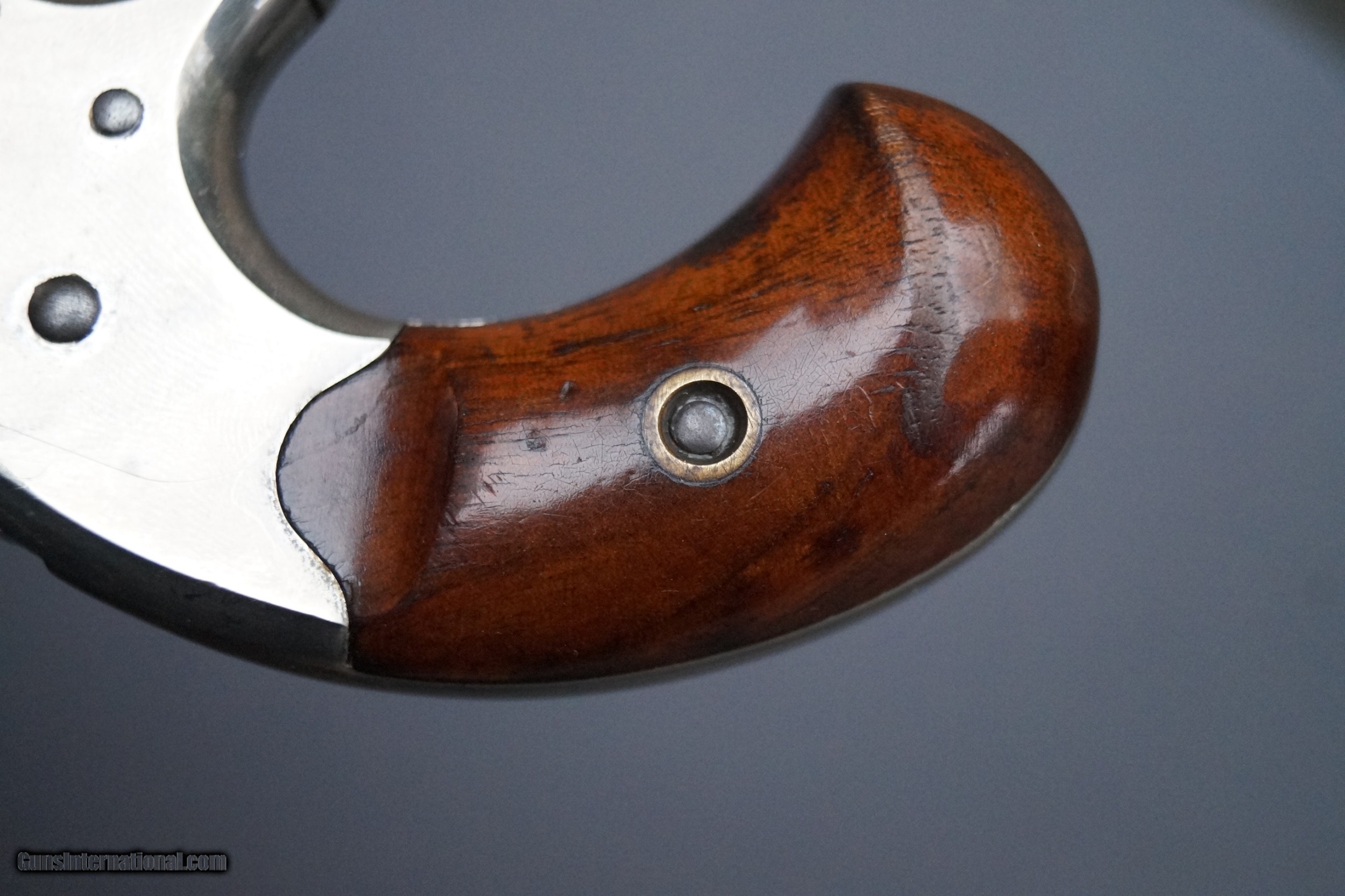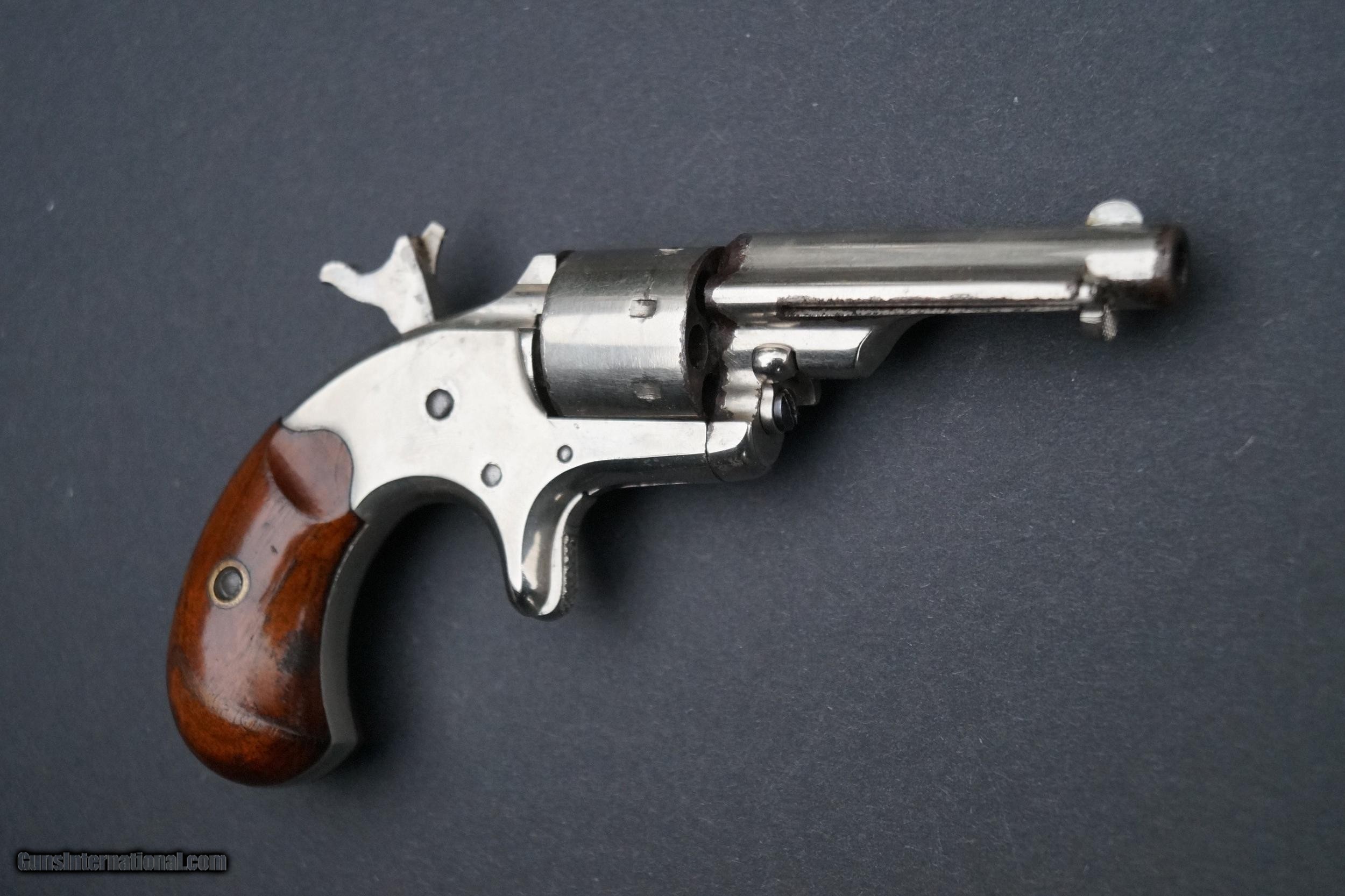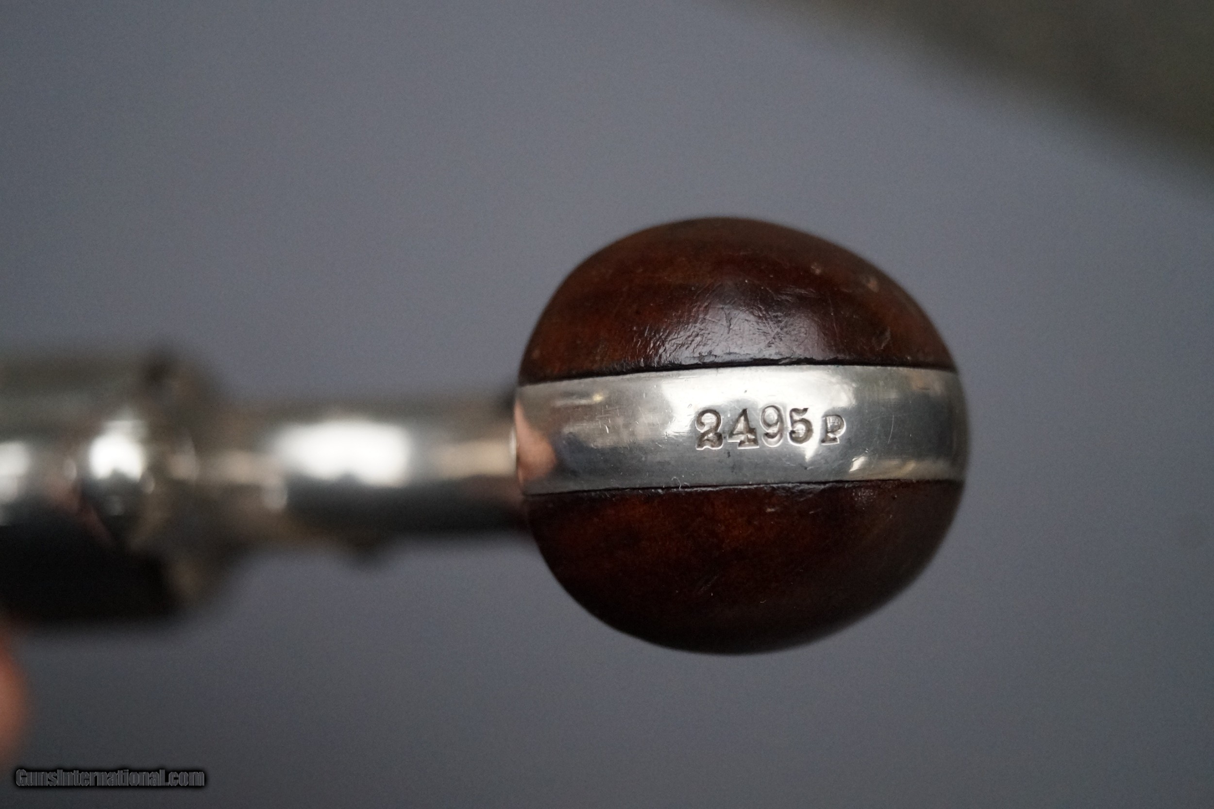 Description: Colt Model 1871 Open Top Rare very early Colt Model 1871 Open Top Revolver in .22 caliber with integral ejector housing on the barrel and first style high spur hammer, seven-shot cylinder. This one has the 2 3/8" Barrel instead of the 2 7/8" which I believe is the scarcer of the two factory lengths. Nickel plated with varnished walnut grips. This revolver cost $12.00 with nickel full nickel plated finish compared to $10 for blue/bare brass frame back in the early 1870's. That was A LOT of Money back then! This was Colt's First .22 Caliber Cartridge Revolver that went into production as soon as the Smith and Wesson controlled Rollin White Patent expired in 1871. Rollin White nearly had his patent extended via Congress but President Grant refused to sign off on it. The result was that every manufacturer of revolvers was now finally in the cartridge gun business. Being a 7 shooter, the Open Top was obviously meant to go up against the Smith and Wesson Model One, 1st, 2nd, and 3rd Issue Tip Up Revolvers. As the Smith and Wessons had static ejector rods mounted underneath their barrels to shove out spent casings, Colt decided to one up their competition with a side mounted ejector rod assembly so the cylinder could be unloaded without having to be removed. Just a few thousand of these early ones were built before Colt almost certainly had to cut production costs. as rather than S&W, Colt's real competition was a tidal wave of more cheaply made pocket revolvers by other New England competitors such as Hopkins and Allen and Forehand and Wadsworth. To cut down on mfg costs, Colt eliminated the ejector housing and rod with its hand checkered thumbpiece. The housing was actually formed integrally to the barrel wall . As collectors, we tend to overlook the Open Top in favor of later models with improvements but historically, this Model was one of the very first cartridge revolvers offered by Colt M'fg in 1871 following the Rollin White patent restriction for bored through cylinders.. J.H. Johnston of the Great Western Gunworks had this to say about this new Colt in its 1873 mail order catalog (See photo): COLT'S NEW MODEL BREECH-LOADING SEVEN SHOT POCKET REVOLVER Is loaded at the breech without removing the cylinder; the shell extractor is attached to the pistol; it uses either the long or short No.1 or 22-100 cartridge; whole length of pistol 6 inches; weight, 8 ounces; 3 inch rifled, steel barrel, rosewood handle; silver plated frame. This pistol is the latest improvement and we can recommend it as one of the best, if not the best ever brought out. Price, with 100 cartridges,......................................$10.00 Full nickel plated, with 100 cartridges........................12.00 This particular revolver is in the 2400 serial range which dates it to first year production.Overall Condition grades to NRA Antique Excellent with 94% Original nickel remaining with a little flaking around the muzzle, front of cylinder, a just a hint of brass peaking through the nickel around the edge of the left side plate. Gripstraps still have all of their original nickel. High hump hammer has nearly all its original nickel with excellent checkering. Very Good screws and pins throughout. Original grips are Excellent Overall, 95% original varnish no chips, cracks, or repairs. For a .22 Cal from the 19th century, it has a surprisingly Good bore. Usually, they're pretty rough but this one has all the rifling intact, not dark, no major pits. Colt New Line Deringer Smith Wesson No 1 1st 2nd 3rd Issue, Remington Smoot, Aetna Merwin Hulbert James Reid Gambler Lady's Purse Gun Whitney Harrington Richardson Hopkins Allen Bacon Manhattan. Antique Pre-1898. No FFL Required under Federal Law. No sales to NY, NJ, Chicago, DC, HI. Buyer must be 21 years old and legal to purchase a firearm. Shipping determined by Zip Code. No International sales. SOLD Antique: Yes Handgun Caliber: .22 Short Manufacturer: Colt Model: 1871 Caliber Info: 22 Condition: Excellent Finish: Nickel Plated Manufacture Date: 1871 |
