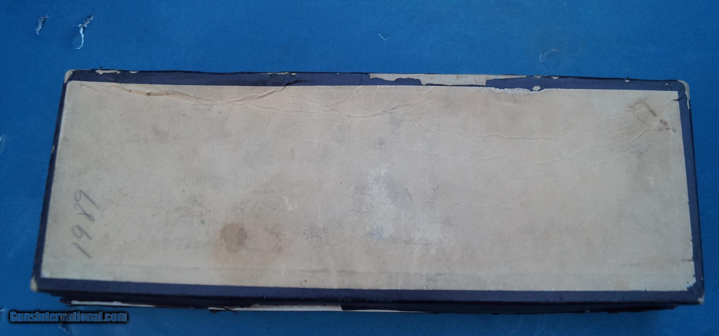 Description: This an Antique Colt Model 1895 Double Action New Army Revolver with 6" Barrel, Blued Finish, and Checkered Dark Brown Gutta Percha Hard Rubber Grips. It doesn't appear to have ever been fired as it has no rings around the chambers on the front of the cylinder or any recoil wear on the recoil shield or around the firing pin bushing. The action is super tight and the cylinder swings out stifly like its brand new. The bore in MINT! Unfortunately, this revolver was not stored as well as it could have been are there are some rust spots and some flaking in the blue. Frame has about 80% original blue while the barrel and cylinder have quite a bit more flaking with approximately 60% original blue remaining overall. Bright Colt Nitre blue is still on the screws, trigger and rear hammer profile. Grips are perfect with no chips, cracks, or wear to the checkering. It came to us in an original Colt Box which is in Fair Condition, missing some of the edges and end lable. It's a slightly later box as the inner labels indicate advertisements for Colt Automatic Pistols and the directions inside the lid mention the Colt Positive Lock Action...and this gun pre-dates that. I'd say the box is between 1905-1920 with the maroon color boxes being used from the late 1800's up to about 1920 when Colt went to Navy Blue colored boxes. Serial Number is in the 97,000 range which dates its production to the year 1898. Anything made before Jan. 1, 1899 qualifies as an Antique under the Federal Gun Control Act of 1968. State laws apply as well and this will require an FFL in NJ, NY, HI, Chicago, and any other State, City, or Locality that has restrictions. Buyer must be 21 years of age and a law-abiding citizen of the United States. All items are sold as Antique Collectibles Only. If you wish to fire an antique weapon, we strongly recommend you have it inspected by a competent licensed gunsmith and read up on proper loads as this was original designed for black powder, not smokeless used in modern ammunition. Shipping. 25.00 in Lower 48 States. Sorry, I do not export to foreign countries. All items come with a 3-Day Non-Firing Inspection Period. SOLD Antique: Yes Handgun Caliber: .38 Long Colt Manufacturer: Colt Model: 1895 New Army DA Barrel Length: 6 Manufacture Date: 1898 |