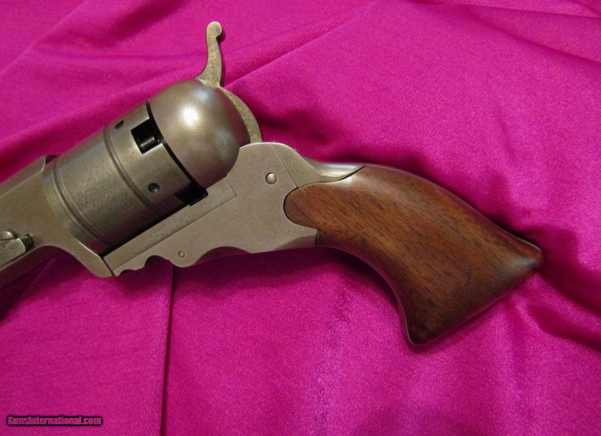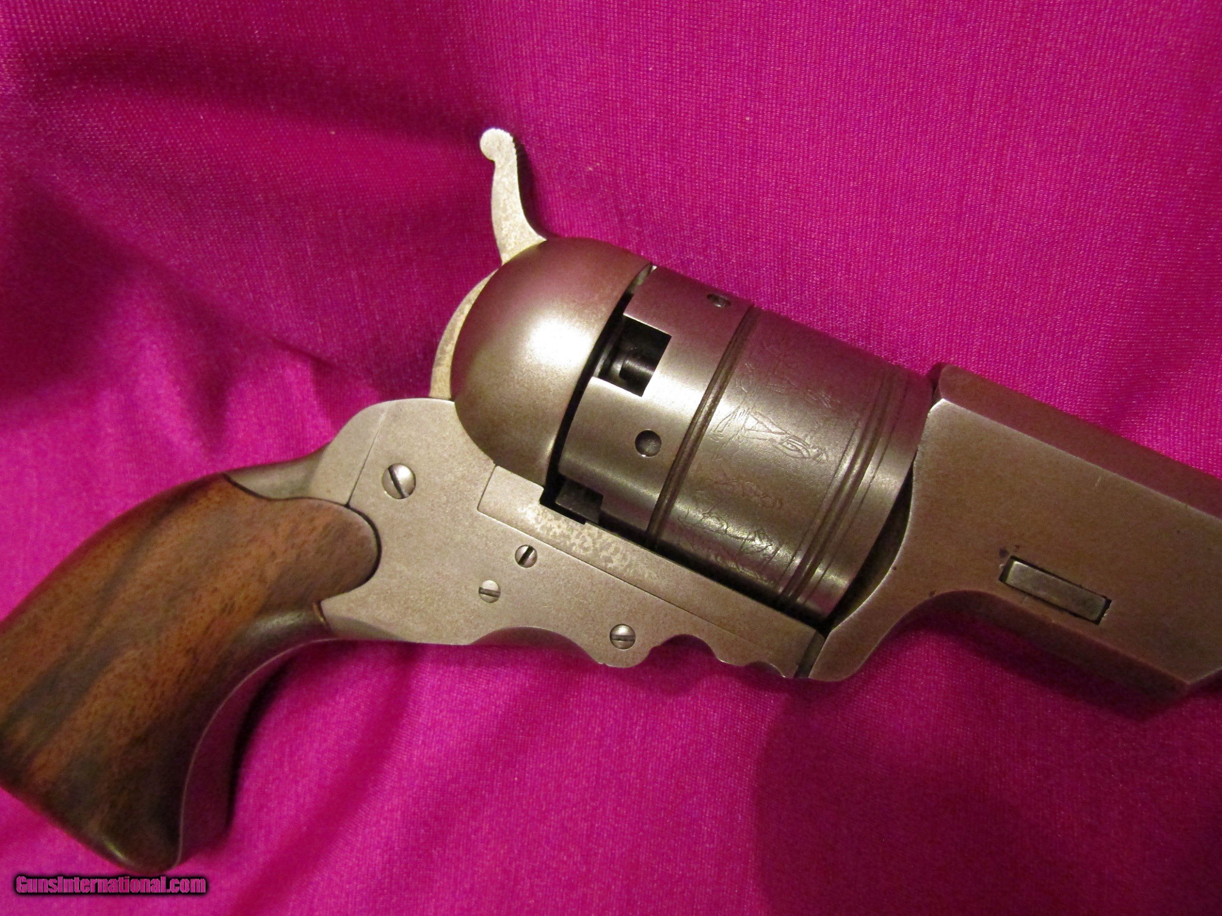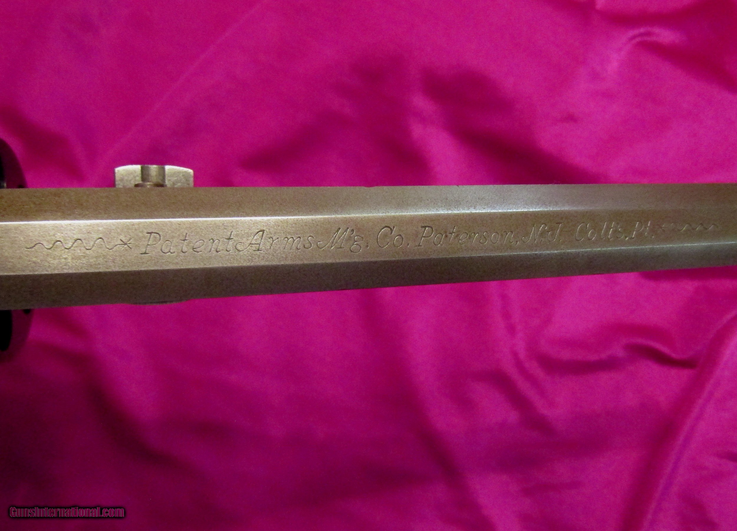 Description: Here is a Colt Paterson No. 5, also known as the Texas Paterson, with case and accoutrements. It is a 36 cal with a 5-shot cylinder and has a 7 1/2 inch barrel. This is one of the rarest prizes of the Colt collector with only 1000 being originally built. Because of the high demand, extreme rarity and high cost of an original, down through the years some beautiful and accurate copies have been made. This is one of those old and outstanding COPIES, built with a careful eye to detail. The cylinder has the correct roll just like an original. It also has the correct barrel address roll. The serial numbers are the correct size and style. And, like 90%+ of the originals, you cannot view the serial numbers without taking the pistol apart. The serial numbers on this gun are also placed in the correct places. I have pictured some of the serial numbers but there are also two serial numbers under the grips and one on the back of the barrel lug. The wood case is a high-grade antique walnut with an ebony key hole cover. The key locks and unlocks easily. It has a coffin style lid like all the Paterson cases had. The interior is blue velvet. The flask is marked on the bottom with an arched Colts Patent. The Texas Paterson has had the greatest appeal to Colt collectors due to its large size and its association with the Texas Rangers. This is the only cased Paterson copy with accoutrements that I have ever seen offered for sale. Rarely, you will see just a Paterson. Whoever built this cased Paterson and assembled the accoutrements spared no expense or detail and the result is spectacular. SALE PENDING SOLD Antique: Yes |