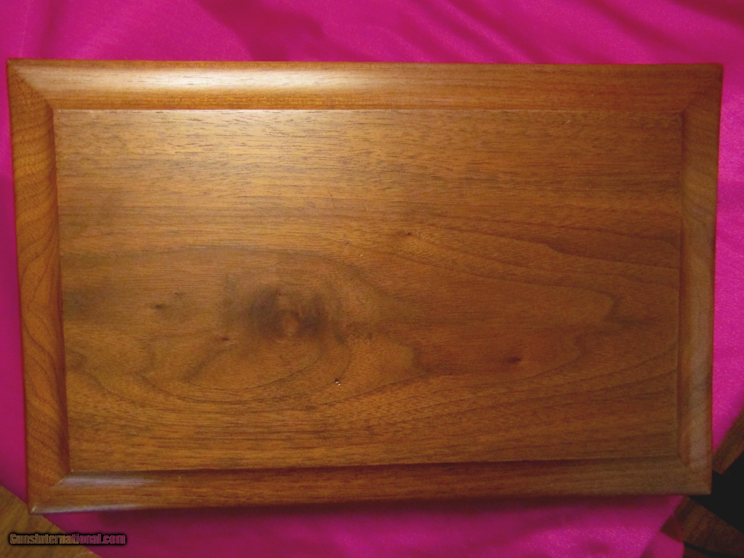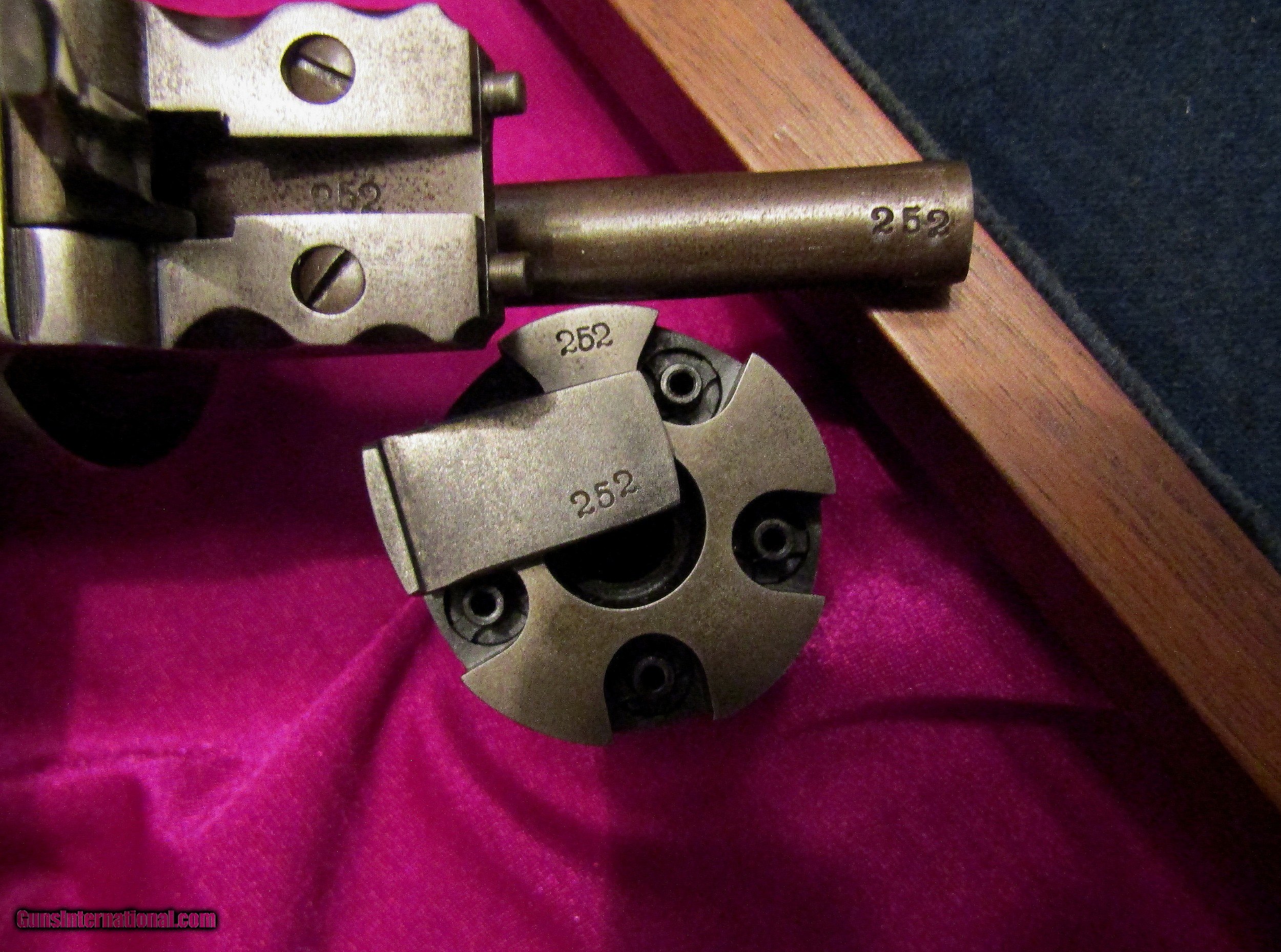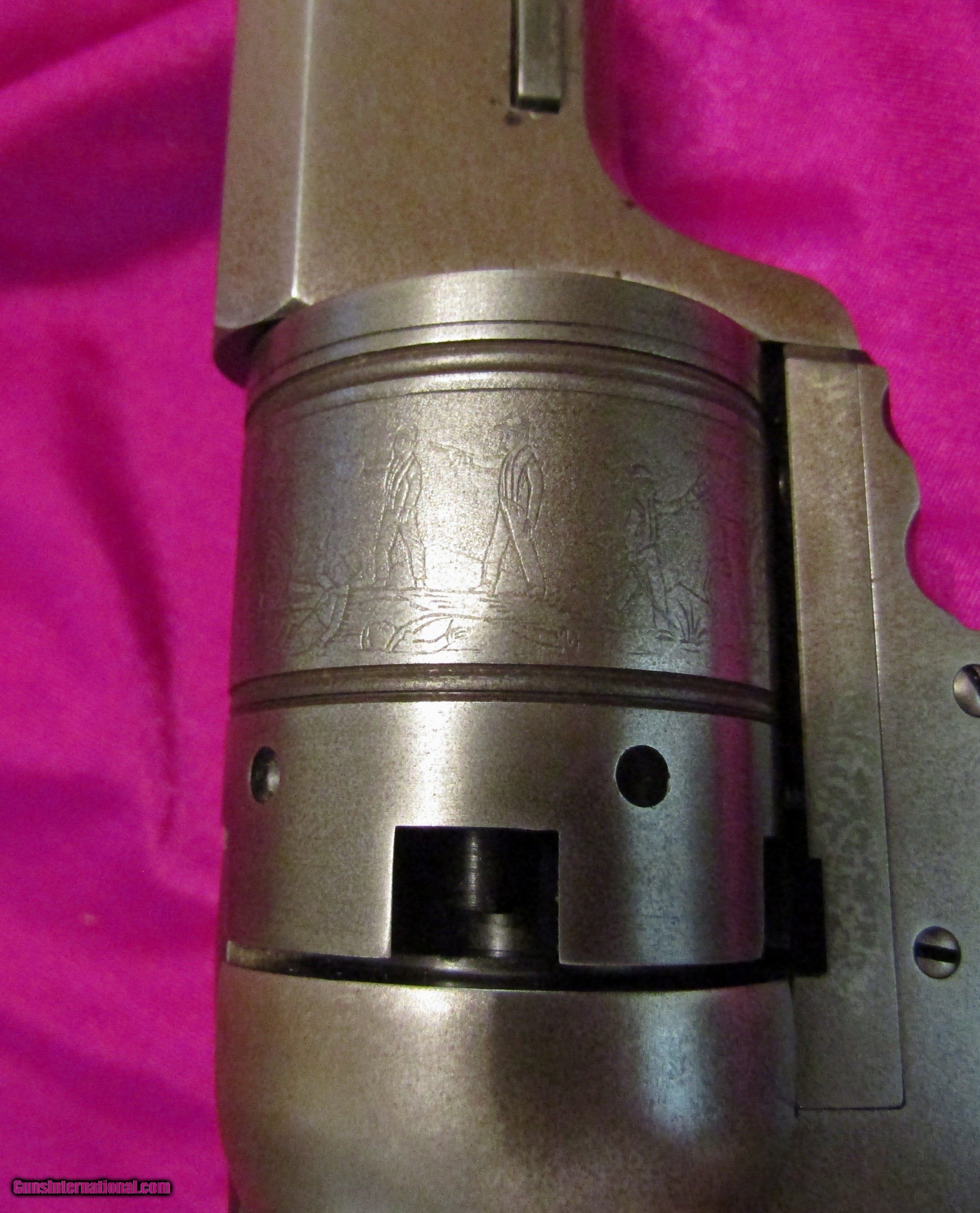 Description: Here is a Colt Paterson No. 5, also known as the Texas Paterson, with case and accoutrements. It is a 36 cal with a 5-shot cylinder and has a 7 1/2 inch barrel. This is one of the rarest prizes of the Colt collector with only 1000 being originally built. Because of the high demand, extreme rarity and high cost of an original, down through the years some beautiful and accurate copies have been made. This is one of those old and outstanding COPIES, built with a careful eye to detail. The cylinder has the correct roll just like an original. It also has the correct barrel address roll. The serial numbers are the correct size and style. And, like 90%+ of the originals, you cannot view the serial numbers without taking the pistol apart. The serial numbers on this gun are also placed in the correct places. I have pictured some of the serial numbers but there are also two serial numbers under the grips and one on the back of the barrel lug. The wood case is a high-grade antique walnut with an ebony key hole cover. The key locks and unlocks easily. It has a coffin style lid like all the Paterson cases had. The interior is blue velvet. The flask is marked on the bottom with an arched Colts Patent. The Texas Paterson has had the greatest appeal to Colt collectors due to its large size and its association with the Texas Rangers. This is the only cased Paterson copy with accoutrements that I have ever seen offered for sale. Rarely, you will see just a Paterson. Whoever built this cased Paterson and assembled the accoutrements spared no expense or detail and the result is spectacular. SALE PENDING SOLD Antique: Yes |
