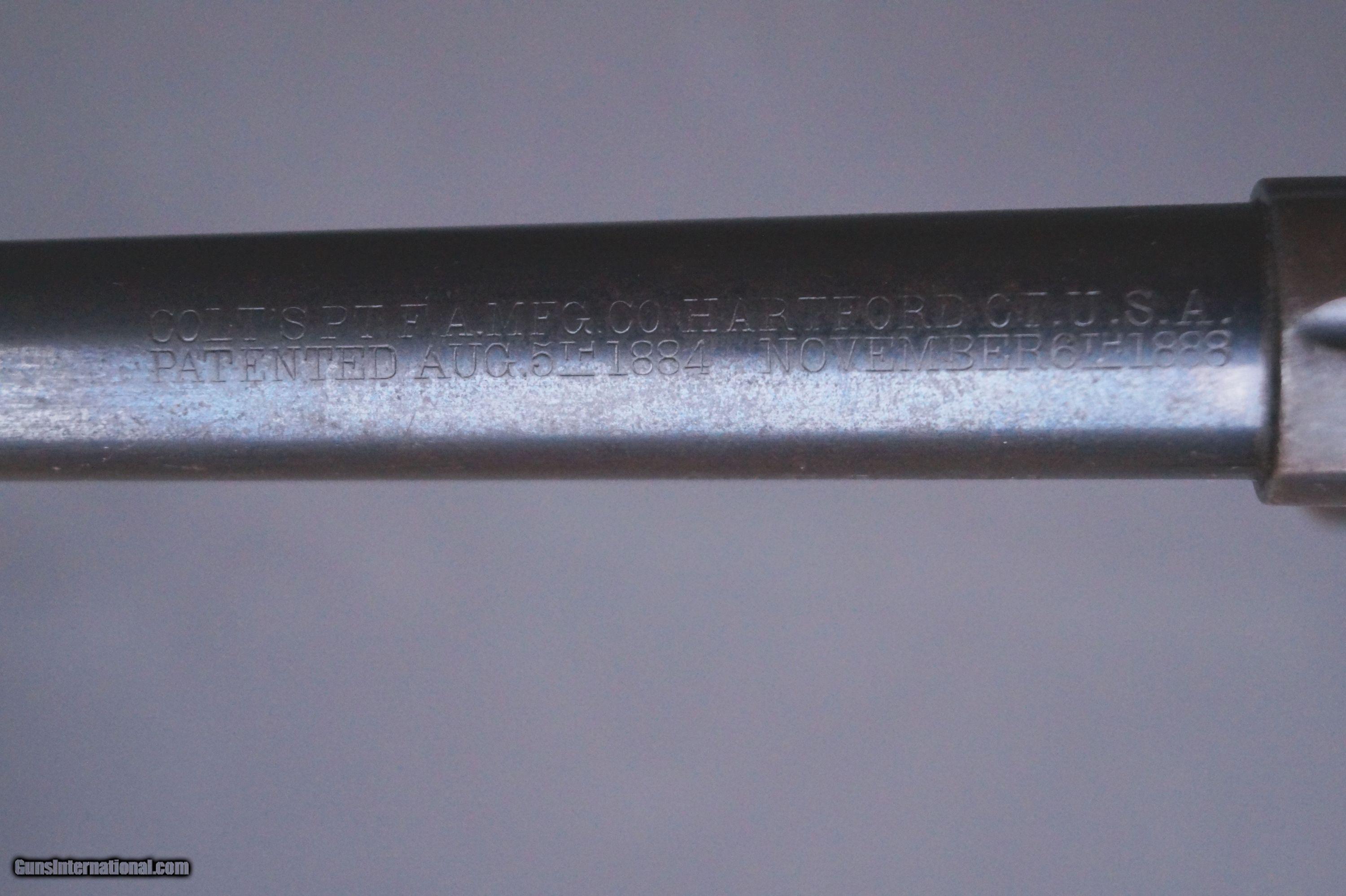 Description: This is a First Contract Colt US Army Model 1894 Double Action Revolver with standard 6" barrel, six shot cylinder, in .38 Colt with walnut grips. The 1894 was an improvement over the US Army Model 1892 in that it was equipped with a device that blocks the hammer when the latch was not fully engaged locking the cylinder in place. The first contract of 3,000 guns were numbered from serial numbers 60,000 thru 62,999. This particular gun is in the 60,000 range. According to Best's Book on Colt DA's, Colt had delivered all 3,000 Model 1894's from the first contract by the end of April 1895. It is interesting that these Colt DA's were introduced into service in the last days of the American Western Frontier and was the US Army's main issue handgun when war broke out with Spain over Cuba and the Philippines in 1898. Of course, the Colt Double Action was a great design but its .38 caliber cartridge was found to be insufficient at stopping the Moros in the Philippines a couple of years later at the turn of the 20th century. Today, these 1894's are a bit of a challenge to locate in original unaltered condition. Many were upgraded in later years to the Model 1901 with the addition of a lanyard ring on the base of their handles and were refinished and re-marked by Colt. Even in World War One, Remington Arms refurbished thousands of DA's for issue to the US Navy. That said, this one has never been altered or refurbished and is still wearing its original finish. Overall, it is in NRA Antique Fine Condition with 50% Faded/Light Original Powdery Blue mixed with a smooth brown patina which forms the balance of surface areas. The hammer and rear face of the hammer show just traces of original fire blue. The grips are in Very Good Condition Overall with faint but visible large early cartouches in the rectangular/oval sided borders. Bottom of left grip has the correct Ronaldo A. CARR (RAC) sub-inspector stamp. RAC's can also be found on the left side of the frame, barrel, and cylinder. Like the Model 1892, the last four digits of the serial number form the assembly numbers on various parts. These assembly numbers are matching on the inside of the frame, swing-out yoke, cylinder, barrel, latch, and right side plate. Also like the Model 1892, these early 1st Contract 1894's only have the 1884 and 1888 patents on the top of the barrels and were built just before the March 1895 patent date was added to the address. This is confirmed in Best's Book as well. The mechanics cycle in both single and double action modes. Bore has a minor spot or two of pitting but semi bright and Good Plus Overall. May clean to Very Good. Nice untouched example of an early 1st Contract Model 1894 Revolver with zero upgrades and as issued in the Spanish American War. SOLD Antique: Yes Manufacturer: Colt Model: US Army Model 1894 Caliber Info: .38 Colt |
