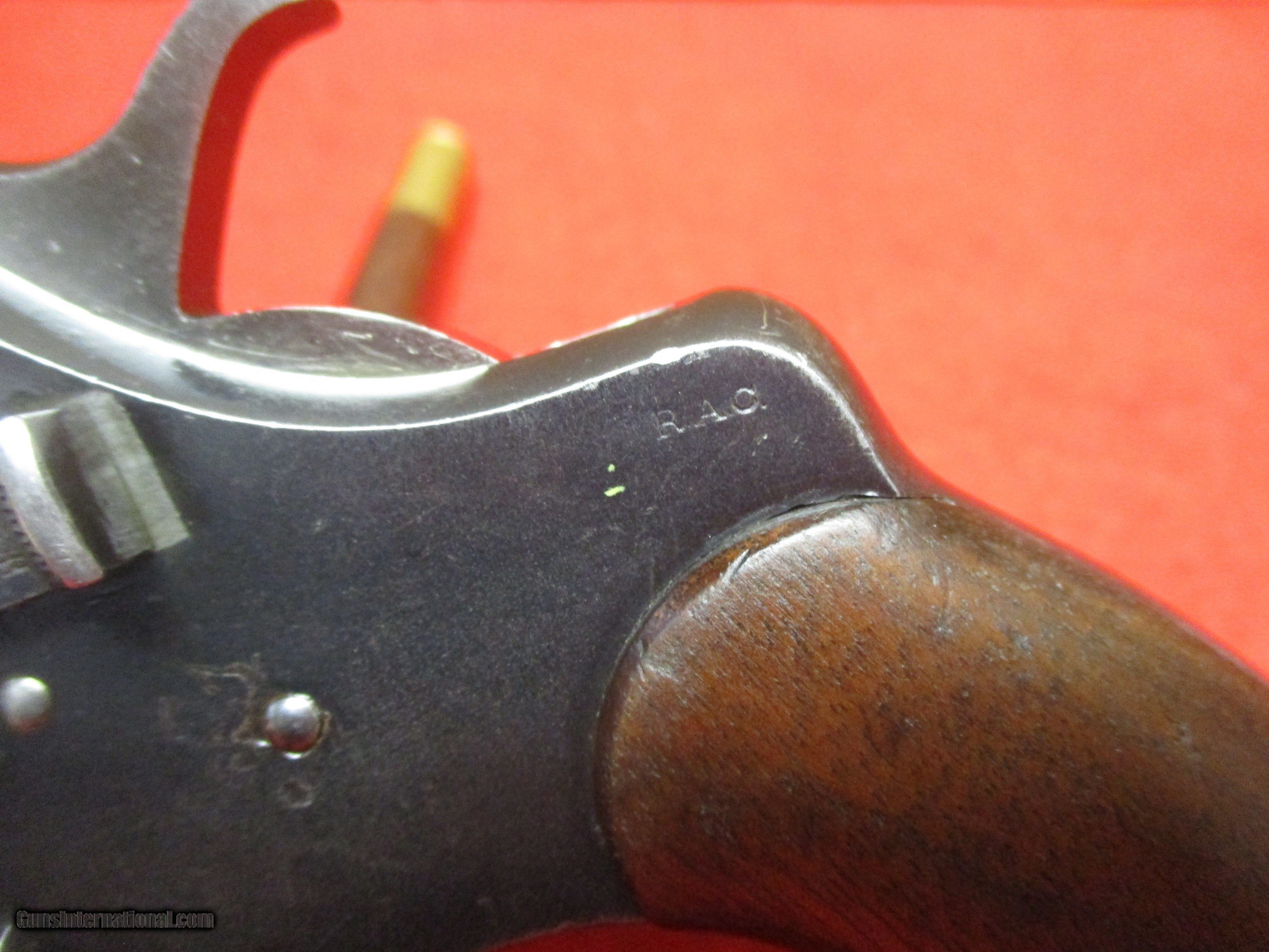 Description: The M1901 was developed from a series of Colt revolvers, starting primarily with a Model 1892. The M1892 was designed to replace the Model 1873 in U.S. Army service. Army trials with the Navy Model 1889 (the first Colt with a swing out cylinder) between 1890 and 1891 showed that design’s weaknesses in its locking system. The cylinder could potentially turn when holstered. Modifications to the design resulted in the Model of 1892 which was accepted for service. The 1892 is strange compared to later Colt revolvers as its cylinder turns counter-clockwise like the Smith & Wesson hand-ejectors. Unfortunately, direction of rotation would attempt to push the yoke/cylinder unit out of the frame as the trigger was pressed. Wear over time would eventually result in the cylinder being out of time. As a result of these findings, improvements were made to the locking mechanism resulting in the Model 1894/1896 Army Model. Ultimately, these two became the model of 1901 which was essentially a Model of 1894 with a sling swivel added. The final Model of 1903 changed the bore diameter slightly. The Army Model’s true Achilles heel, however, was the cartridge it was chambered for, the .38 Long Colt. During the Philippines Campaign (1899-1902), it was found the .38 LC had little stopping power against charging enemy combatants wielding machetes, even with multiple hits. For this reason, the M1892/1894/1896/1901/1903 models were ultimately replaced by the .45 Colt-chambered M1909 New Service revolver in 1909. The revolver presented here is a military-issue Model 1901 produced in 1903. It has a 4.5” barrel and walnut grips. The bluing is in fairly good condition with some wear. Sadly, someone had their serial number stenciled on the front of the grip, i.e. the front strap. It is actually rather light and could possibly be polished out. The side of the frame has the famous RAC inspector’s acceptance stamp. Mechanically, the pistol has only one issue. As the hammer is cocked and the trigger pulled, the hammer moves forward as it should. At this point, the revolver has not done anything out of the ordinary. However, as the trigger is released and begins to move forward, the cylinder suddenly rotates clockwise by 1 degree, i.e. the wrong direction for a Model 1892/1894/1896/1901/1903. This is most likely related to the issues mentioned near the top of this description. In the end, it seems that the counter-clockwise-rotation design could not be corrected to eliminate these errors. This was obviously unacceptable to Colt and is likely one of the reasons why they eventually switched to a clockwise-rotation system for all of their designs, the Colt New Pocket Model already featuring this system as far back as 1893. One wonders why the switch was not performed on the New Army Model of 1894 when the New Pocket already proved a clockwise rotation was more reliable in the long term. The bore of the Model 1901 is in pristine condition with no rust or pitting. The trigger pull is somewhat heavy compared to later Colt DA revolvers. Still the M1901 was important step in the evolution of Colt’s revolvers and it can be said that the lessons learned here directly influenced the decision to switch to the clockwise rotating cylinder and tighter lockup that Colt’s DA revolvers are famous for. A word of caution. Most revolvers chambered for .38 Long Colt do not have shoulders inside the chambers to allow the use of the .38 Short Colt (which uses an outside lubricated bullet like the .22 Long Rifle; frontal bullet diameter is .375”). As a result, the longer .38 Special will fit inside the chamber. No revolver in .38 Long Colt should ever be fired using the .38 Special as this is beyond the pressures the revolver was designed to handle. SOLD Handgun Caliber: .38 Long Colt Manufacturer: Colt's PT. F.A. Mfg. Co. Model: New Army Model 1901 Serial Number: 198994 Bore: Rifled Chambers: 6 Ejectors: Manual ejection rod, simultaneous 6-round ejection Condition: Fair - See description Metal Condition: Bluing loss and physical wear Wood Condition: Excellent Bore Condition: Pristine Barrel Type: Tapering Action: Double Action/Single Action Triggers: Single Stock: Walnut Finish: Blued Weight: about 2 lbs. Sights: Fixed rear sight notch, round blade front sight, sight radius 7.25 inches (183mm) Manufacture Date: 1903 |