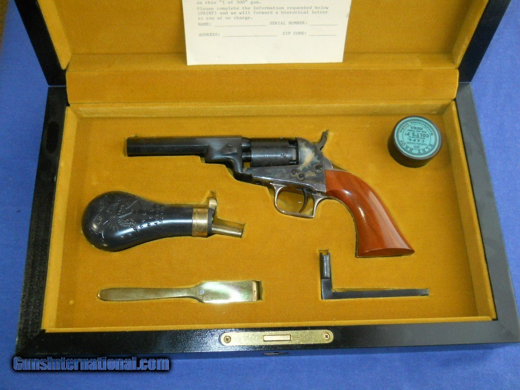 Description: GENUINE COLT SECOND GENERATION LIMITED EDITION OF 500 PERCUSSION .31 CALIBER REVOLVER IN CASE WITH ACCESORIES. SERIAL # 16930 ALL MATCHING NUMBERS. COMPLETE SET AND IN AS NEW CONDITION WITH SILVER PLATE BEGINNING TO TAKE ON A WONDERFULL TARNISH. CASE HAS SOME SCRATCHES & RUBS THAT ADD TO A NICE AGED LOOK. ACCESSORIES INCLUDE "COLT'S PATENT" BABY DRAGOON EAGLE FLASK - "COLT'S PATENT" MARKED 2 CAVITY BRASS BULLET MOULD - METAL ELEY BROs CAP BOX - NIPPLE WRENCH SCREWDRIVER & KEY FOR THE CASE LOCK CONSIDERED ANTIQUE AND SHIPS DIRECT TO BUYER ANYWHERE THAT'S OK. NO C&R or FFL LICENSE REQUIRED. $25.00 S&H PRIORITY INSURED. SEE ALL SELLER Estate Antiques LISTINGS FOR MORE GREAT STUFF AT SENSIBLE PRICES DIRECT FROM ESTATE COLLECTIONS. SOLD Antique: Yes Manufacturer: COLT Model: 1848 BABY DRAGOON Serial Number: 16930 Caliber Info: .31 Bore: AS NEW Condition: EXCELLENT Metal Condition: 99% Wood Condition: EXCELLENT Bore Condition: EXCELLENT Barrels: 4 Barrel Type: OCTAGON Action: AS NEW Manufacture Date: 1979-1980 Engraving: FACTORY |
