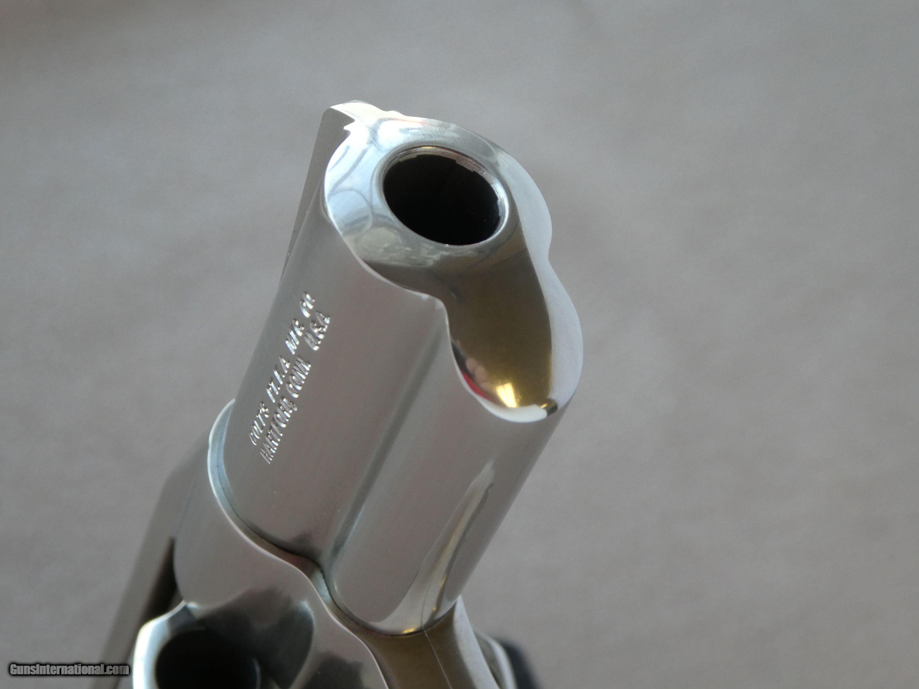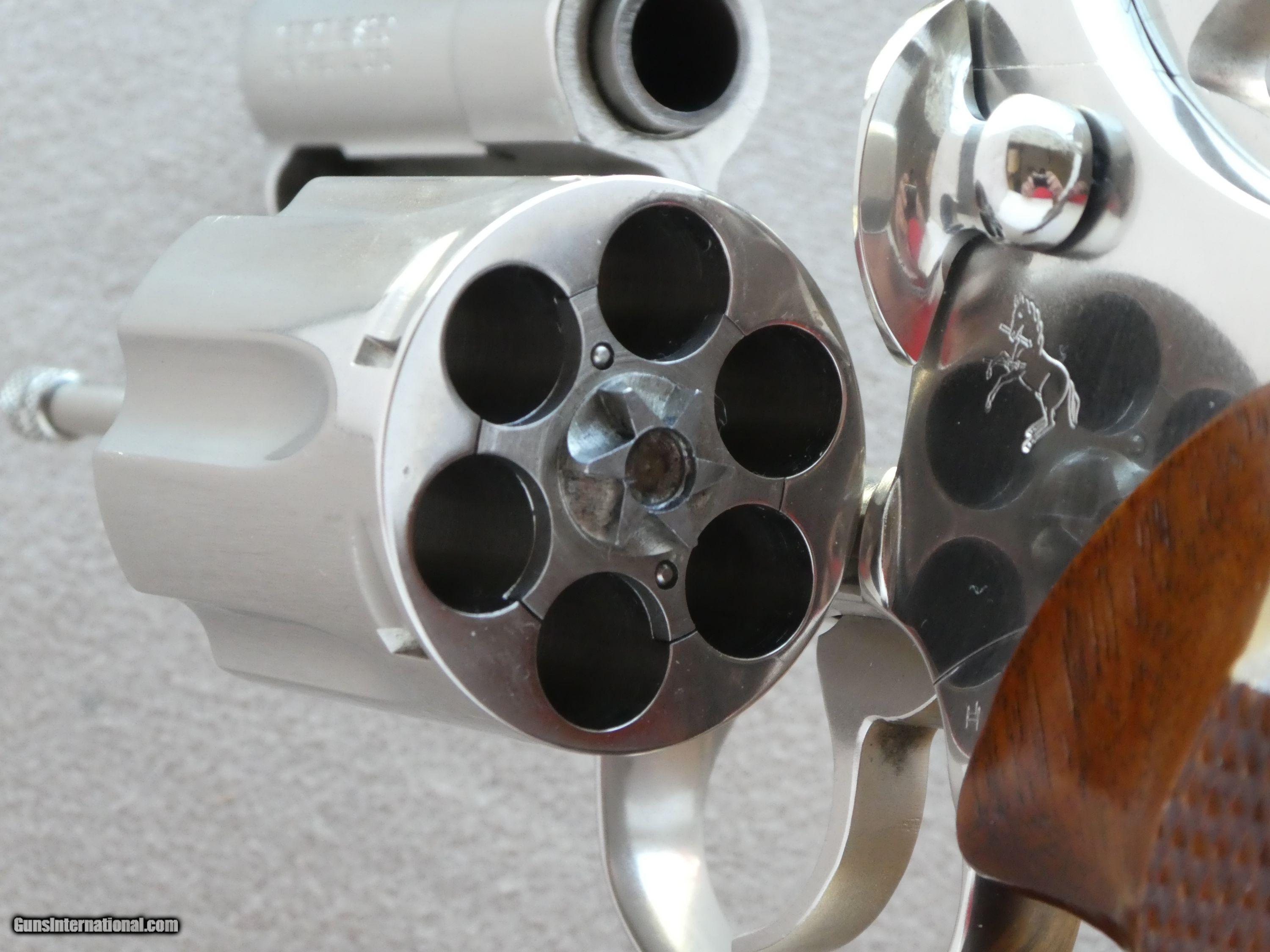 Description: This 1978 production Colt Detective Special revolver is in excellent all-original condition. The Detective Special was originally introduced in 1927 and was one of the first snub nose revolvers with a swing out cylinder. It was produced in several "issues" until 1995 when declining sales of the model forced Colt to end production. This particular gun is called a "3rd Issue" by Colt collectors today. This 3rd Issue ran from 1973 to 1986. The "3rd Issue" guns featured a shrouded ejector rod, a full ramped front sight, and new oversize checkered Walnut grips that covered the front grip strap. This Detective Special has a beautiful factory nickel finish. Nickel finish is somewhat scarce in this model as the vast majority of these snubbies were blued. The nickel finish rates a conservative 98%. There is no chipping of the finish and you have to look extremely close to see any handling marks or the very faint drag line on the cylinder. The cylinder face and forcing cone are clean and bright. The bore in this gun is pristine looking. The rifling has sharp lands and grooves and there is no pitting or erosion. The cylinder bores are also all minty and bright. The original factory checkered Walnut grips are in excellent condition as well. They are free from wear, cracks, or repairs. The checkering is still sharp and clean. Everything works on this Colt 100% like the day it left the factory. The action is "in time" and locks up with no wiggle at full lock. The action is smooth when worked in single or double action, and the trigger breaks nicely for a gun of this type. It seems as though this gun has been fired very little if at all since it was test fired at the factory. If you have been looking for a nickel finish Colt Detective Special that is "collector grade" this would be an excellent choice. With the way these double action Colts have been appreciating it will almost certainly prove a great investment. SOLD Manufacturer: Colt Model: Detective Special (3rd Issue) Serial Number: 40850R Caliber Info: .38 Special Bore: Minty Condition: Excellent Manufacture Date: 1978 |