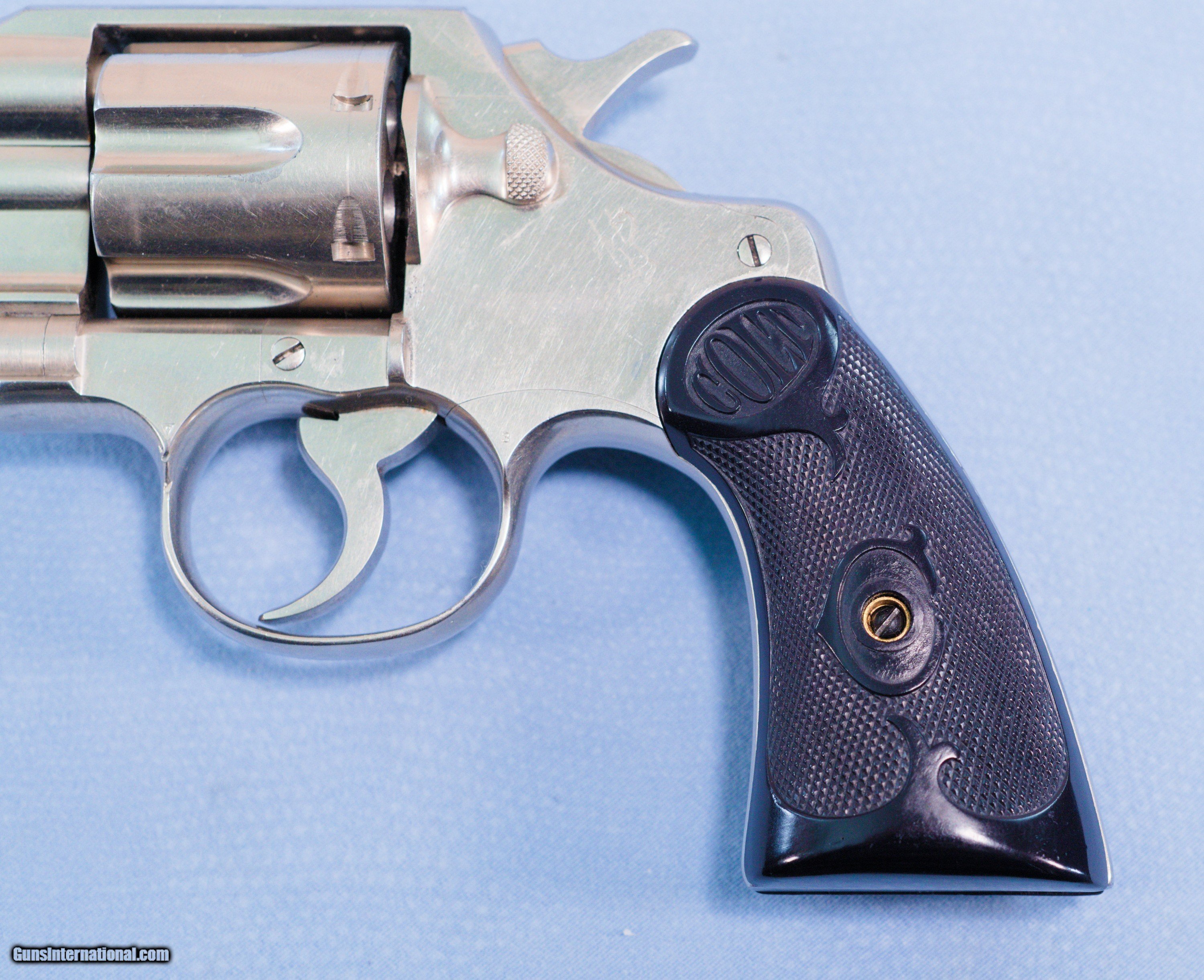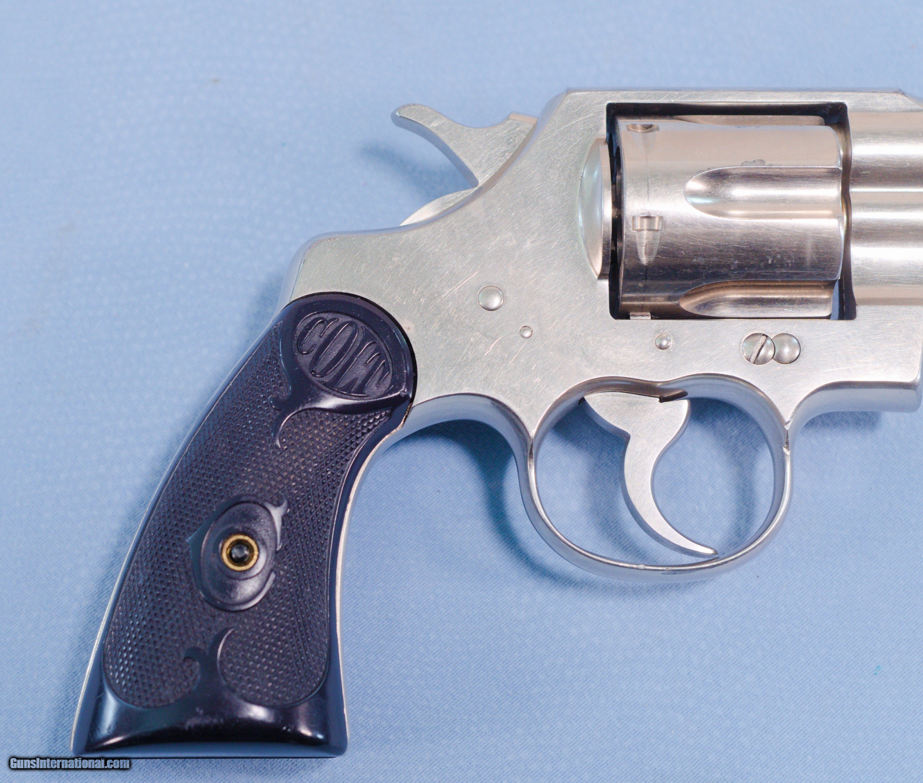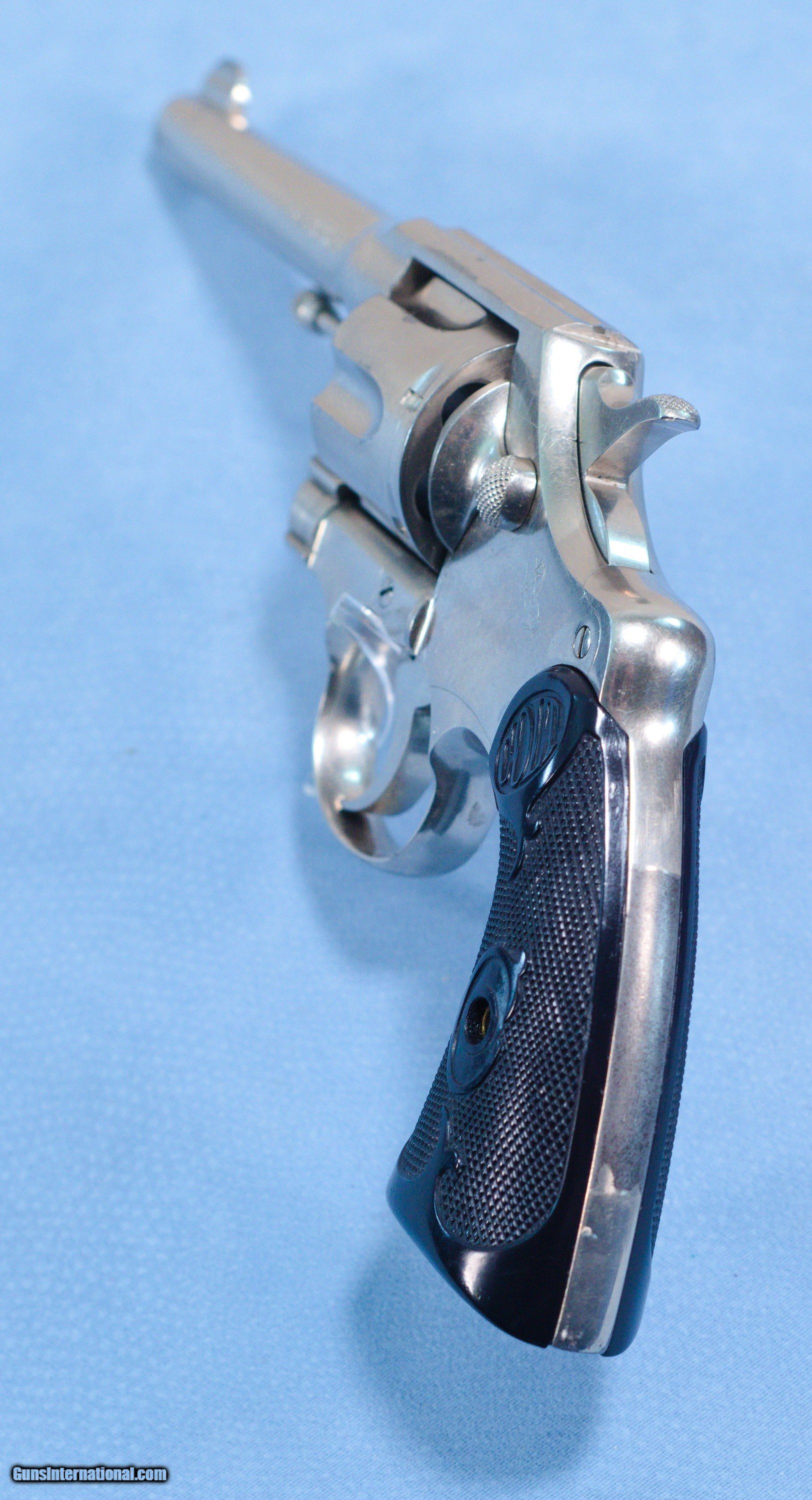 Description: **SOLD** For consideration is a very cool Colt Army Special double action revolver in .38 Special caliber. The Colt Army Special is a double action, six round revolver. They were built from 1908-1927. The Army Special started life as the New Army & New Navy and would evolve into the Official Police in 1927. It was available in 4", 5" and 6" barrel lengths. Available calibers were 22LR, .32-20, .38 Special, .38/200 and .41 long Colt. The Army Special began life in 1908 as an improvement over the New Army & Navy 1892-1903 models, which tended to bind up and get out of time due, in part, to their counterclockwise cylinder rotation. Taking inspiration from Colt’s rugged New Service revolver, the Army Special was given a stronger action, a revamped cylinder release latch, a “Positive Safety Lock” and clockwise cylinder rotation. Most guns were blued, but some were nickeled, and barrel lengths were 4", 4½", 5" and 6". Stocks were stylized black rubber until 1924, when they were changed to checkered walnut. Hoping for military acceptance, Colt dubbed its improved revolver the Army Special. This example is finished in nickel and was made in 1925. It, of course, has some handling and use marks. The 5" barrel has a good bore with strong rifling. The hard rubber grips are in very good condition being free of cracks or chips. The action is extremely tight and locks up very tightly in the "fired" condition. This is a very nice gun that would be a great addition to a collection of Colts. PRICE: **SOLD** Plus Shipping We are Antique & Modern Firearms in Lexington, KY, a dealer of fine firearms since 1974. To Inquire please call PH. 859-276-1419 We Buy, Sell, and Trade Firearms & Knives. Have an Individual Firearm, Firearms Collection, or Firearms Estate to sell, let us know, and we can buy or consignment sell it for you. NOTE: No additional fee for a Credit Card payment SOLD Handgun Caliber: .38 Special Manufacturer: Colt Model: Army Special Serial Number: 514640 Barrel Length: 5 inches Condition: Very Good Metal Condition: Very Good Bore Condition: Very Good strong rifling Action: Double Action Manufacture Date: 1925 Item Location: Kentucky |