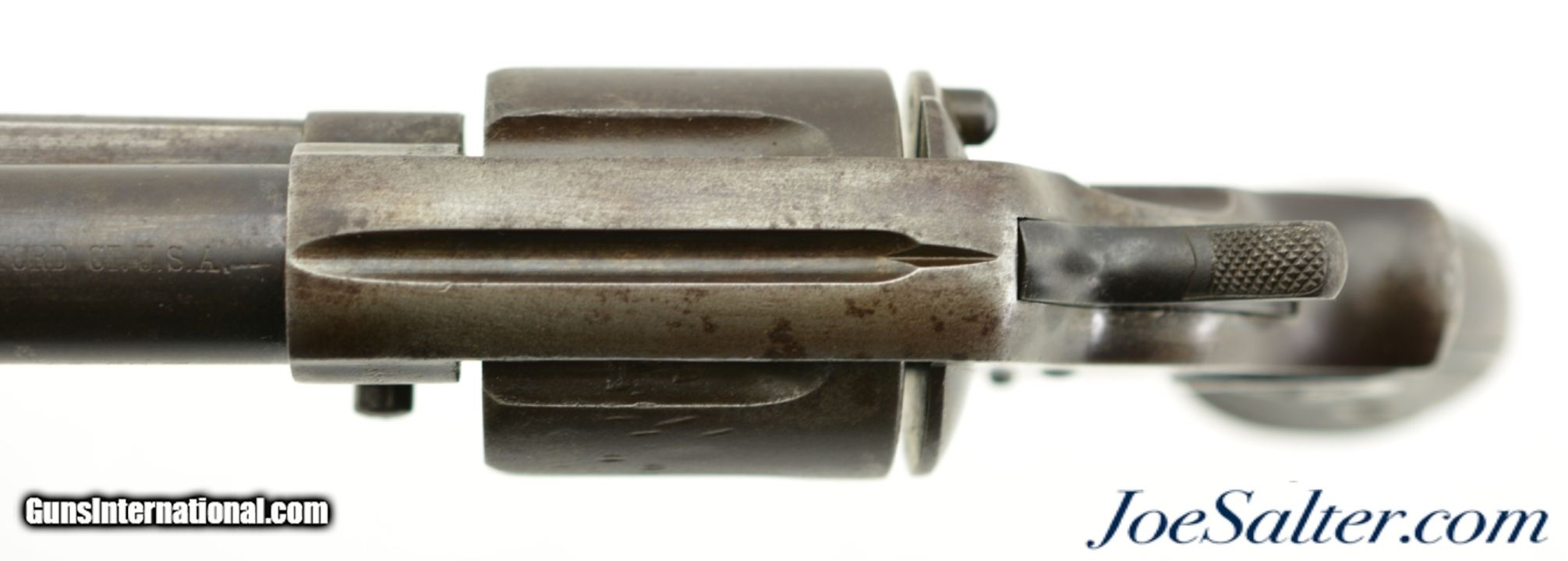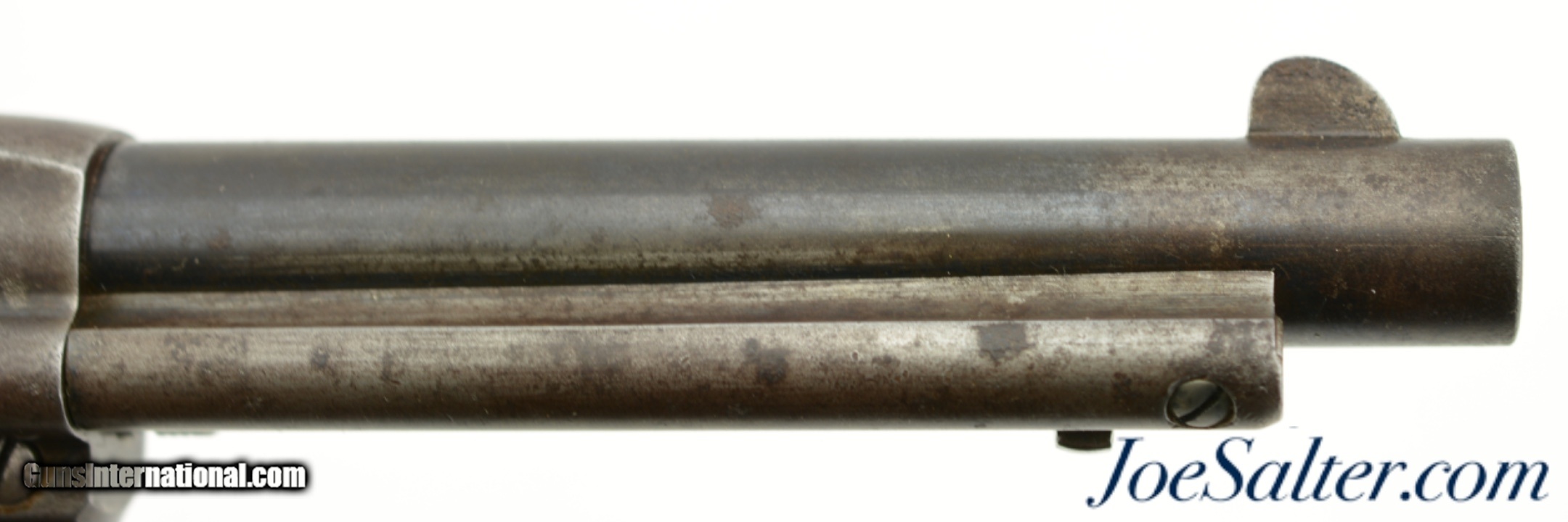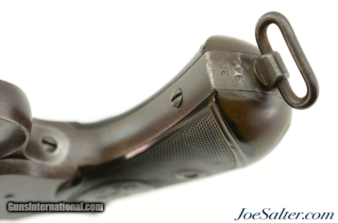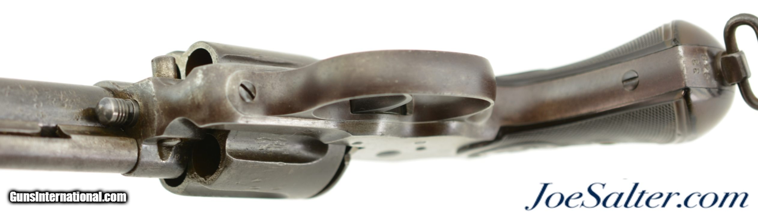 Description: Serial #32948, .45 Colt, 5 1/2" barrel with a lightly pitted bore that has strong rifling. This is an 1893-made revolver that has traces of the original blue remaining on a few protected areas, with the balance turned to a mottled plum-brown and pewter gray patina. Spots of mild surface freckling are present scattered throughout the metal, and there are small impact marks on the underside of the barrel and sides of the frame around the head of the cylinder pin, and pin release. Some further marks are present on the exterior of the cylinder. The checkered hard rubber grips are intact and have only some light wear at the butt on either side. The grips are original and numbered to the gun on the interior, and the loading gate assembly number (107) matches the frame number under the left panel. The action is fully functional in both single and double-action, and the revolver rates about very good overall. Antique SOLD Antique: Yes |
