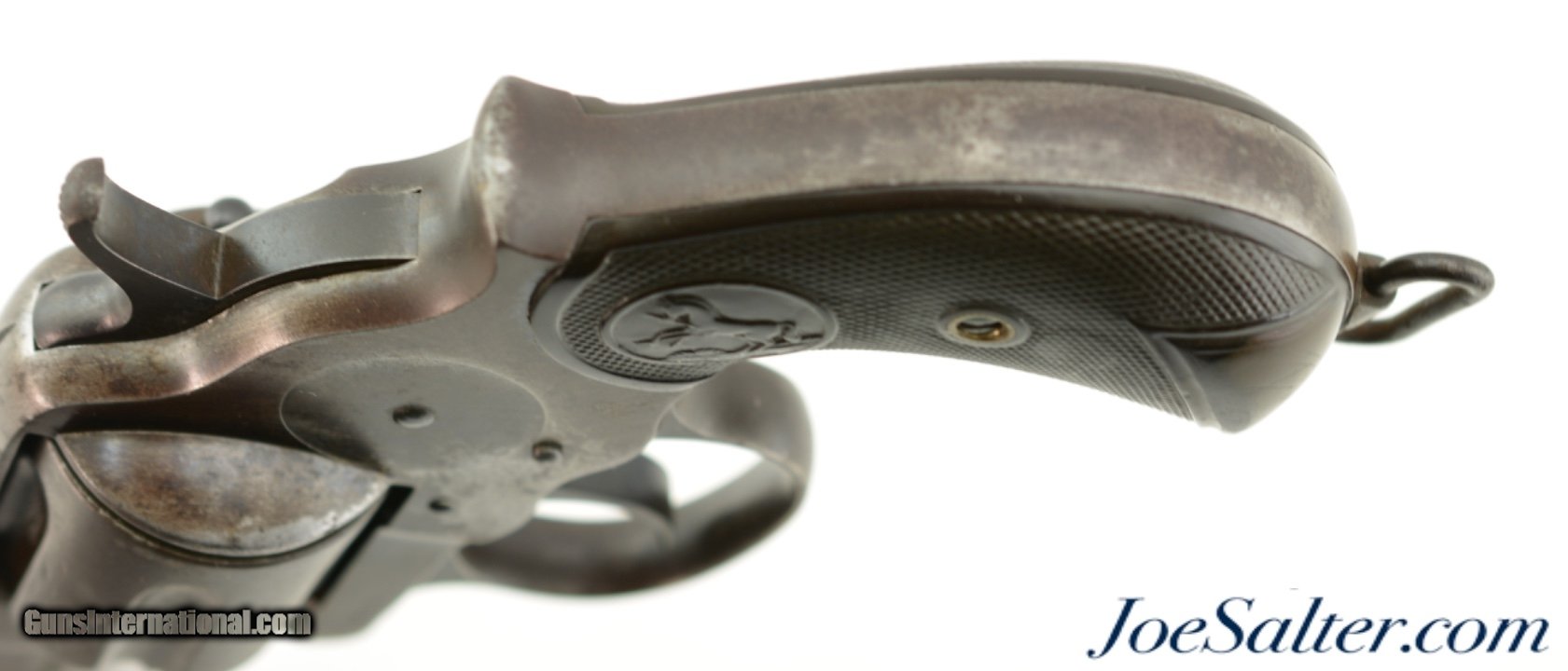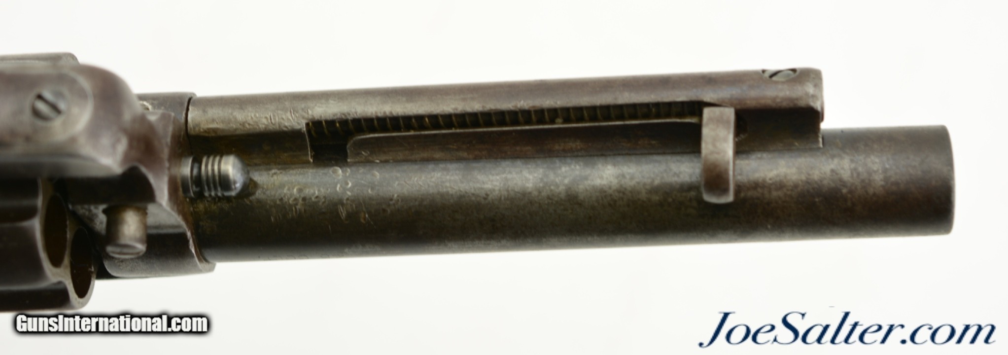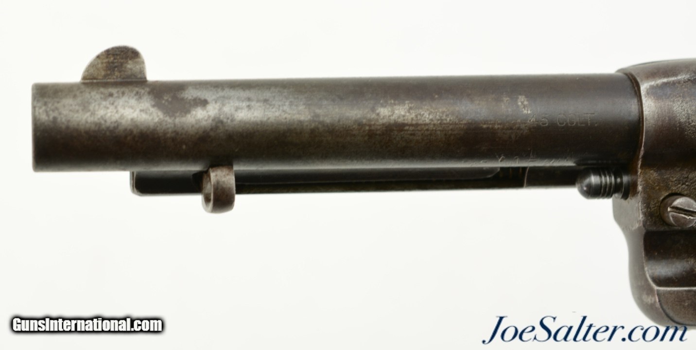 Description: Serial #32948, .45 Colt, 5 1/2" barrel with a lightly pitted bore that has strong rifling. This is an 1893-made revolver that has traces of the original blue remaining on a few protected areas, with the balance turned to a mottled plum-brown and pewter gray patina. Spots of mild surface freckling are present scattered throughout the metal, and there are small impact marks on the underside of the barrel and sides of the frame around the head of the cylinder pin, and pin release. Some further marks are present on the exterior of the cylinder. The checkered hard rubber grips are intact and have only some light wear at the butt on either side. The grips are original and numbered to the gun on the interior, and the loading gate assembly number (107) matches the frame number under the left panel. The action is fully functional in both single and double-action, and the revolver rates about very good overall. Antique SOLD Antique: Yes |
