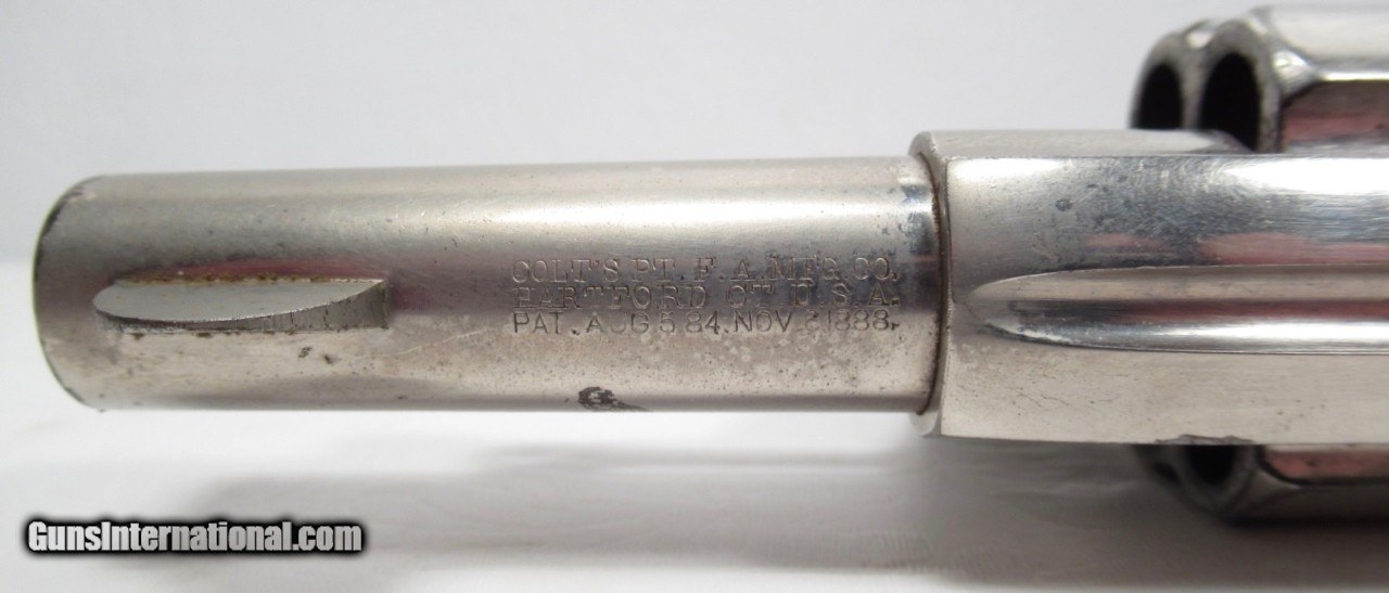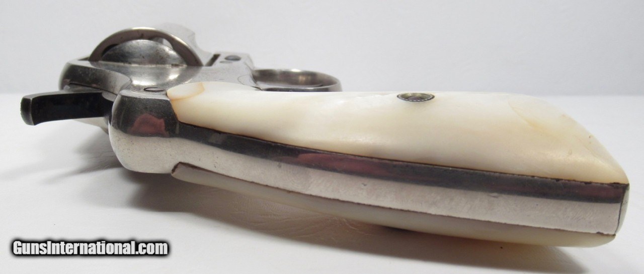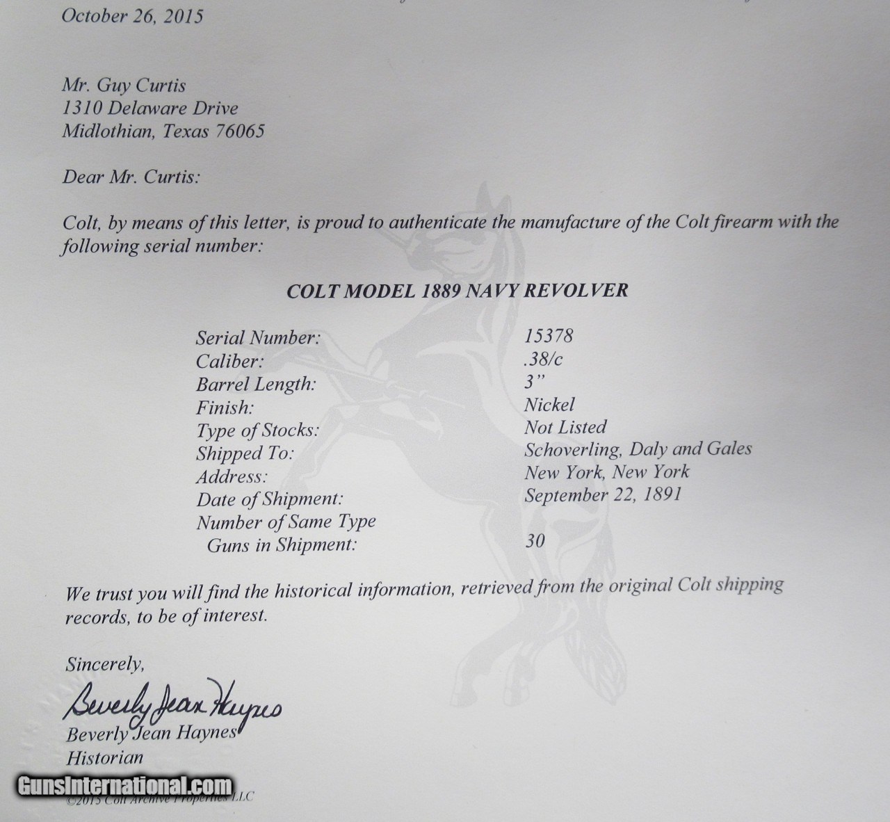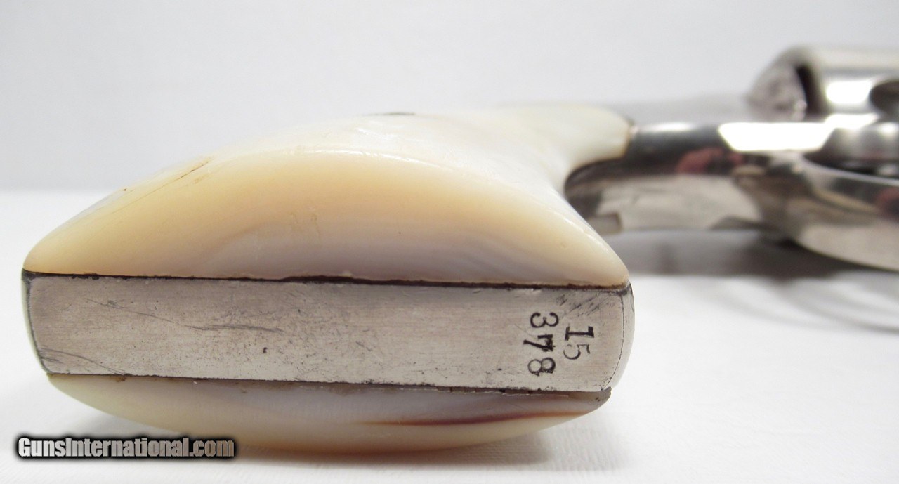 Description: RARE Colt 1889 Revolver; Serial No.15378; .38 Colt cal.; 3” Barrel; Nickel Metal Finish; most of the Original Metal Finish Remains; BEAUTIFUL Pearl Grips; PERFECT Action and Bore; Great 128 Year-Old RARE Colt Double Action; LIQUIDATING PERSONAL COLLECTION; return policy: three days inspection from the date the item is received; full refund of shipping both ways ONLY IF THE ITEM IS MISREPRESENTED. SOLD Manufacturer: Colt Model: 1889 Navy Serial Number: 15378 |