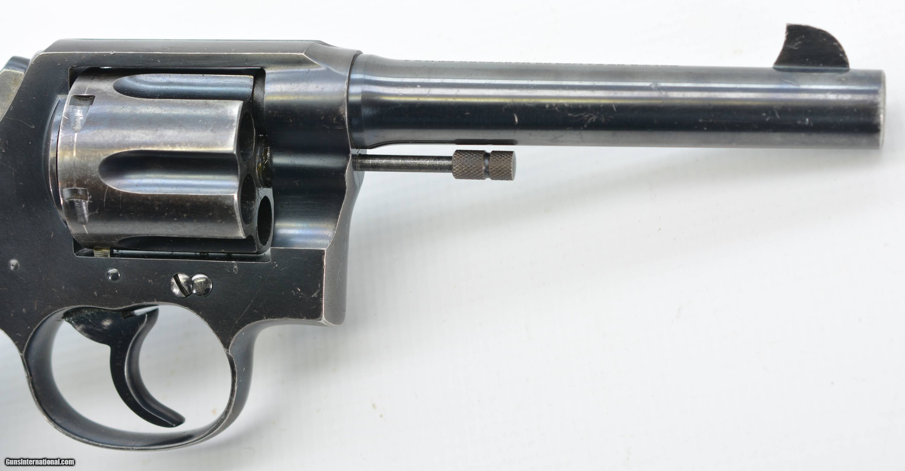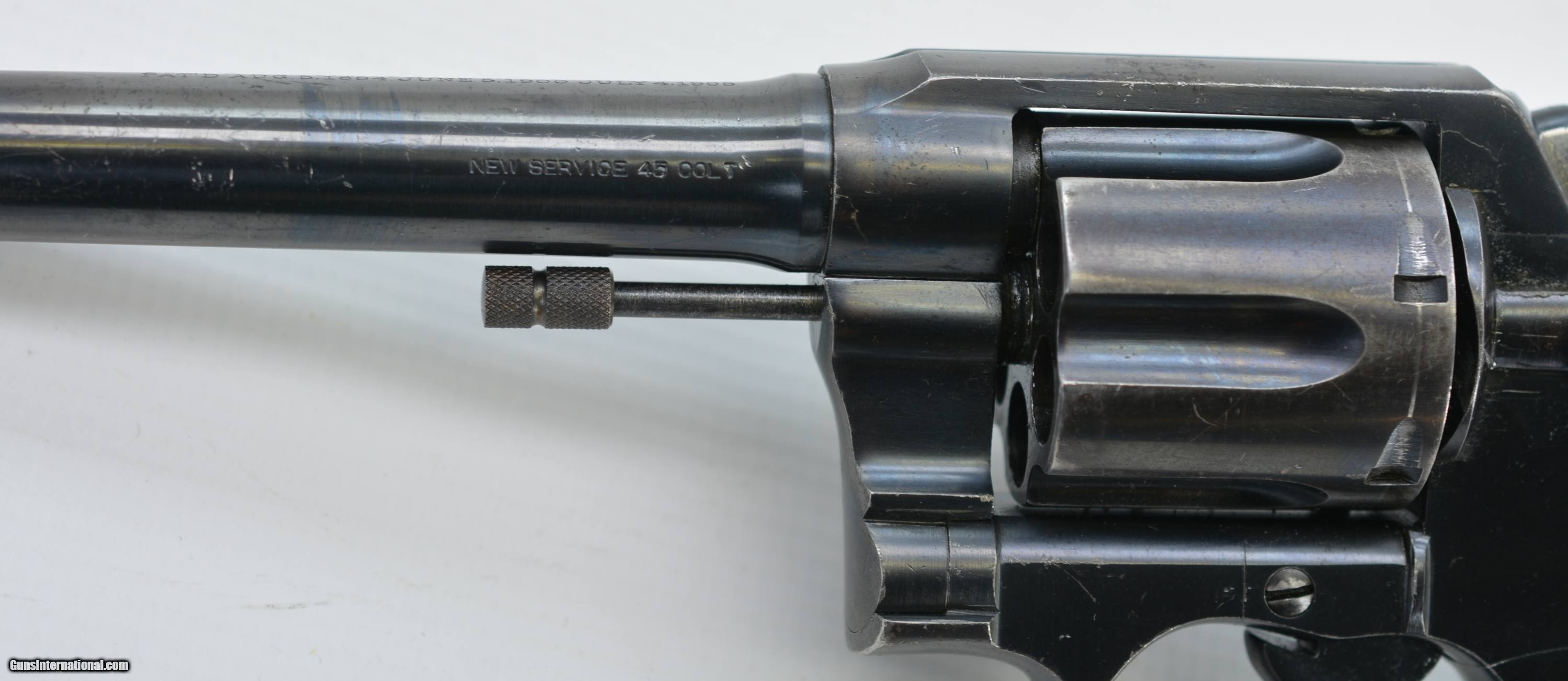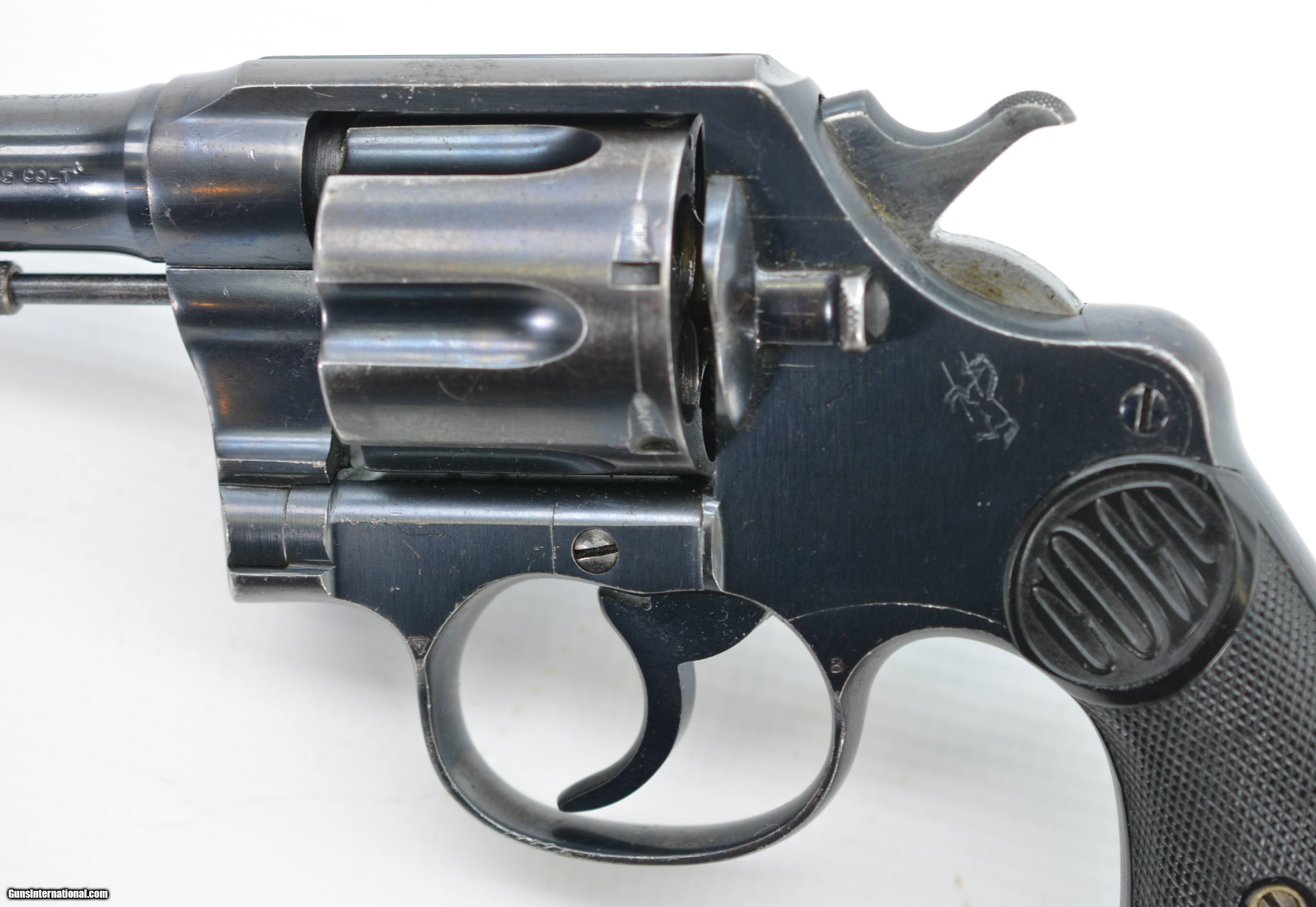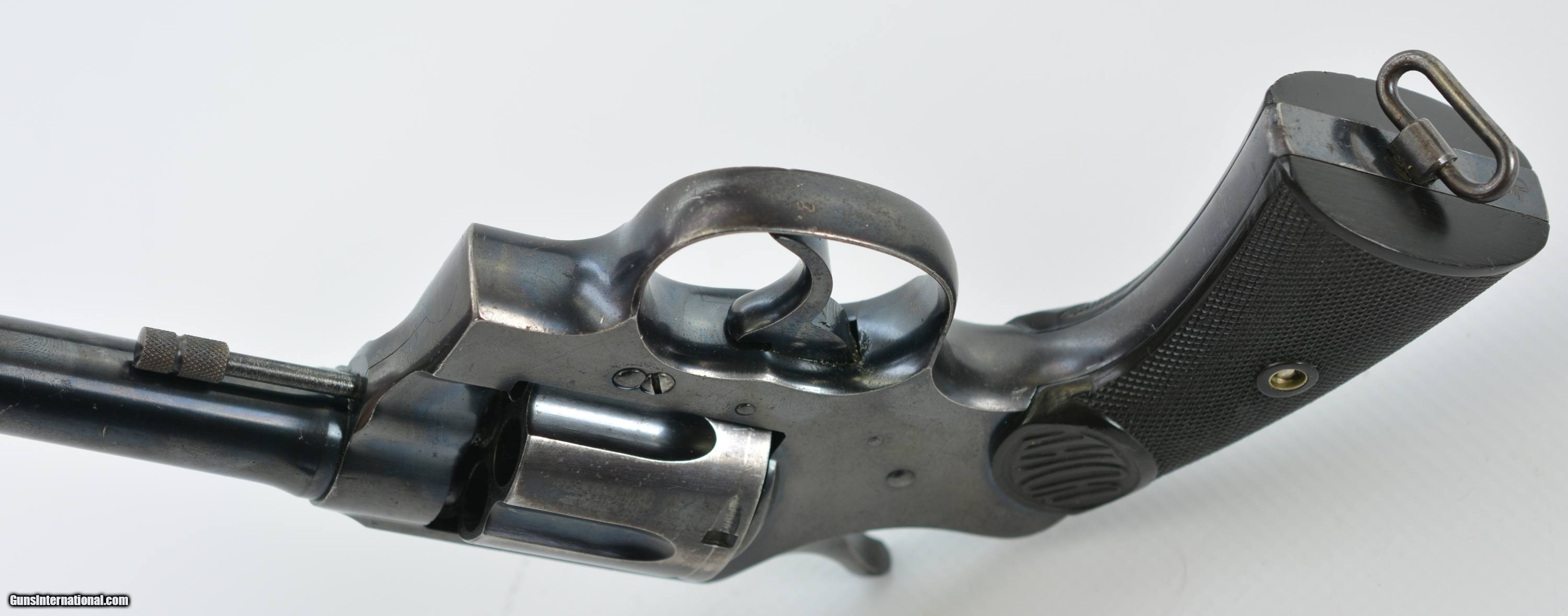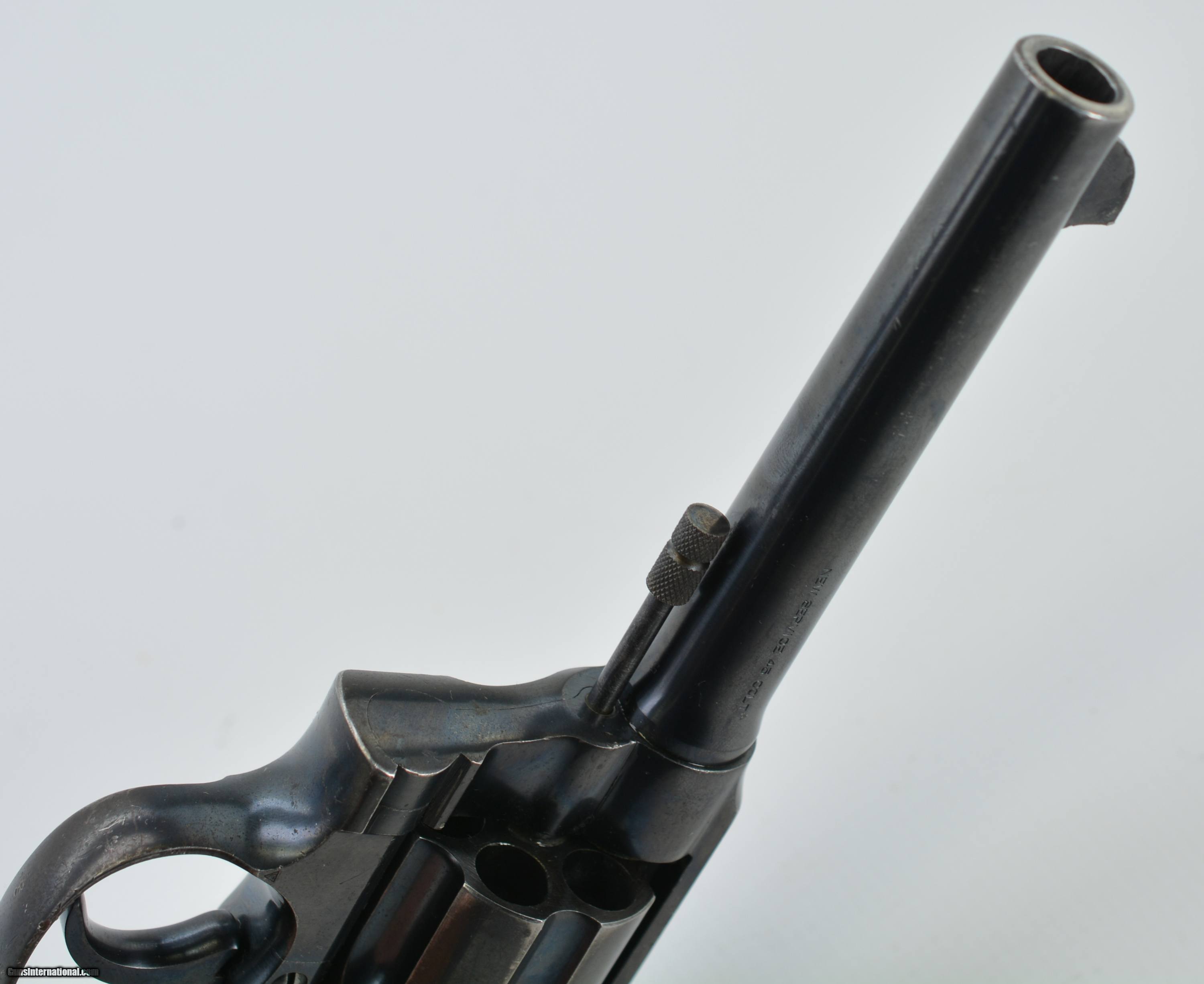 Description: Serial #144802, .45 Colt, 5 1/2" barrel with a fine, bright bore that has a few faint spots of freckling within the grooves. This revolver was built in 1917 and retains about 85-90% of the original blue finish that has silvered along the high edges and projections, a moderate turn-ring on the cylinder, and brown freckling on the gripstraps. The hammer and trigger retain a commensurate amount of their original blue finish, and the checkered hard rubber grips are in fine condition with only some mild flattening of the points, and a few scattered handling blemishes. The backstrap is stamped with a large Royal North West Mounted Police issue stamp: “RNWMP 1450", and a further “MP" stamp at the heel of the butt. This is a splendid Mounted Police Colt, in very good-fine condition, and would make a great addition to any collection. FFL or C&R SOLD Curio/Relic: Yes Manufacturer: Colt Model: New Service Serial Number: 144802 Caliber Info: .45LC Gauge Info: .45LC |
