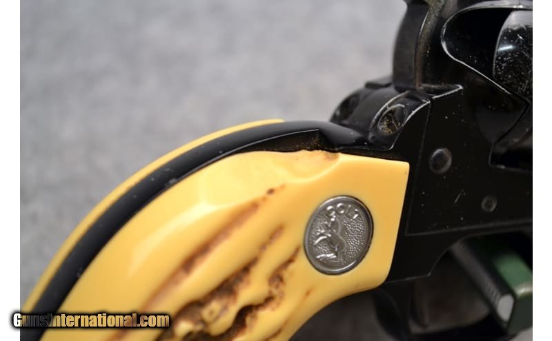 Description: Colt Frontier Scout Single-Action Revolver in .22 Magnum. Signs of wear around the cylinder on both sides and a chip missing at top of right side grip. .22 MAG SOLD Metal Condition: Signs of wear around cylinder Barrels: 4.75 Weight: 1 lb 8 oz Item Location: christiana |