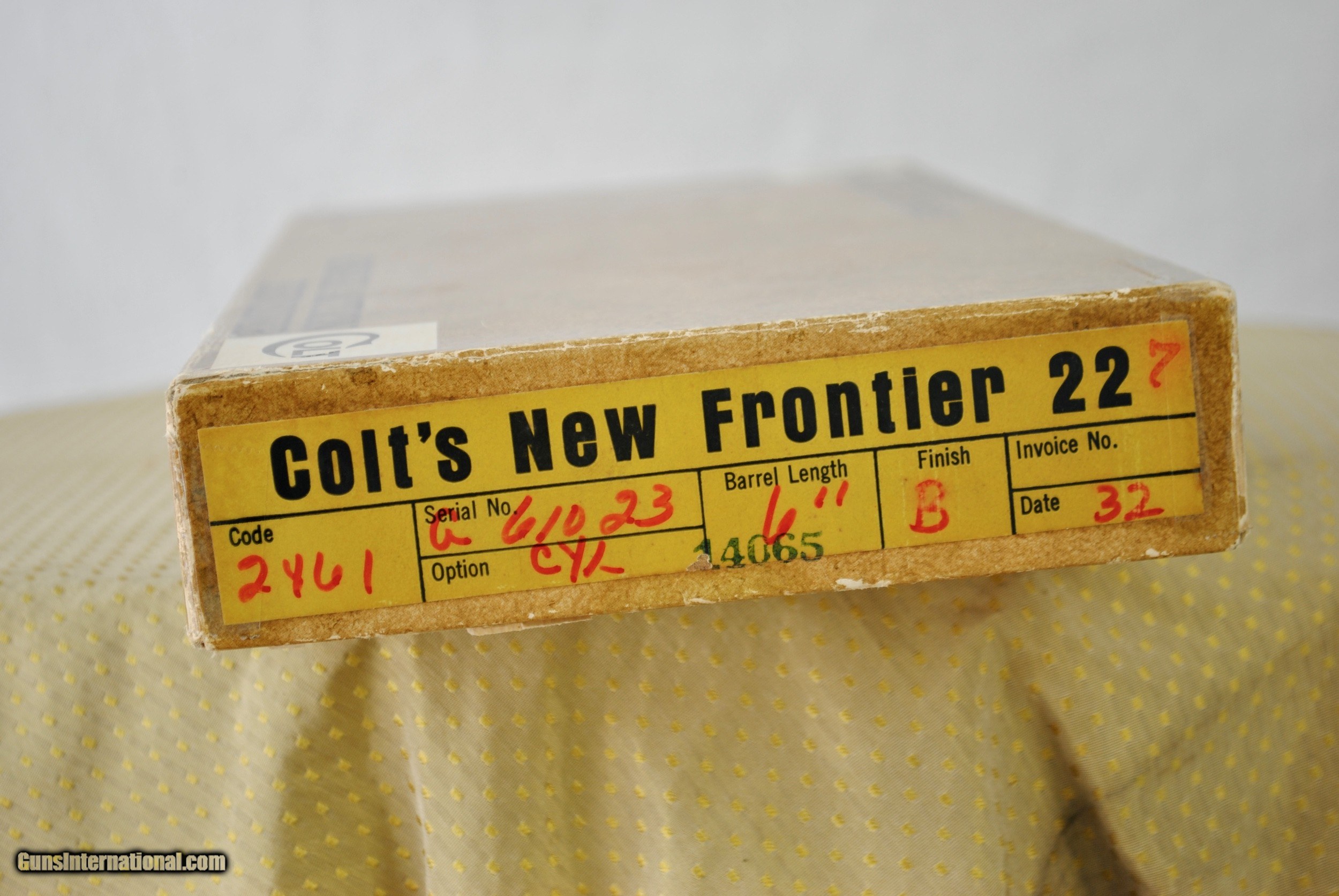 Description: Colt New Frontrier Dual Cylinder Single Action Revolver from 1972. Unfired in the box with correct paperwork. Cylinders are 22 Magnum and 22 LR. Barrel is 6". Case hardened frame and blued barrel. Right corner of inside box has a small tear. Shipping is $65. They don't get any better condition than this. SOLD Handgun Caliber: .22 WMR (.22 Magnum) |