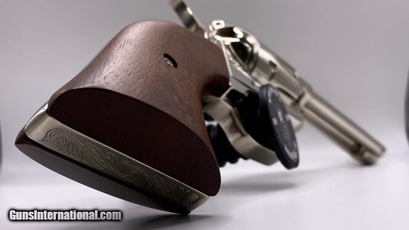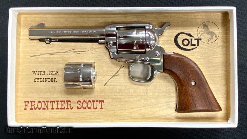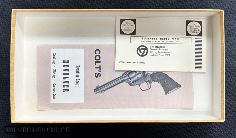 Description: Guns Listing ID: 596710 Colt Single Action Frontier Scout revolver, manufactured in 1965. Complete with original .22 Magnum conversion cylinder. Nickel plated with 4.75 inch barrel, and walnut grips. Bore is bright and clean. Top of the barrel marked with single line Colt Hartford address. 6 shot fluted cylinder. Nickel finish with smooth walnut grips. Engraved on bottom. Serial number: 42361K FIREARM COMES WITH ORIGINAL BOX, PAPERWORK, AND BOTH CYLINDERS. SOLD Curio/Relic: Yes Manufacturer: COLT Model: SINGLE ACTION FRONTIER SCOUT Caliber Info: 22LR/22WMR Condition: Used - Non-Certified Barrels: 4.75 BARREL Finish: NICKEL |