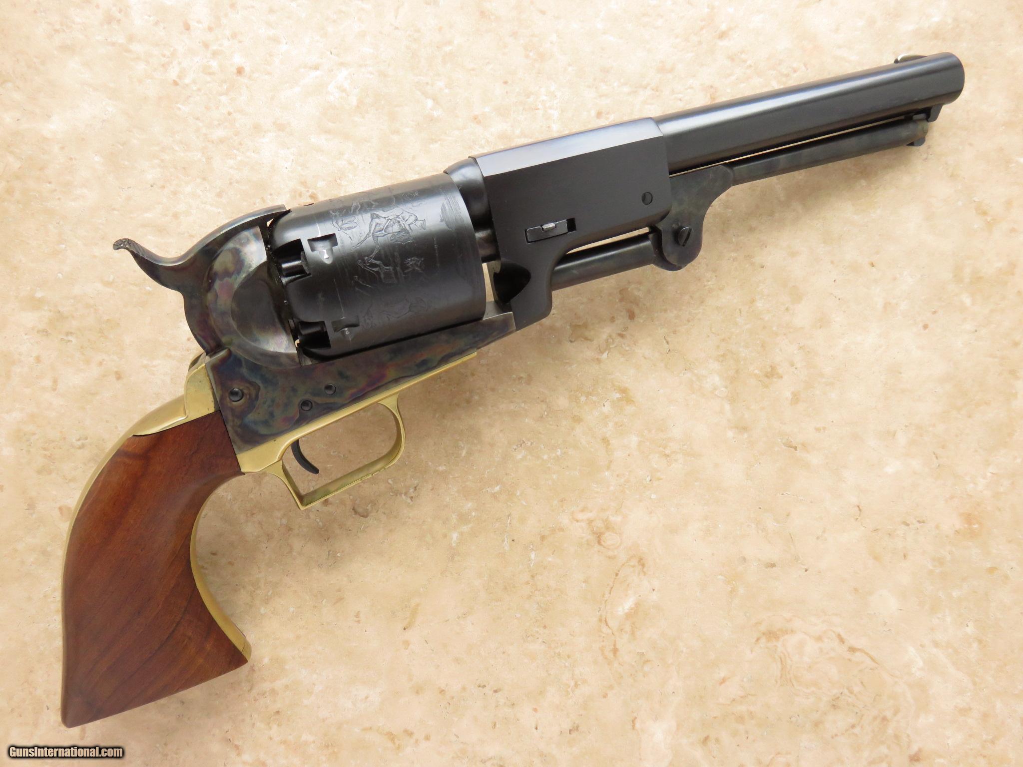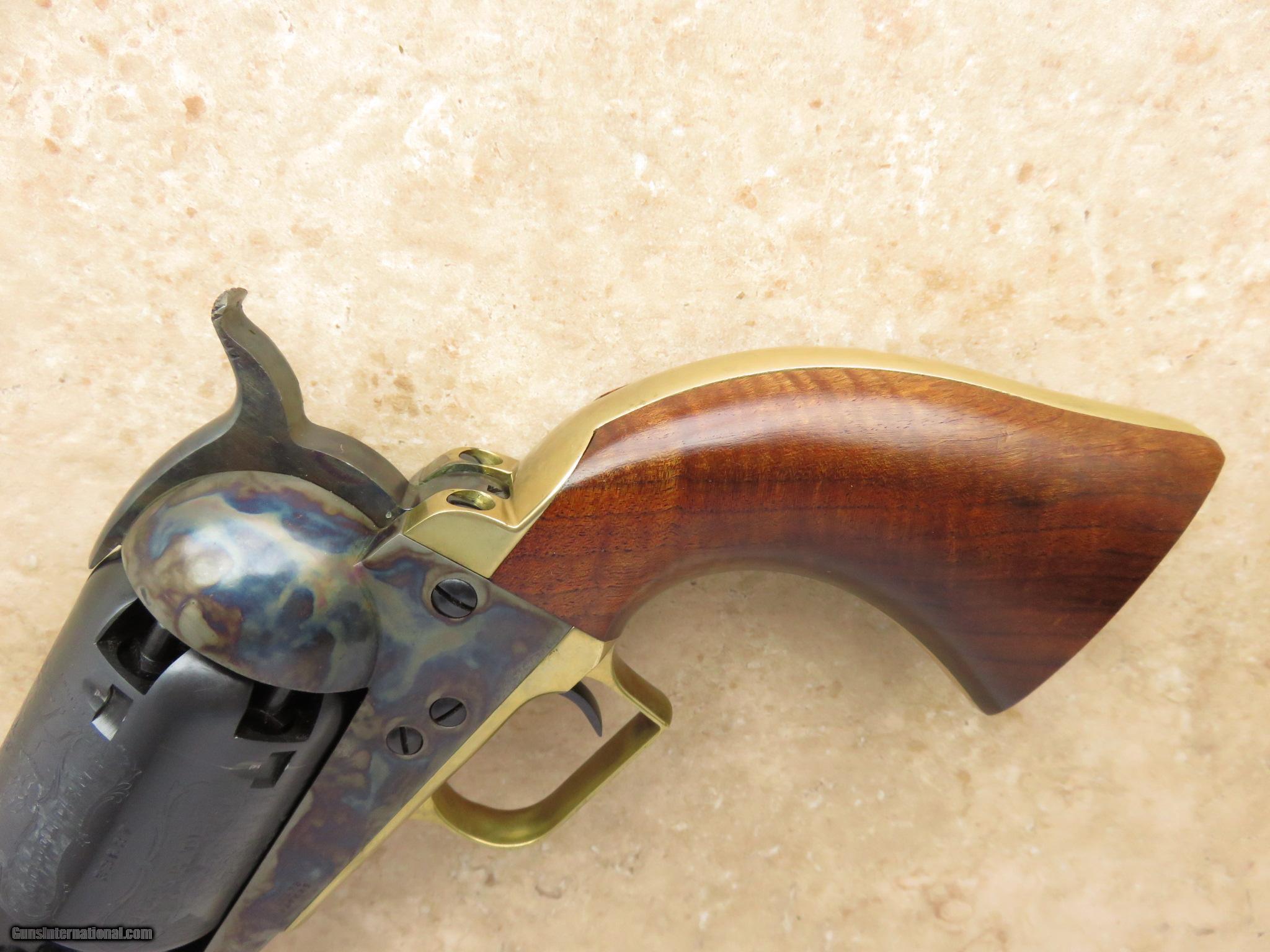 Description: As new/unfired Colt Dragoon, 2nd Model, 2nd Generation .44 caliber percussion revolver. These 1970's vintage, large 6-shot revolvers were fitted with an 8 inch barrel, blue finished barrel and cylinder, color case-hardened frame, loading lever, hammer, and cylinder pin, brass back-strap, brass square back trigger guard, and one piece walnut grips. The gun retains 99% of its original finishes, with most loss due to the drag line on the cylinder, due to handling. Gun comes with its original, numbered to the gun box, and all paper-work. These big Colt 2nd Generation Dragoons are quite atttractive. NOTE: Since this is a percussion firearm, an FFL is not required. Please check the laws where you live before purchase. PRICE: $750 We are Antique & Modern Firearms in Lexington, KY, dealer of fine firearms since 1974. PH. 859-276-1419 We Buy, Sell and Trade Firearms & Knives. Have a Individual Firearm, Firearms Collection, or Firearms Estate to sell, let us know, we can buy or consignment sell it for you. (sales at am-firearms) SOLD |