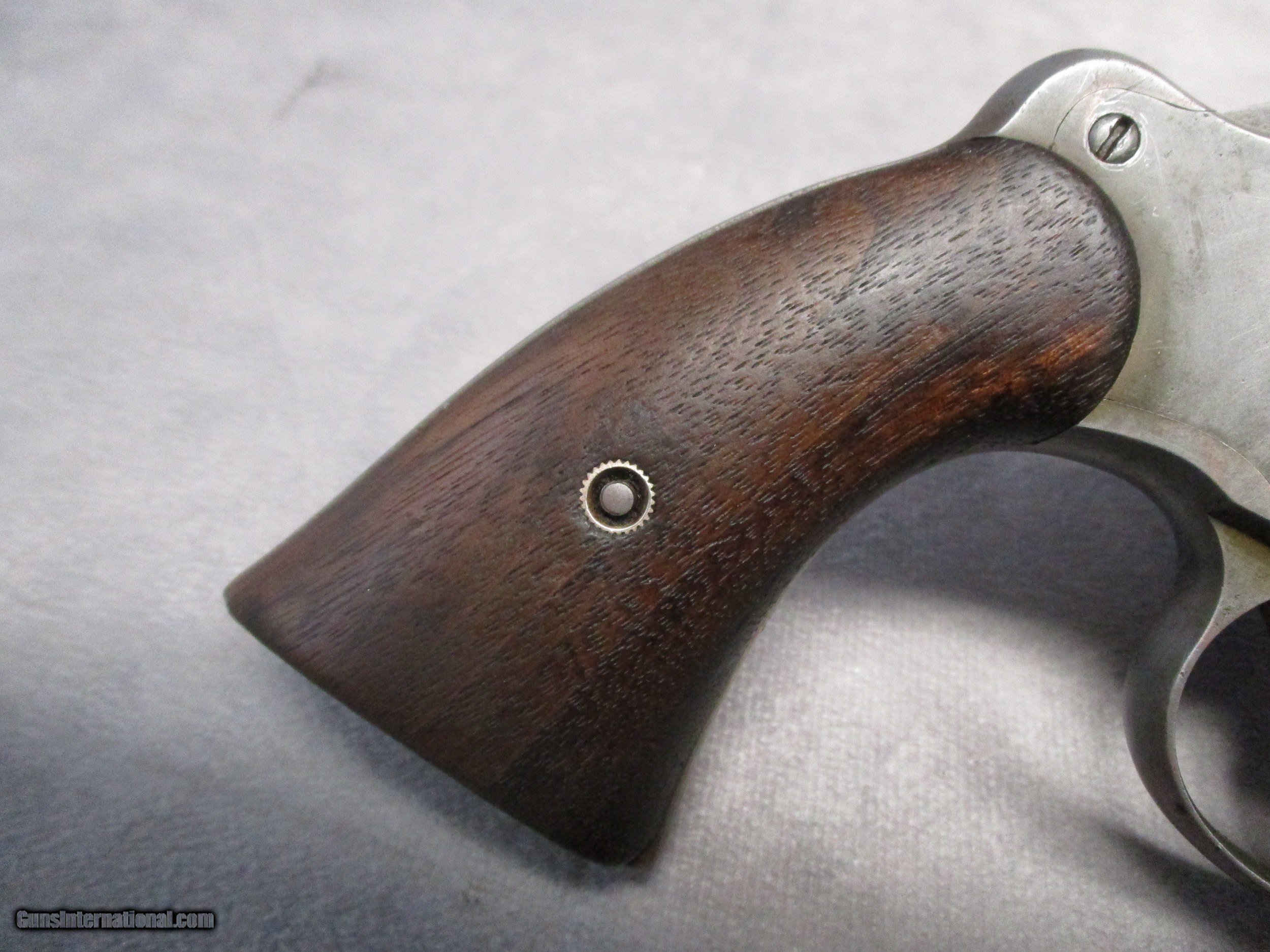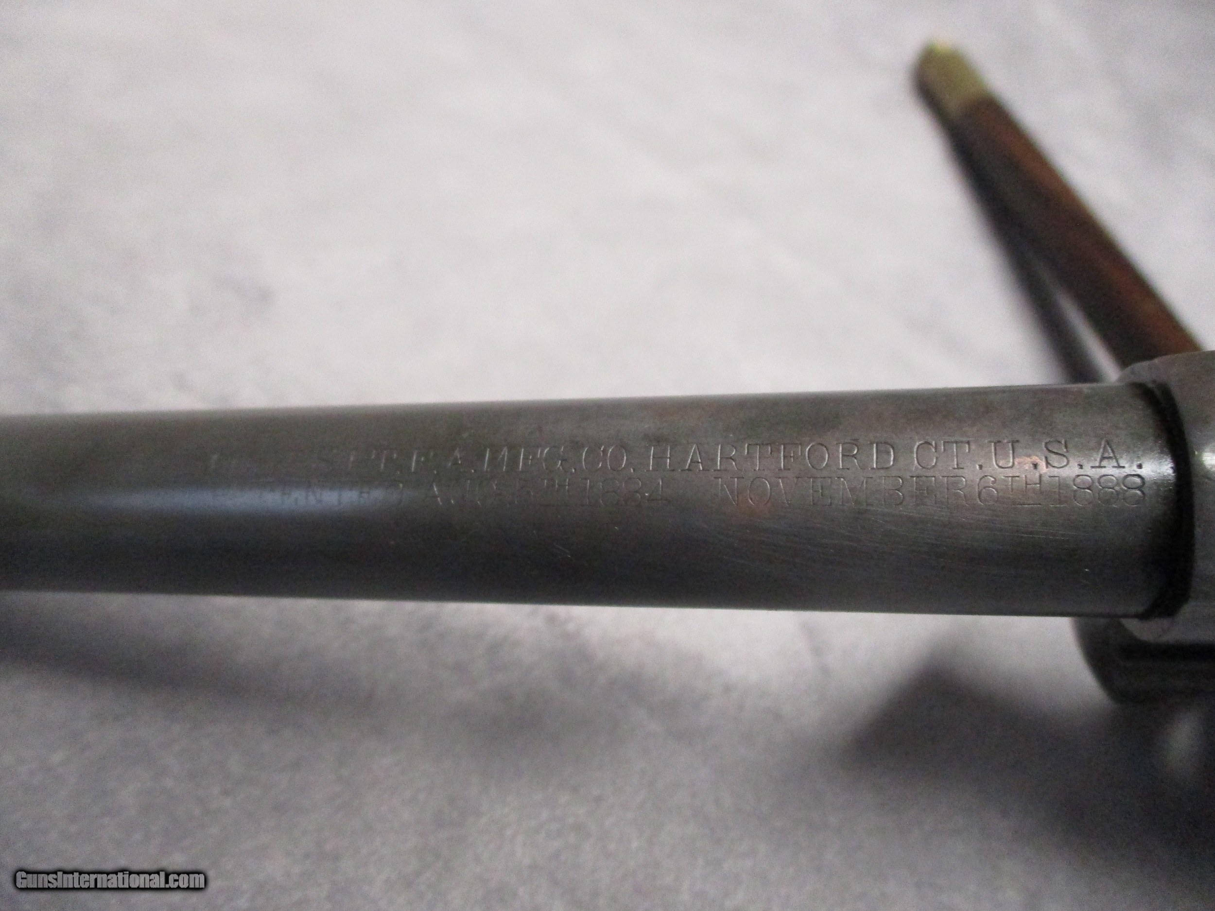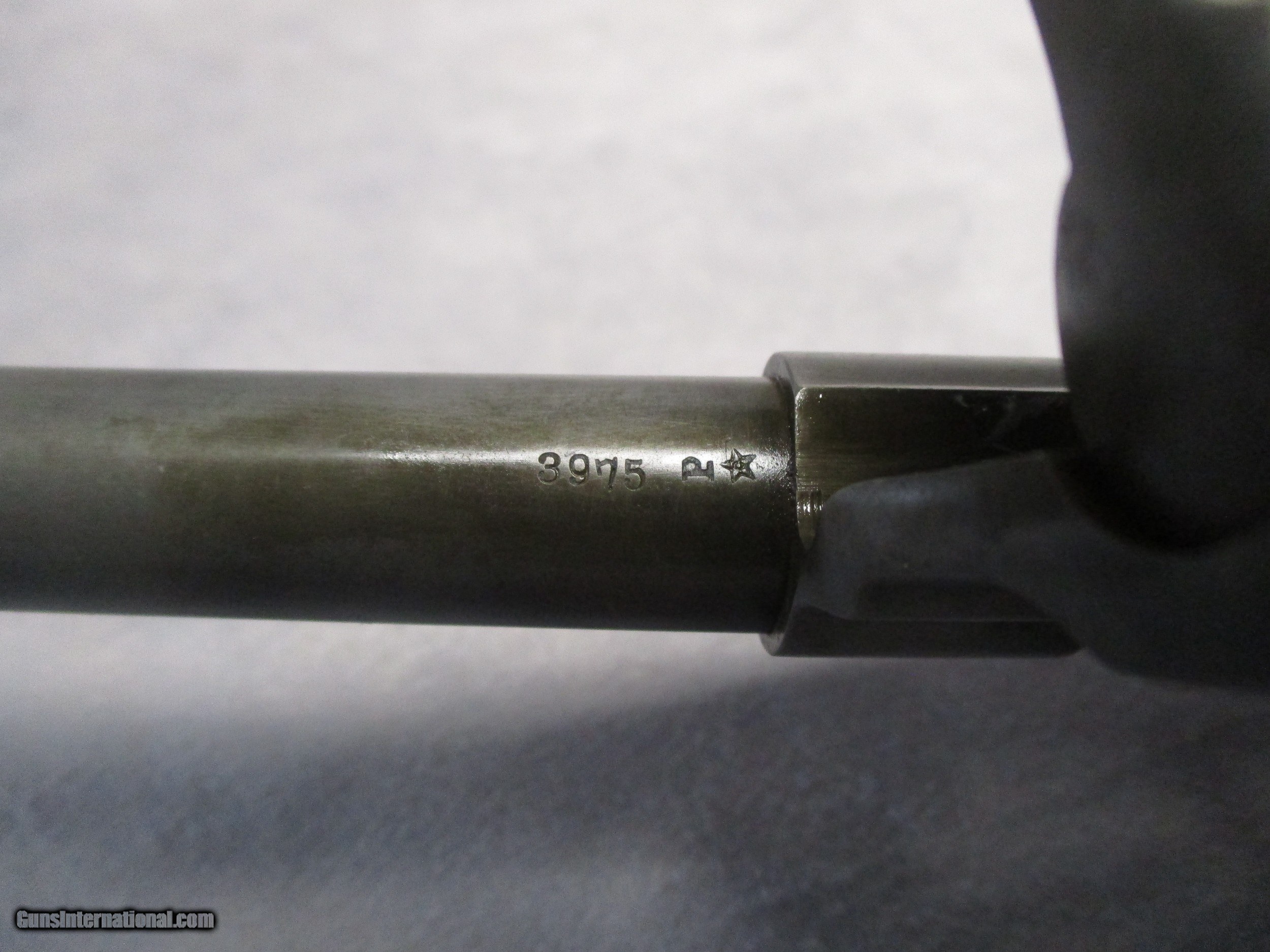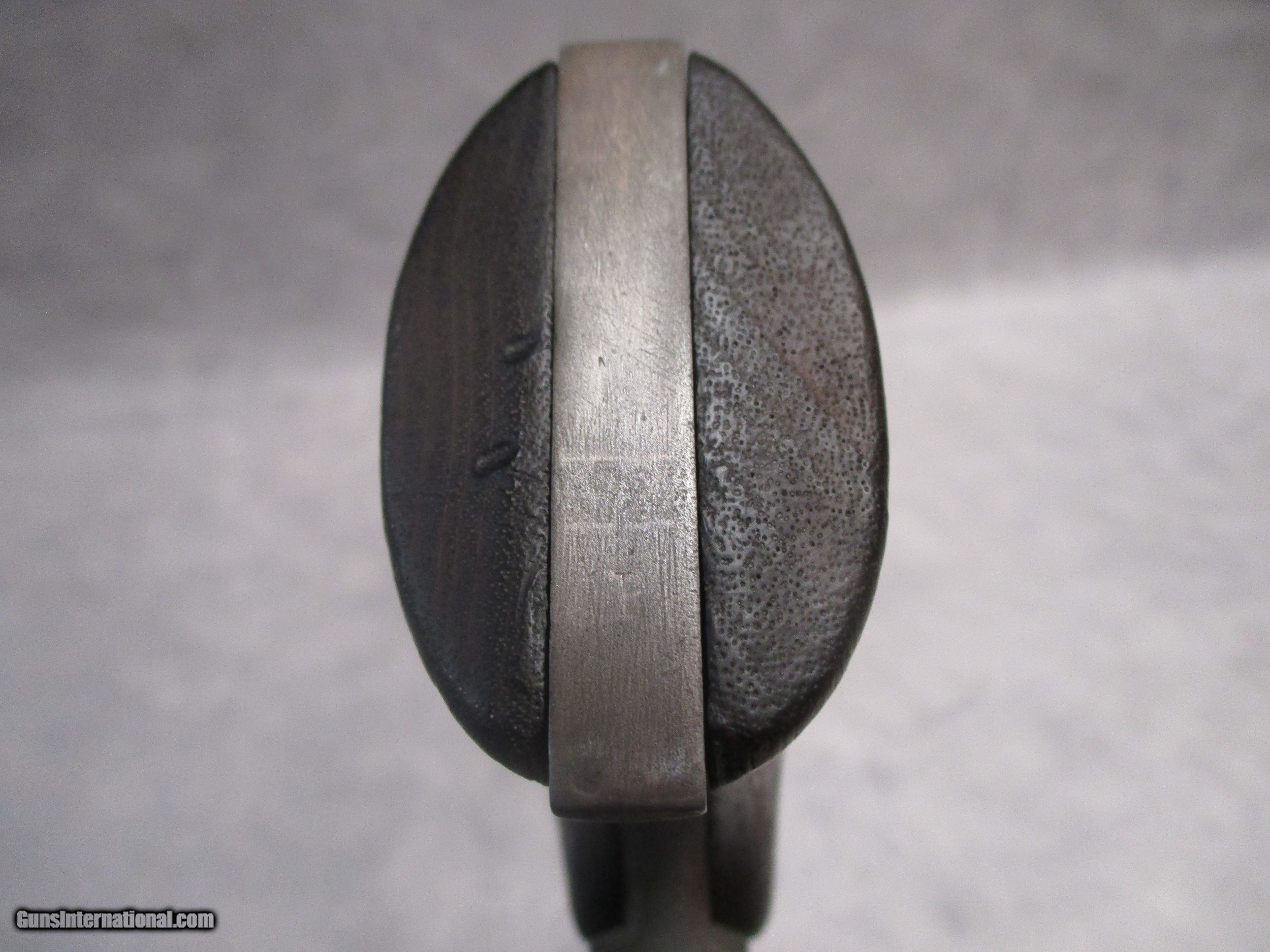 Description: The Colt Model 1889 was the first double-action revolver to use a swing out cylinder, released by a sliding latch. It predated the Smith & Wesson Hand Ejector by almost a decade. The 1889 and the later Model 1892 and its siblings differed from later Colt revolvers in that the cylinder rotated counter-clockwise rather than clockwise. It was found in use that the direction of rotation worked against the cylinder lock and tended to push the cylinder out of alignment with the barrel. Not only did this weakness allow the cylinder to rotate while the trigger was being pulled by the user, it even allowed the cylinder to rotate while holstered. The U.S. Navy contracted Colt to build them 5000 examples of the Model 1889. According to renowned author Robert Best (Book: A Study of Colt’s New Army and Navy Pattern DA Revolvers 1889 to 1908), out of the 5000 revolvers that were built for the Navy, 4627 of these were returned to Colt for conversion to the 1895 cylinder and locking system. This particular revolver, after some correspondence with Mr. Best, is believed to be one of the 373 revolvers that escaped conversion, which would make it one of only 7 still known to exist. Correspondence was done by the previous owner out of necessity of the fact that just prior to being sold by the Navy to the civilian market, the military markings were sanded down. It is important to understand that Colt military revolvers often have two serial numbers. One is the Colt factory serial number, the other the military, or in this case, the U.S. Navy’s serial number. On early examples, the two are often one and the same. However, the inspector, W.W. Kimbal, would sometimes reject the presented revolver and move onto the next one. A revolver would only be stamped with a Navy serial number if it was accepted and would also be stamped with the inspector’s initials (W.W.K.) as well. On this revolver, the Colt factory serial number 3975 appears on the rear of the cylinder, the cylinder release lever, on the yoke and inside of the frame, the bottom of the barrel, and underneath the side plate. The military serial number would only be on the bottom of the grip. After close examination, and correspondence with Mr. Best (by the previous owner), it is believed that this revolver is U.S. Navy serial number 3732. Personal examination of the revolver results in the same conclusion. The barrel is marked with the correct August 5th, 1884 and November 6th, 1888 patent dates. The original finish is worn away, which is not wholly unusual for a revolver this old. According to the Colt Serial Number database, this M1889 left the factory in 1889 (not surprising as Colt would have endeavored to complete the order for the Navy as quickly as possible), thus making the revolver 133 years old. Despite its age, the bore is in excellent shape with only minor pitting, or not enough to affect accuracy. However, for safety reasons it recommended that this revolver never be fired given its age and the era of metallurgy from which it originated. The lower front tip of each grip is chipped away but otherwise the grips are in fairly good shape. The trigger and hammer function great but the cylinder latch is a little stiff sometimes. SOLD Handgun Caliber: .38 Long Colt Manufacturer: Colt's PT. F.A. Mfg. Co. Model: Model 1889 U.S. Navy issue Serial Number: Military S/N: 3732; Colt Factory S/N: 3975 Bore: Rifled Chambers: 6 Ejectors: Manual, simultaneous 6-round ejection Condition: Fair to Good Barrel Type: Round Action: Double/Single Action Triggers: Single Stock: Walnut Finish: Patina Sights: Fixed sights, half-moon front sight, U-notch rear, sight radius 7.25 inches (184 mm) Manufacture Date: 1889 Case: Soft Case |