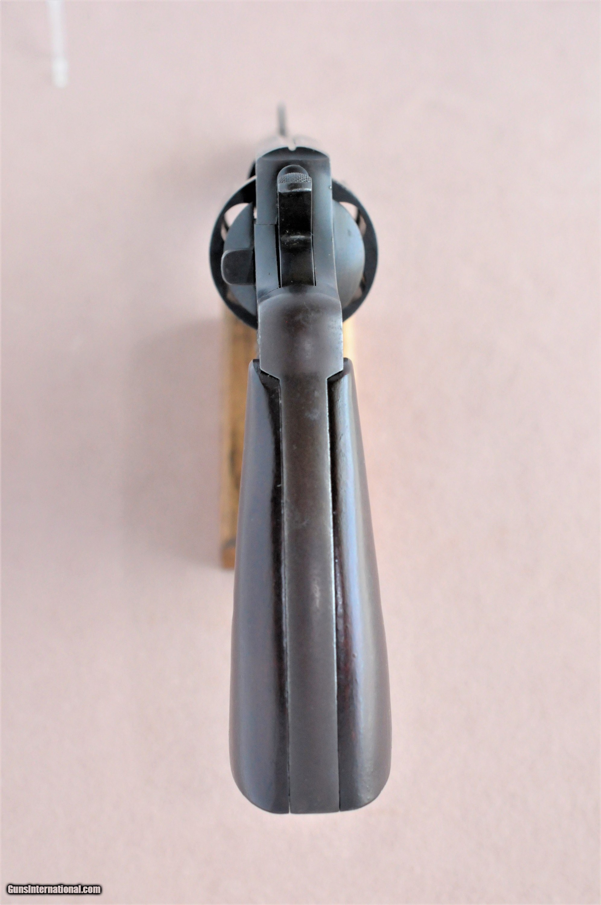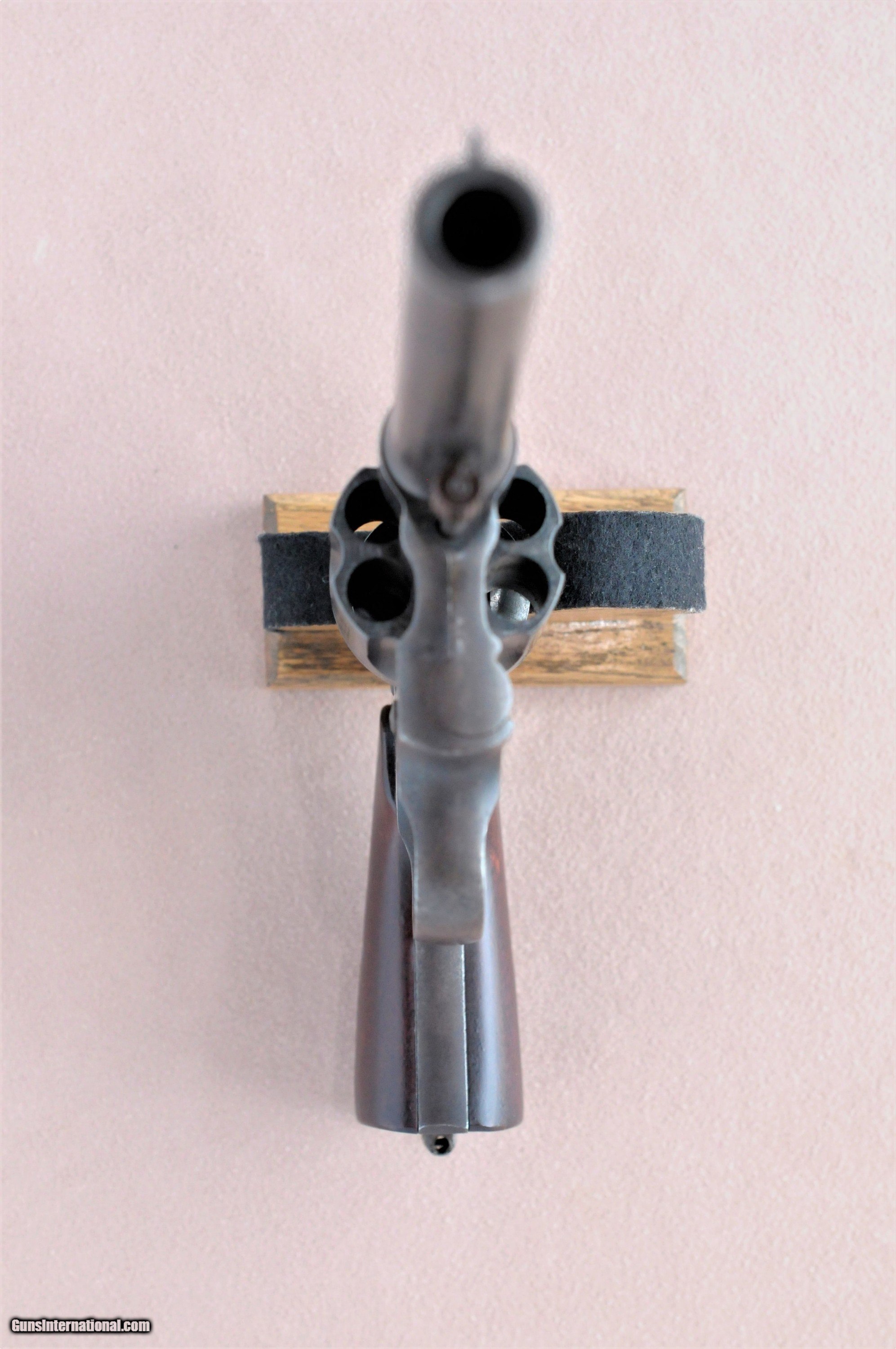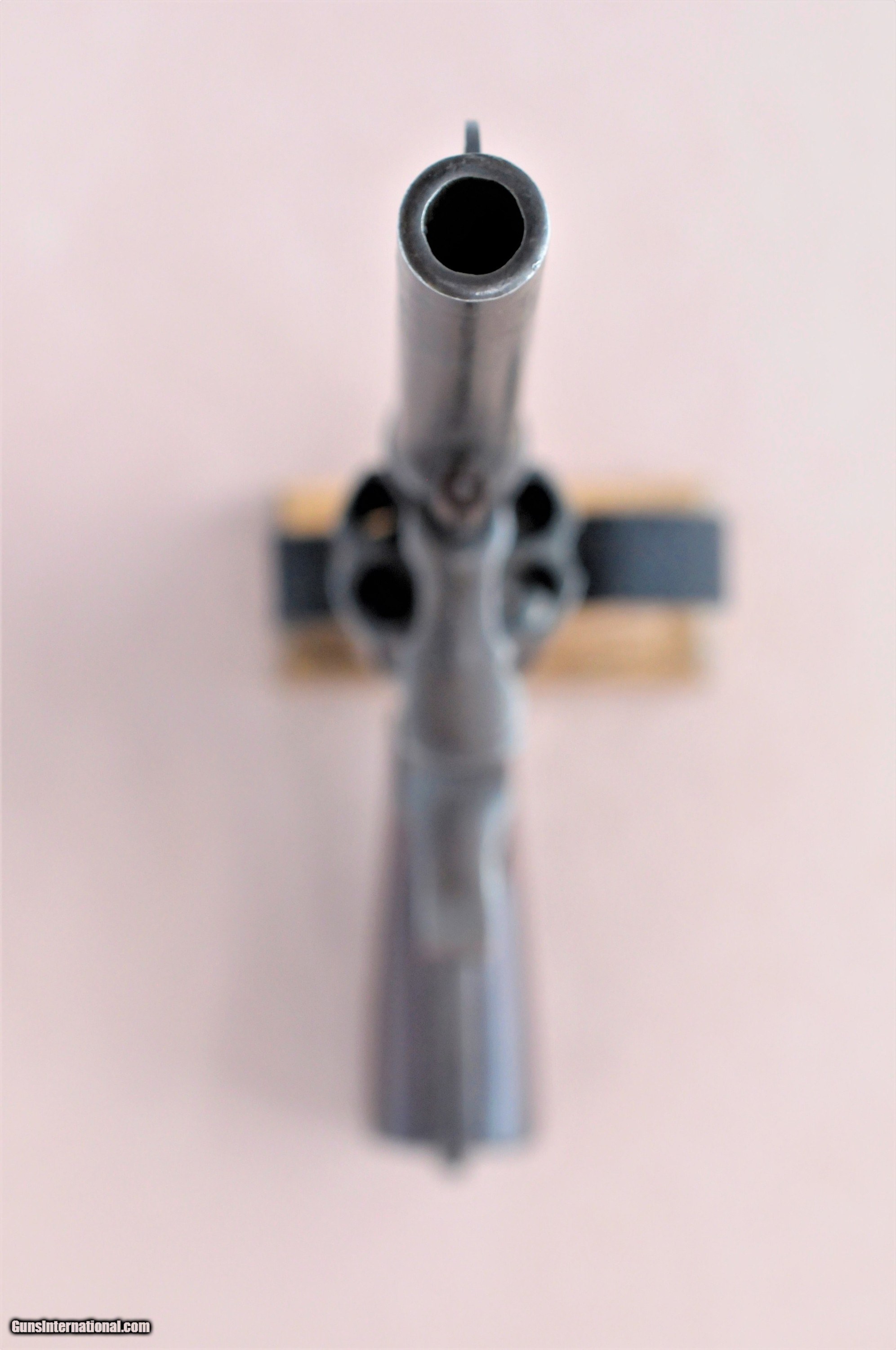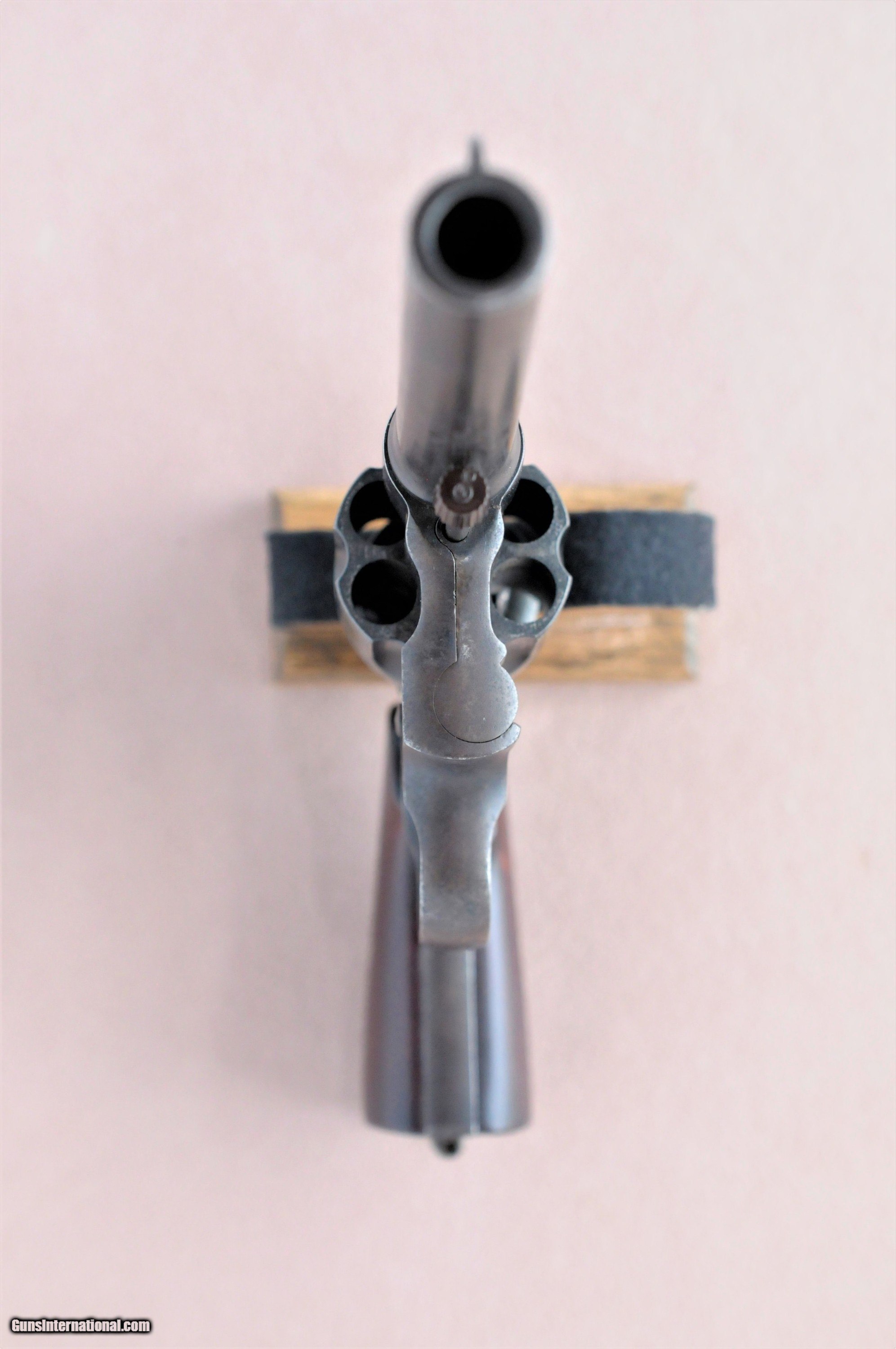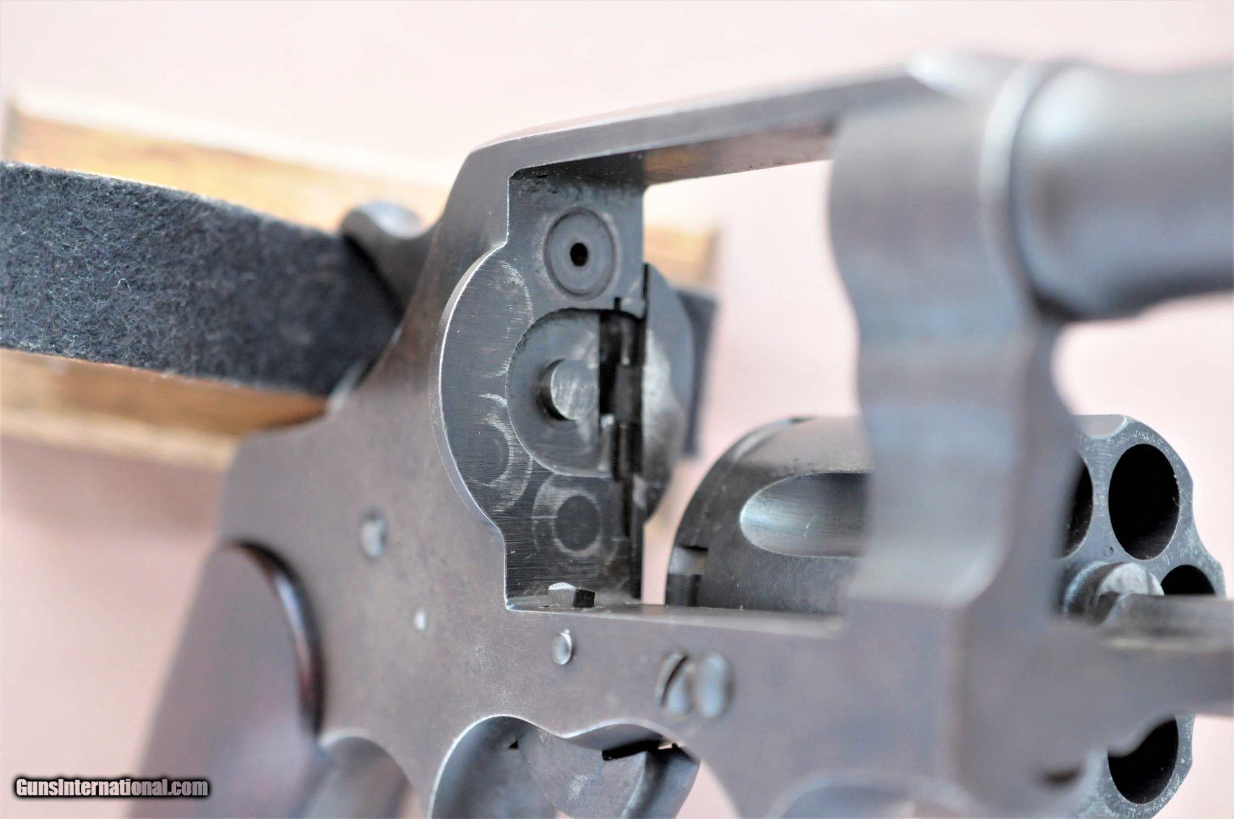Description: This is a WW1 production U.S. Army Colt New Service Model 1917 revolver in .45ACP. The Model 1917 revolver was put into production during WW1 in 1917 as a supplement to the U.S. Military's standard issue Model 1911 .45 ACP automatic pistol. There simply were not enough 1911's in inventory or in production to arm the rapidly expanding A.E.F. forces during World War One. The Model 1917 revolver was manufactured by both Smith and Wesson and the Colt during WW1, with Colt being the primary supplier. This particular example was built in 1918, and is in all-original condition with about 70% of the bluing remaining. The cylinder shows the typical minor handling marks and drag line one can expect from a military issued revolver. The action is tight on this gun and is in perfect time The barrel has strong lands and grooves throughout the bore with a little frosting throughout. The Walnut grips on this gun appear to be post-war aftermarket replacements. This Model 1917 comes complete with an unmarked U.S.G.I. style holster. The leather is still supple with a rich tan color throughout showing only minor surface wear in places. All of the original stitching is intact and tight with the original hardware still intact. SOLD Curio/Relic: Yes Manufacturer: Colt Model: 1917 Caliber Info: .45 A.C.P. Extras: U.S.G.I. Unmarked Holster |