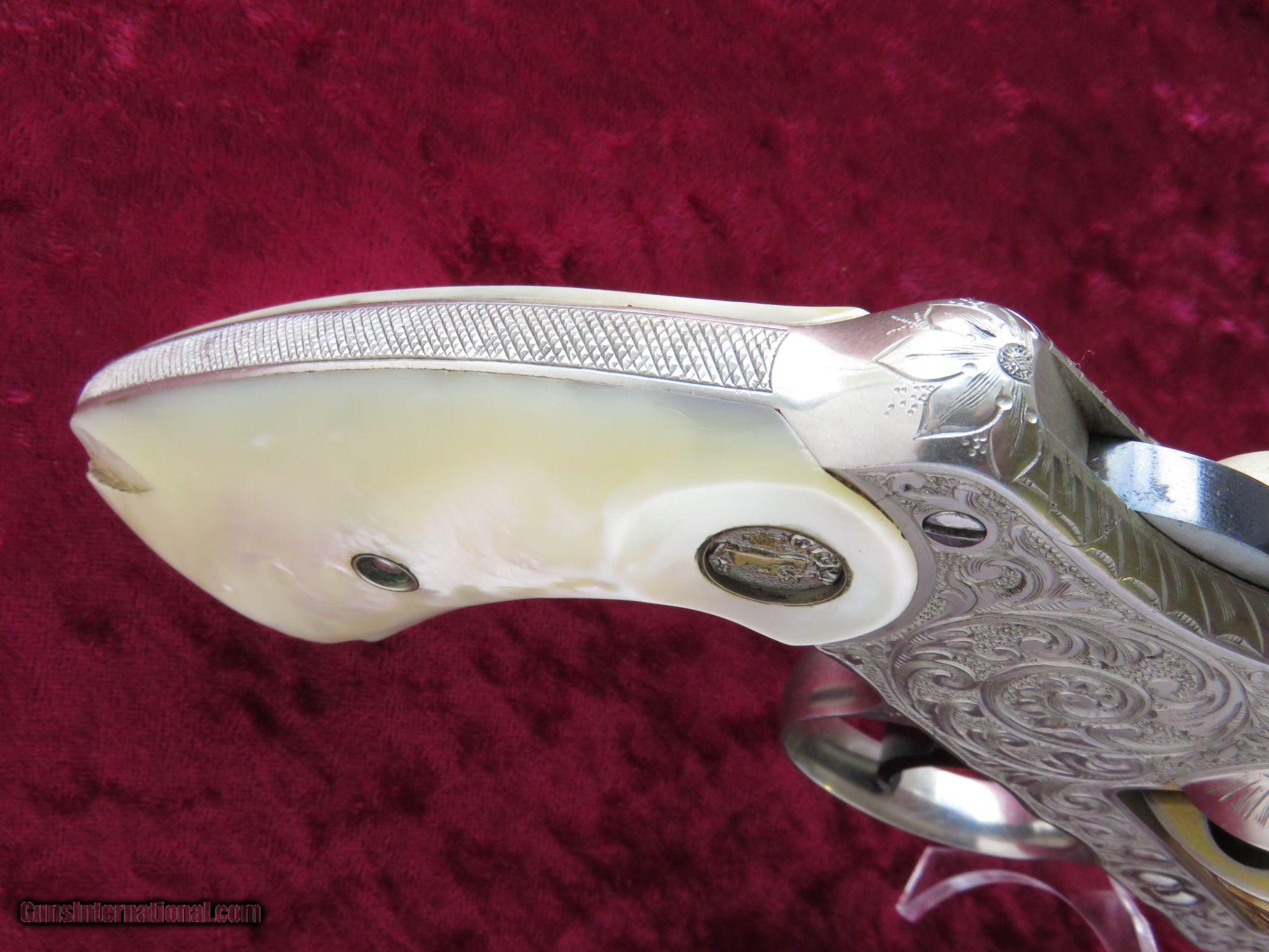 Description: This very special engraved Officers Model is nickel and gold finished (cylinder only), is fitted with a 6 inch barrel with an adjustable front sight for elevation only, and 2-line address, with last patent date of "1905". The flat top frame with an adjustable rear sight for windage only, is inscribed "Dr. W.C. Lyon/U.S. Navy". Revolver is beautifully engraved in New York style, probably from the Cuno Helfricht shop, with full coverage foliate arabesque and floral patterns in the gullets. Foliate arabesque and geometric patterns extend over the barrel, on the butt strap and trigger guard. Top of the hump behind the hammer is engraved in a partial flower blossom with feather patterns around the hammer slot. The cylinder is also engraved in Mr. Helficht's alternating patterns of foliate arabesque and geometric designs with line border around the flutes and a scalloped border around the rear edge. Back strap and trigger are checkered. The trigger, edges of hammer and sights are fire blued. The right rear of the trigger guard is stamped with a 6-point star which indicates factory restored finish, which is probably when the revolver was engraved and refinished. The Colt factory letter (owner could not find at this time) identifies this revolver in caliber .38 Colt with a 6 inch barrel, blue finish, type of stocks not listed and shipped to E.K. Tryon, Jr. & Co., Phila., PA., on Nov 28, 1905 in a 2 gun shipment. The gun is in extremely fine condition and is all matching. Overall it retains virtually all of its factory style refinsh, with some thinning on the cylinder. The beautiful (lots of fire and color) pearl grips fit perfectly and except for a sliver missing from the heel on the right grip are in very fine condition. The bore is bright and the action is crisp and functions perfectly. A very attractive and desirable Colt revolver. PRICE: $14,500 We are Antique & Modern Firearms in Lexington, KY, dealer of fine firearms since 1974. PH. 859-276-1419 We Buy, Sell and Trade Firearms & Knives. Have a Individual Firearm, Firearms Collection, or Firearms Estate to sell, let us know, we can buy or consignment sell it for you. (sales at am-firearms) SOLD Curio/Relic: Yes |