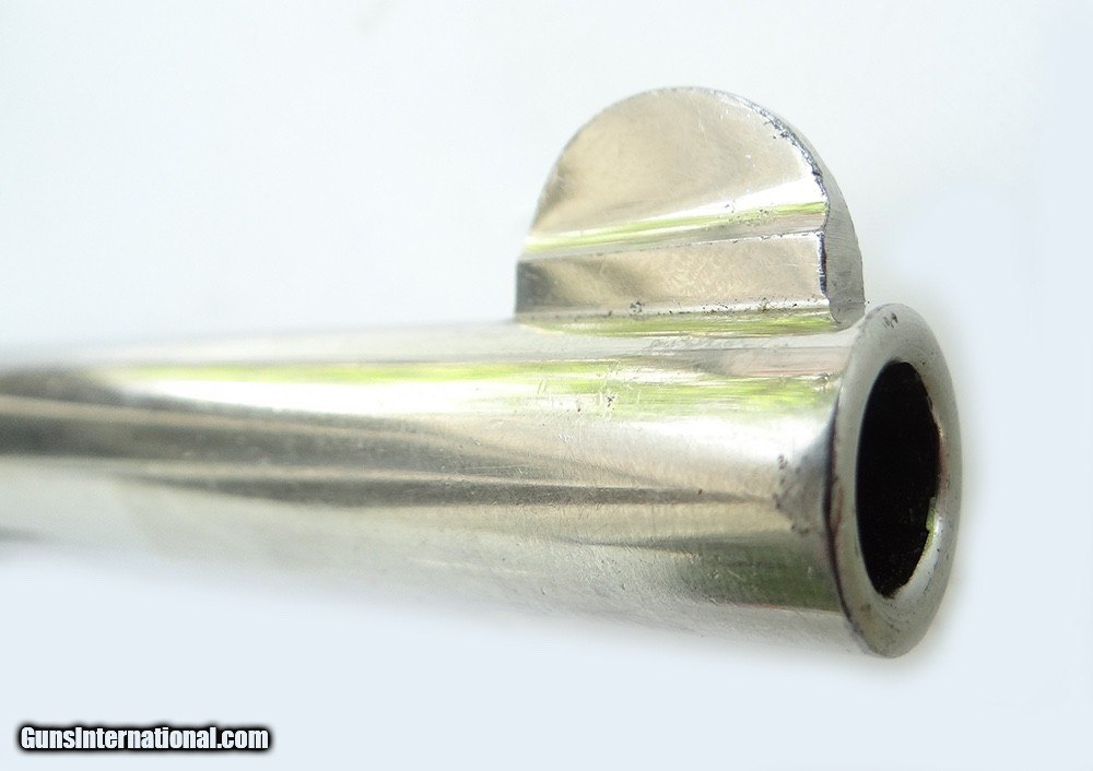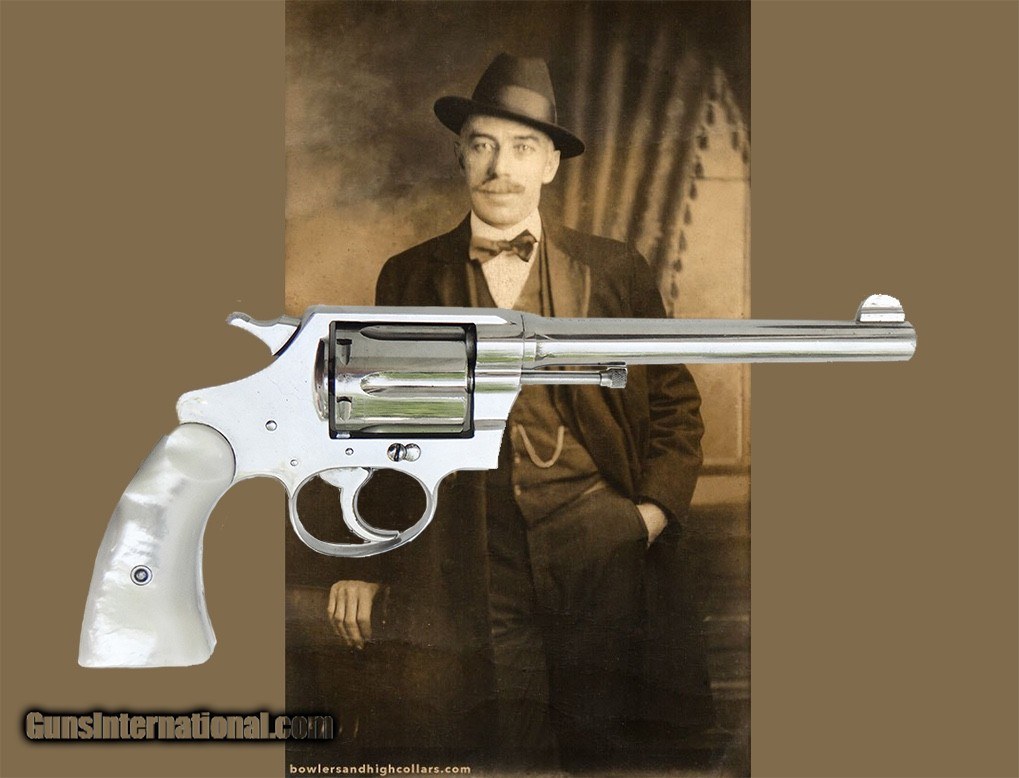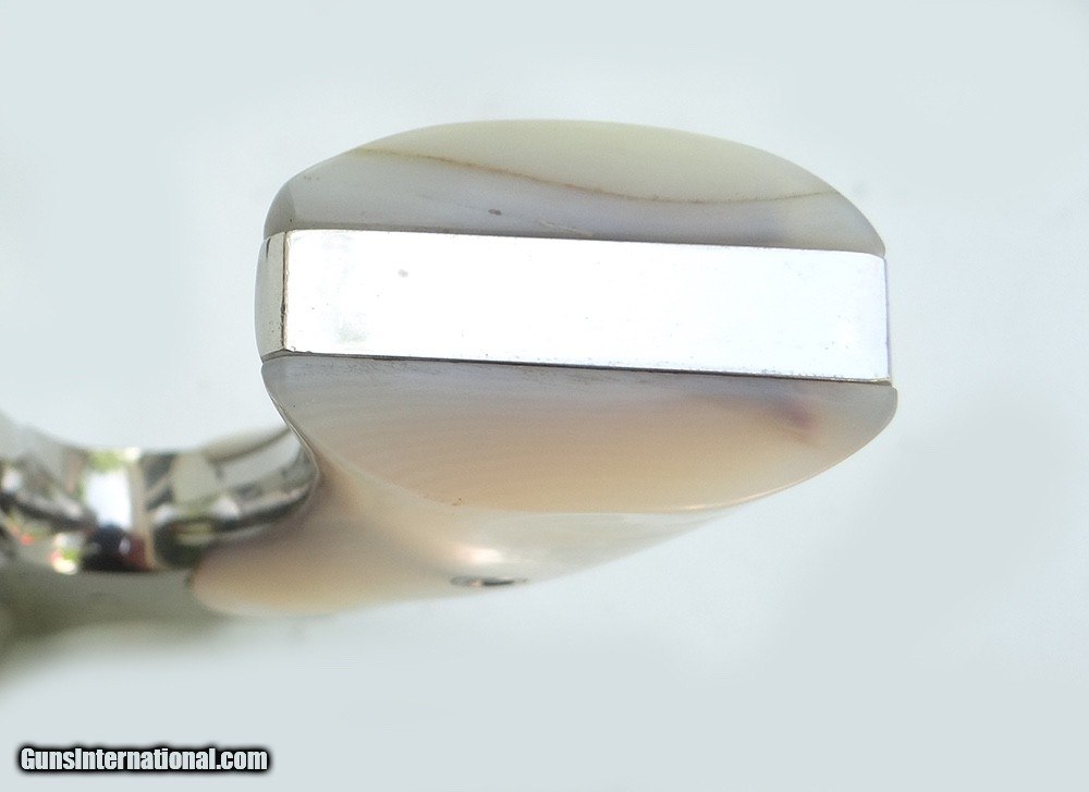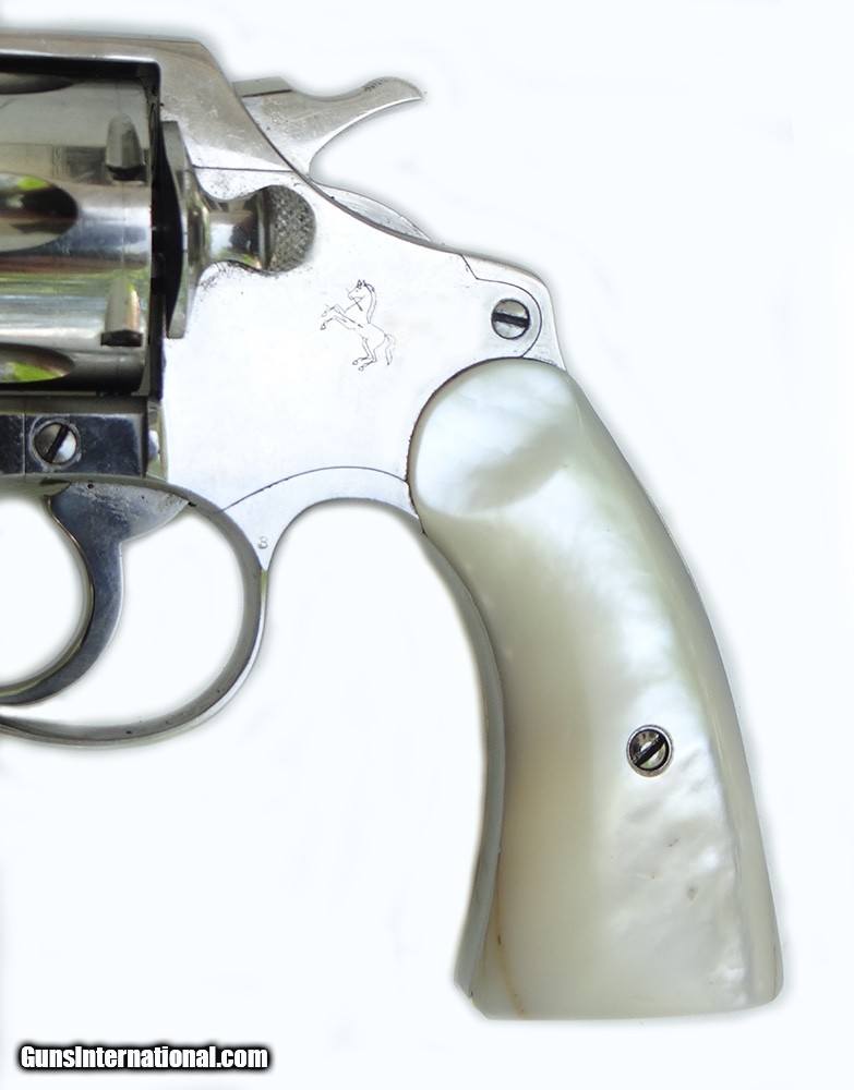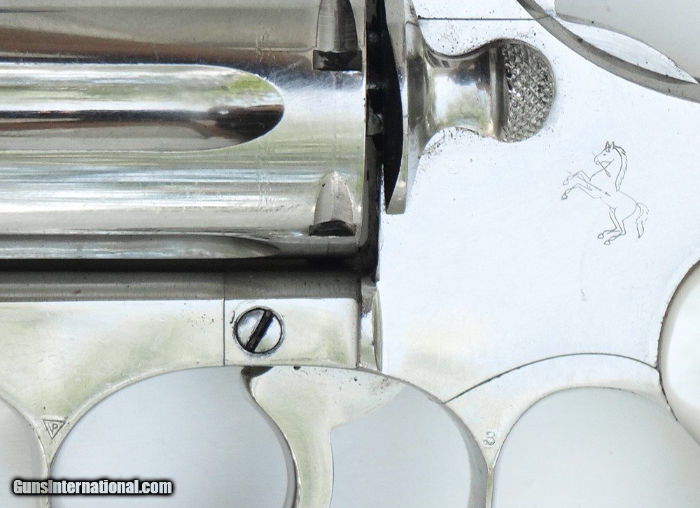 Description: An exceptional factory original nickel plated Colt Police Positive Special built in 1928, with 6" bbl. , in .38 Special caliber, with lovely mother of pearl grips. Colt Police Positive Special revolvers were popular personal sidearms in 1928 appealing to all sorts from detectives to debutantes on whichever side of the law they might prefer. However the impressive combination of factory nickel finish with 6" barrel is quite scarce, and this one is in exceptional original condition. CONDITION: All metal surfaces retain 99% strong factory original nickel plated finish with a few light handling marks. As one would expect all markings and edges are sharp. The bore and mechanical functions are excellent. This Colt shows only slight evidence of being fired. The mother of pearl grips are quite thick and have a lovely color pattern. This particularly handsome, pristine, and scarce variation Colt Police Positive Special revolver would be an asset to any collection of high condition Colt double action revolvers. It would be hard to equal and harder to up-grade. NOTE: This revolver is being sold as a collector's item and should not be fired without being fully checked by a professional gunsmith.This revolver must be shipped to an FFL, or C&R license holder. It cannot be shipped to any locations that do not recognize C&R licenses such as NYC, NJ, etc. Buyers are fully responsible for abiding by their local firearms regulations. We will not ship outside the USA. For the benefit of foreign buyers we will ship to fully licensed firearms export agent within the USA. SOLD Curio/Relic: Yes Manufacturer: Colt Model: Police Positive Special Caliber Info: .38 Special Condition: excellent original Metal Condition: excellent Bore Condition: excellent Manufacture Date: 1928 |