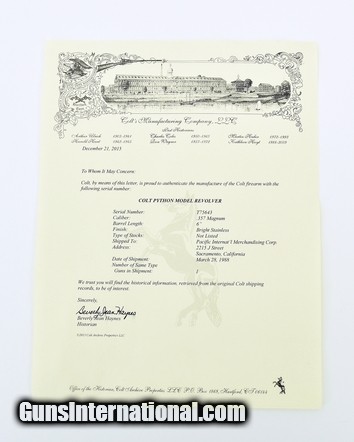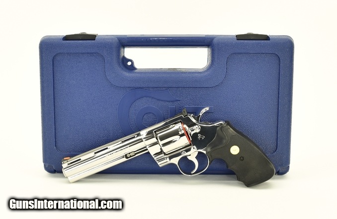 Description: Colt Python .357 Magnum caliber revolver. Scarce 6” Model with bright stainless steel finish. Mint condition with box and factory letter.