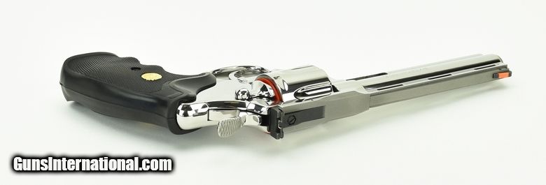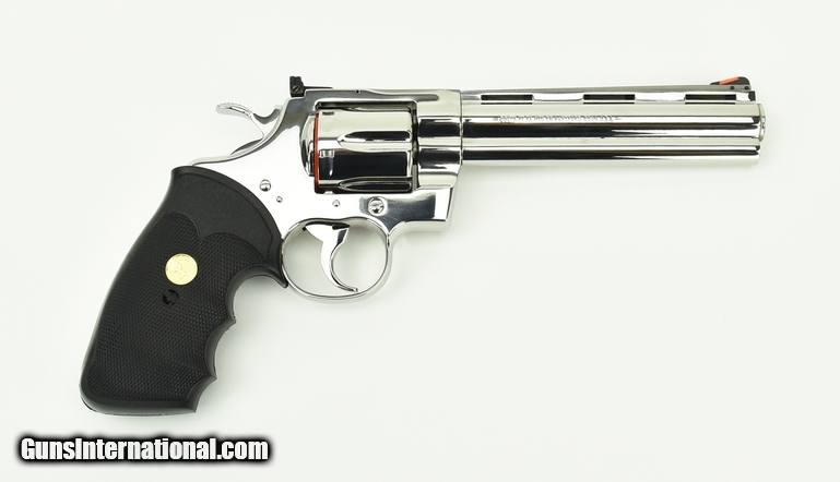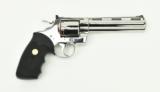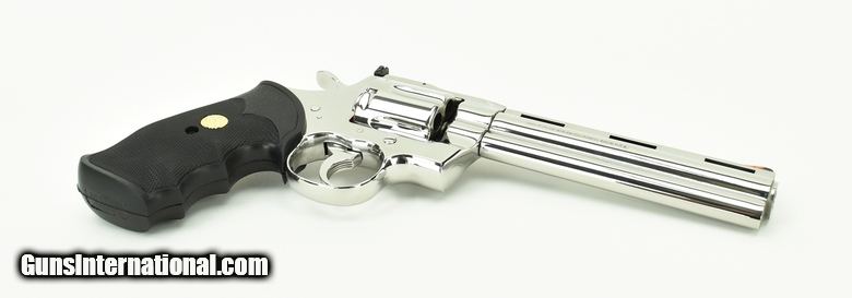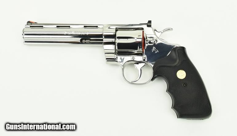 Colt Python .357 Magnum caliber revolver. Scarce 6” Model with bright stainless steel finish. Mint condition with box and factory letter.