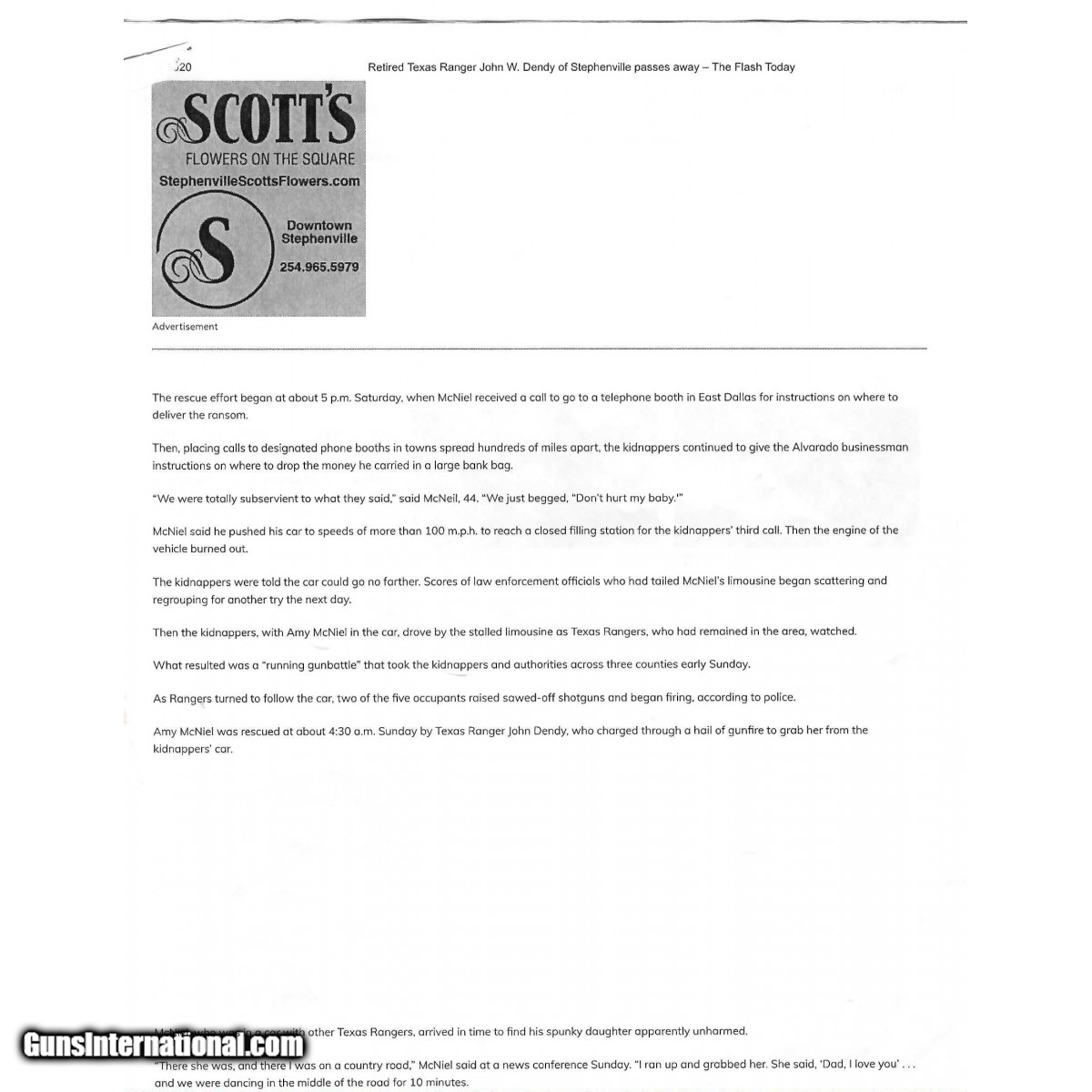 Description: " SN: 59384E. Made in 1977, .357 Magnum with a 4"" barrel. Bore is excellent. A custom engraved Python with a very interesting history. This gun was given to Texas Ranger John Dendy by the grateful father of a 13 year old girl that Ranger Dendy rescued from kidnappers. The gun has scroll engraving with a satin nickel finish and ivory grips. The backstrap is inscribed ""Texas Ranger John Dendy"". The gun comes with a print out of an article explaining the events of the kidnapping and rescue. A beautiful piece with an amazing historical connection. Excellent condition overall. Consignment. SOLD |
