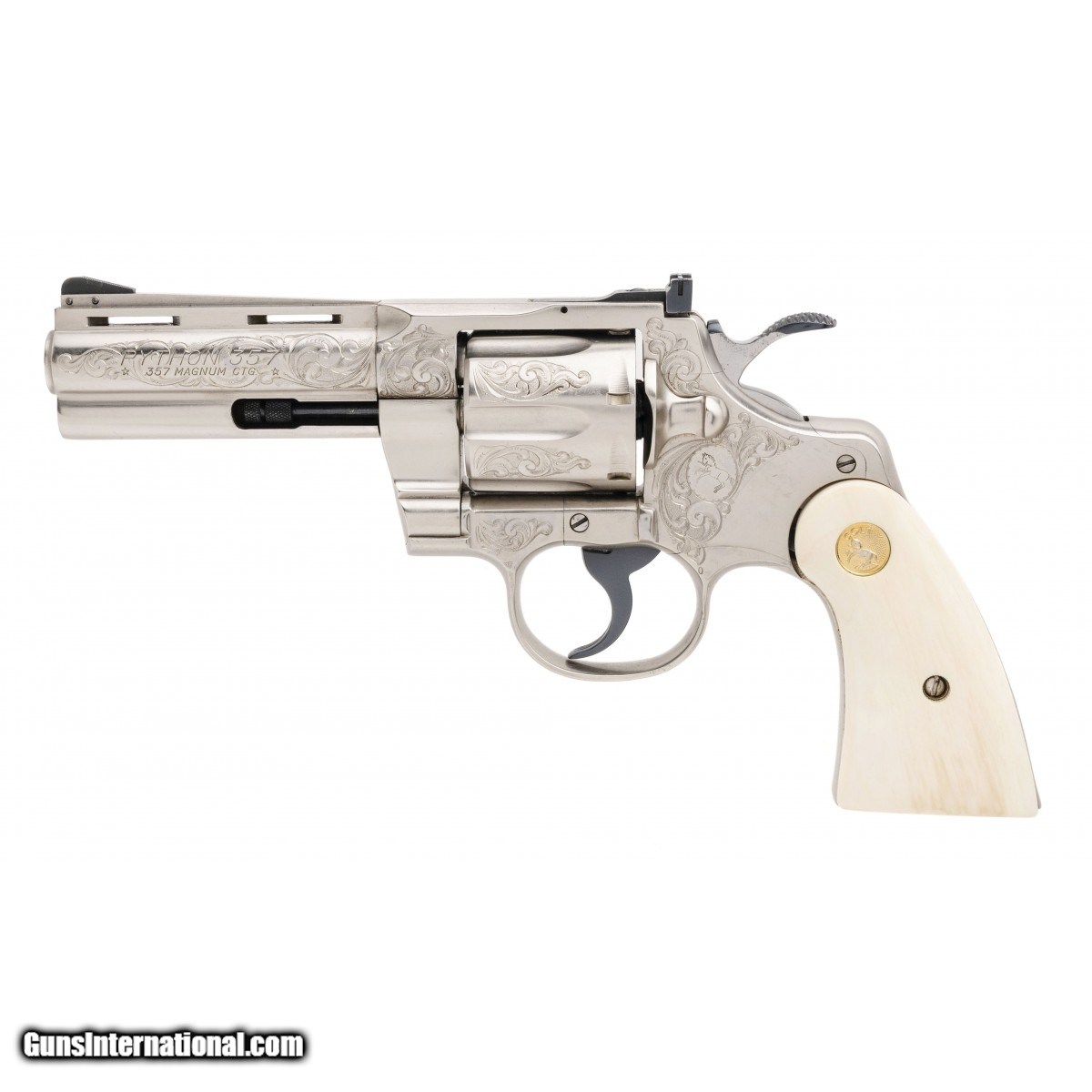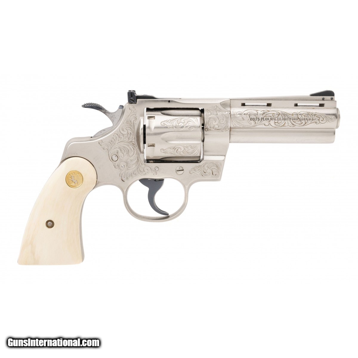 SN: 59384E. Made in 1977, .357 Magnum with a 4"" barrel. Bore is excellent. A custom engraved Python that once belonged to Texas Ranger John Dendy. Ranger Dendy was renowned for taking part in the rescue of a 13 year old girl from kidnappers. The gun has scroll engraving with a satin nickel finish and ivory grips. The backstrap is inscribed ""Texas Ranger John Dendy"". A beautiful piece with a Texas Ranger history. Excellent condition overall. Consignment.