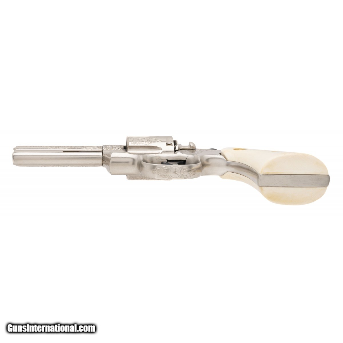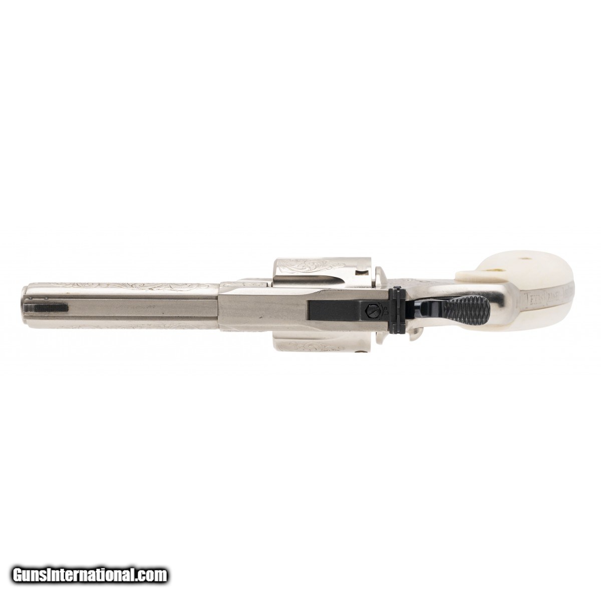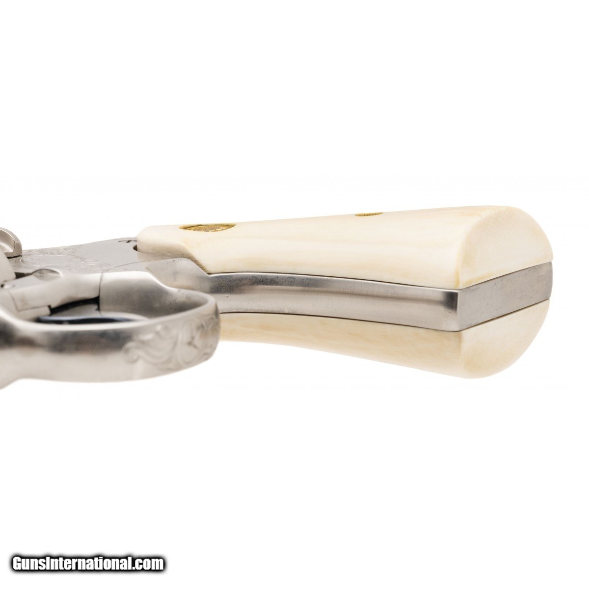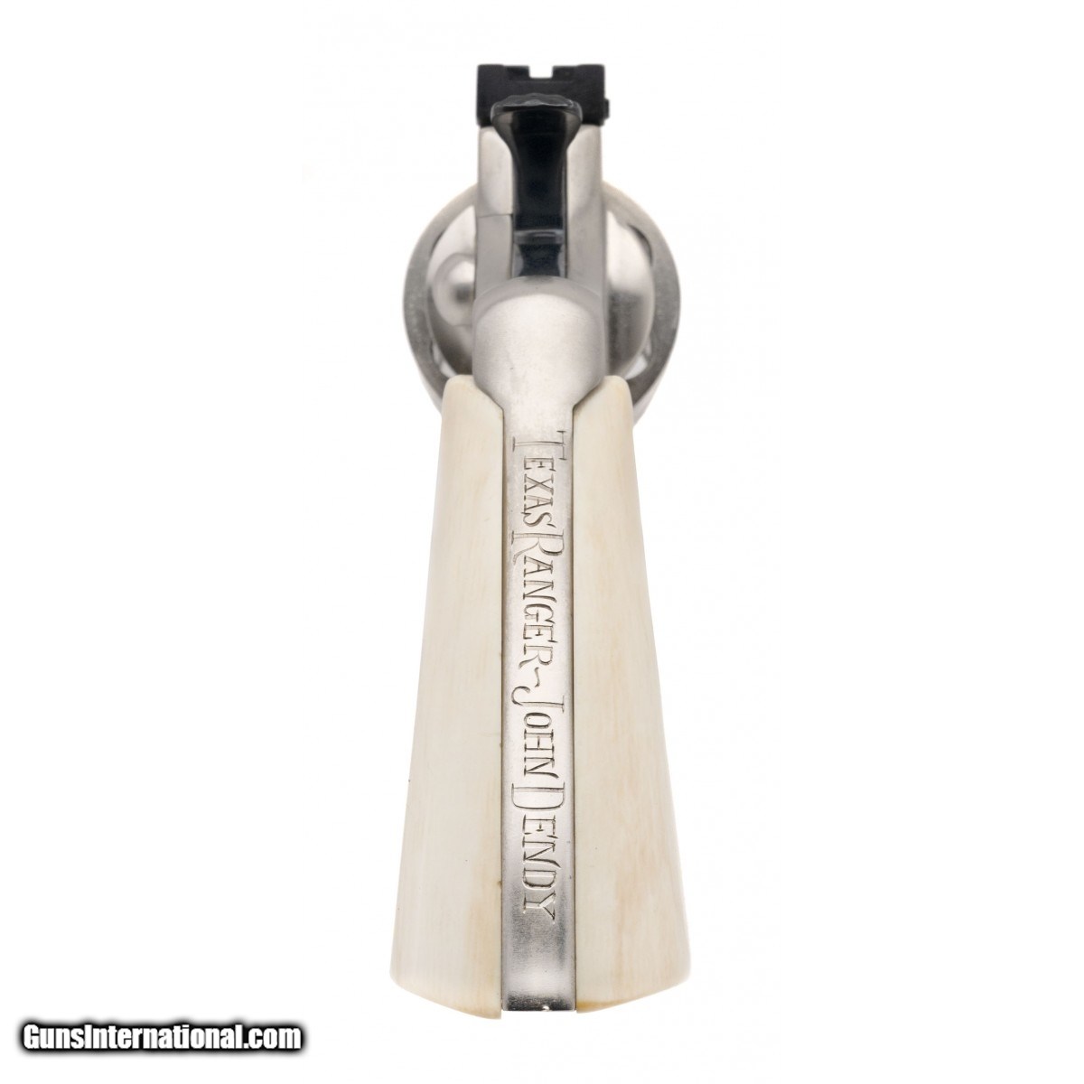 Description: " SN: 59384E. Made in 1977, .357 Magnum with a 4"" barrel. Bore is excellent. A custom engraved Python that once belonged to Texas Ranger John Dendy. Ranger Dendy was renowned for taking part in the rescue of a 13 year old girl from kidnappers. The gun has scroll engraving with a satin nickel finish and ivory grips. The backstrap is inscribed ""Texas Ranger John Dendy"". A beautiful piece with a Texas Ranger history. Excellent condition overall. Consignment. SOLD |