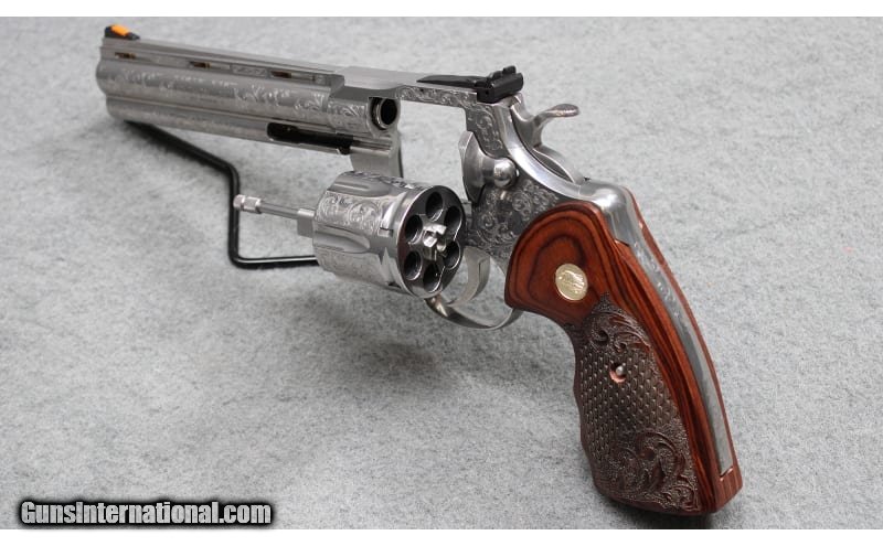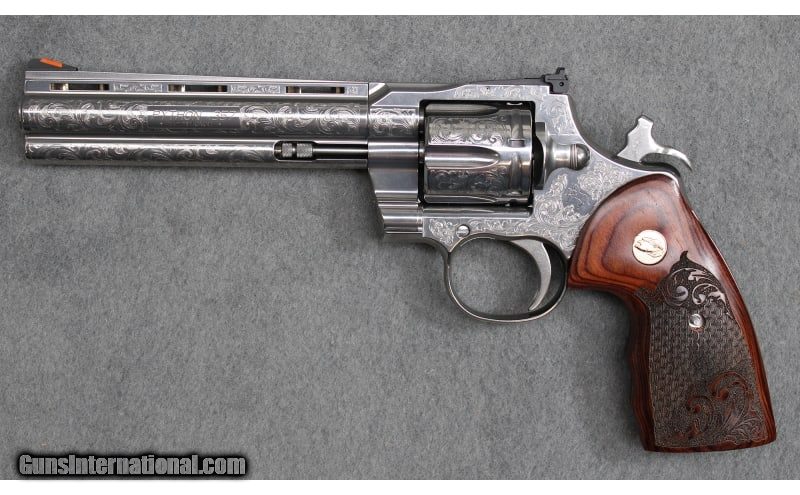Description: Factory engraved Colt Python single/double action revolver chambered in .357 S&W Magnum. Comes in a blue Colt factory hardcase. .357 Magnum SOLD Metal Condition: Very Good with Minor Handling Marks Wood Condition: Very Good with Minor Handling Marks Bore Condition: Bright And Clear with No Pitting Barrels: 6 inch Item Location: Fort Worth, TX |