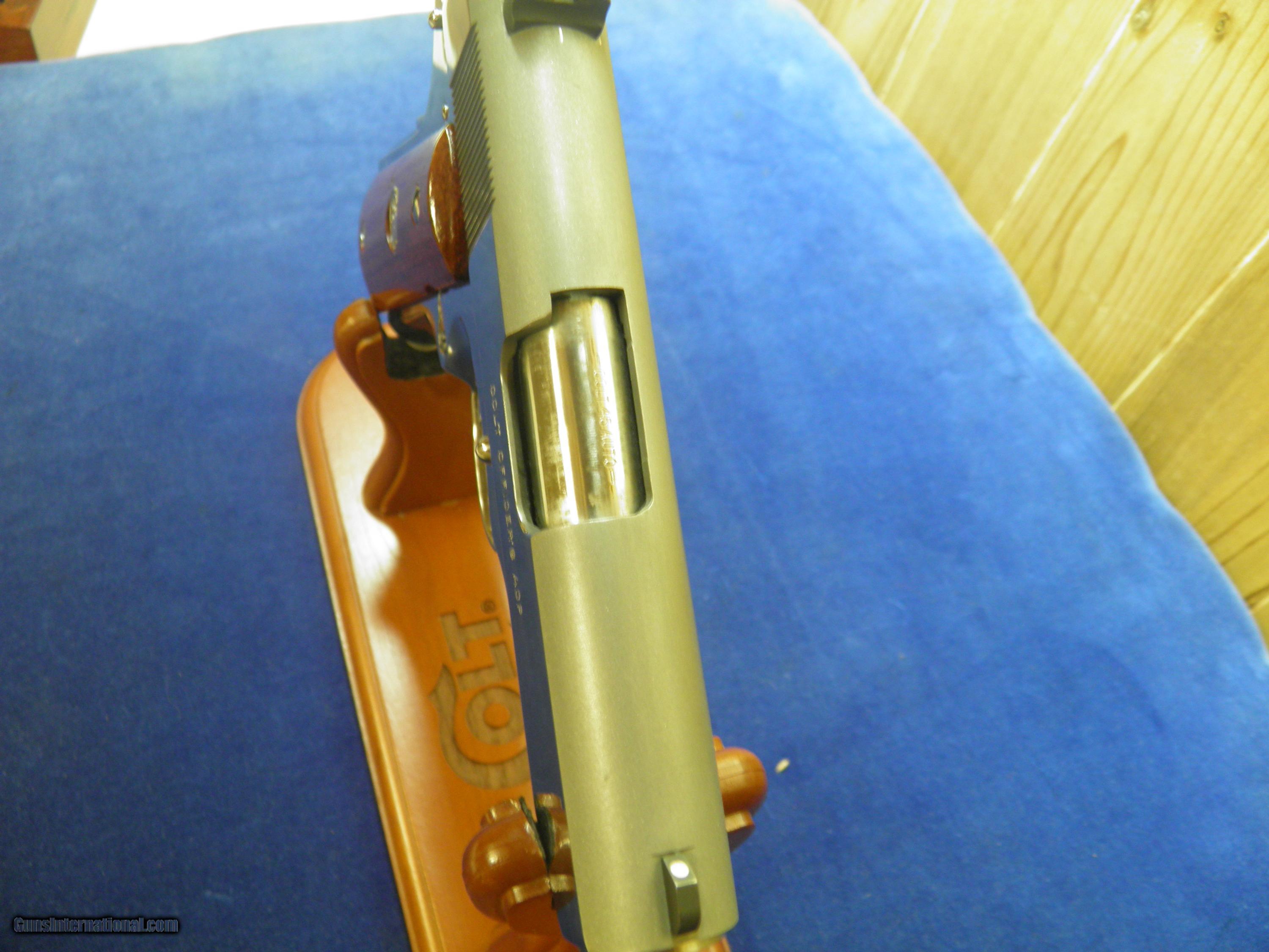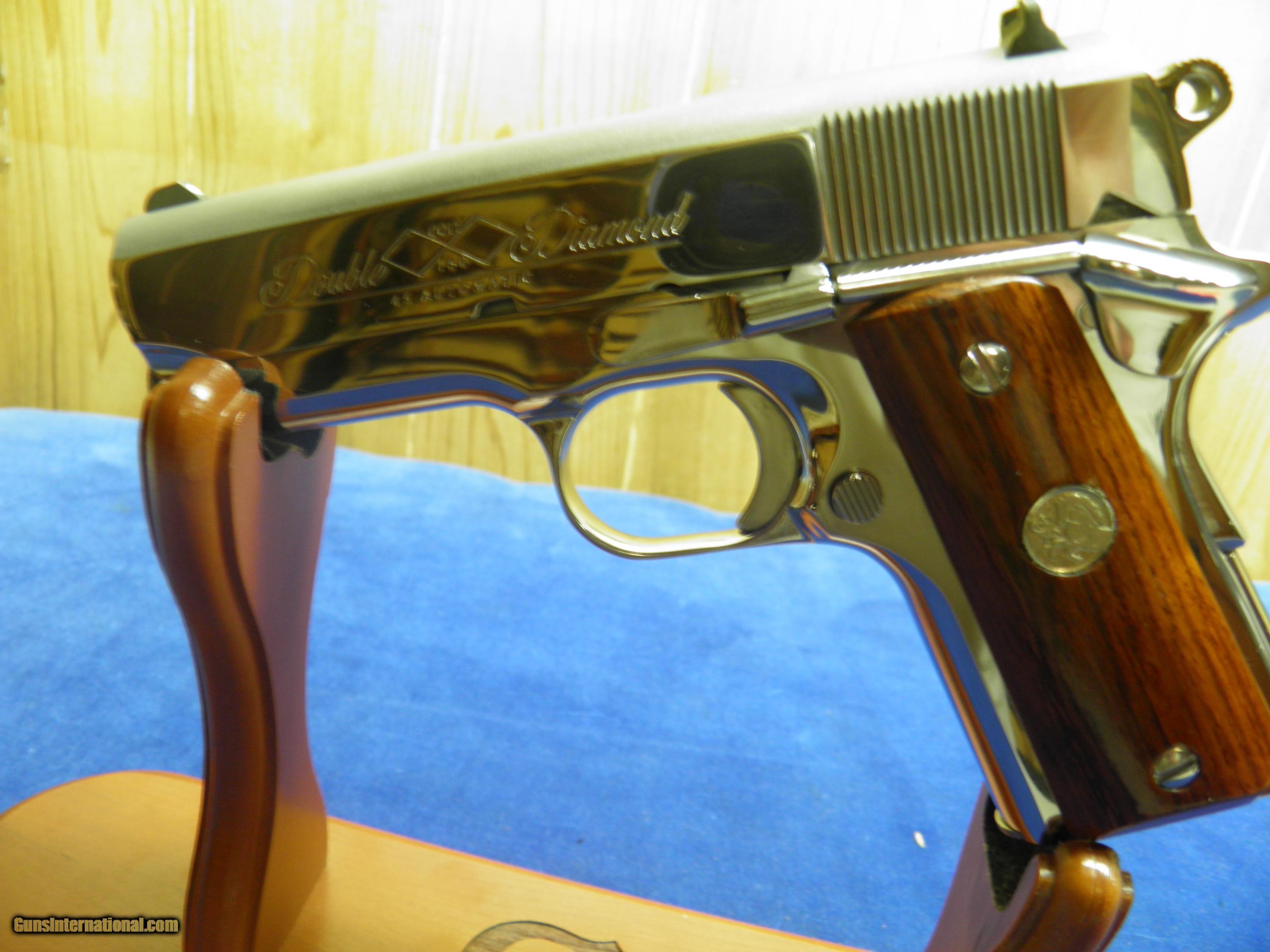 Description: MIKES CUSTOMSHOP IS PROUD TO OFFER UP THIS INCREDIBLE SET, "COLT DOUBLE DIAMONDS" ONLY 1000 OF THESE BEAUTIES WERE PUT TOGETHER IN THE COLT CUSTOM SHOP IN 1986, CONTAINING THE PYTHON 357 MAG. IN 6" AND THE OFFICERS MODEL IN 45 ACP, BOTH FIREARMS FINISHED IN THE ULTIMATE BRIGHT STAINLESS STEEL. BOTH GUNS WEAR FACTORY ROSEWOOD GRIPS WITH THE COLT SILVER MEDALLIONS. THIS SET REMAINS NEW AND UNFIRED IN THEINAL FACTORY LOCKABLE GLASS DISPLAY CASE WITH KEY, ALSO INCLUDES THE FOLLOWING ,OWNERS MANUALS, WARRANTY CARDS, WELCOME LETTER, HANG TAGS, AND OTHER PAPER WORK !! SOLD |