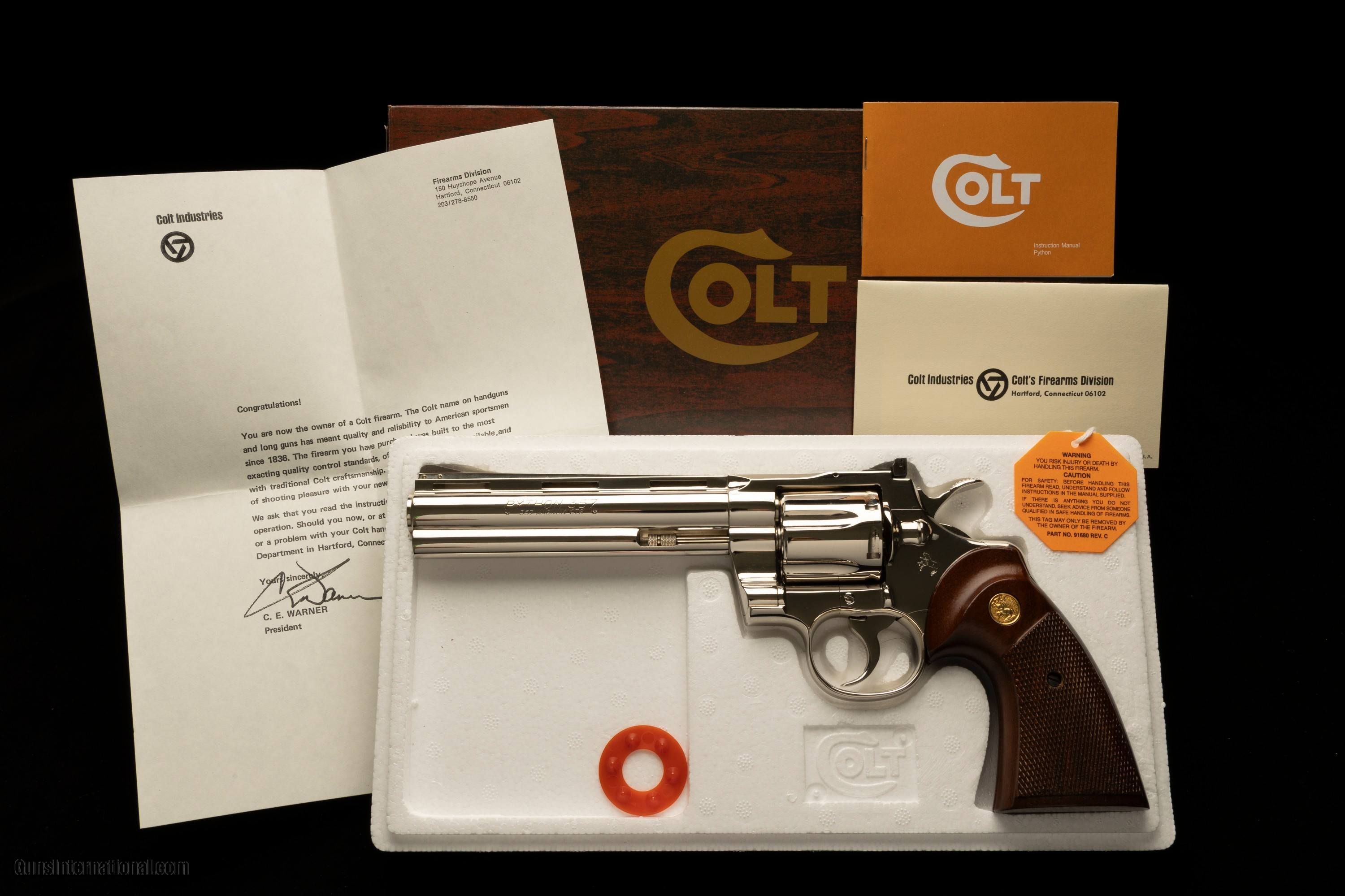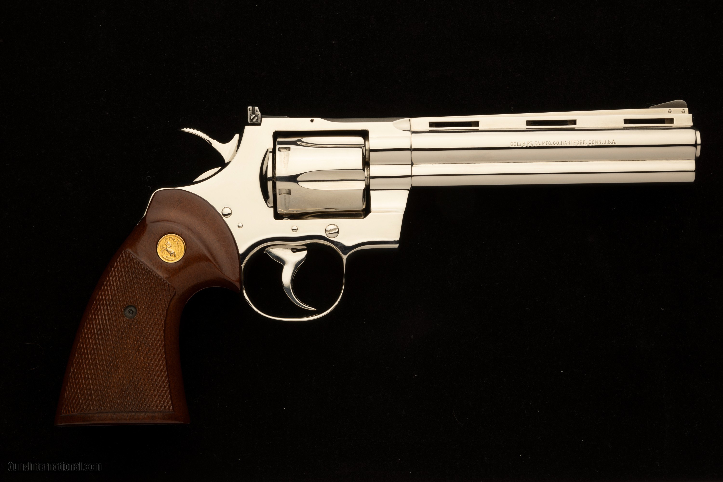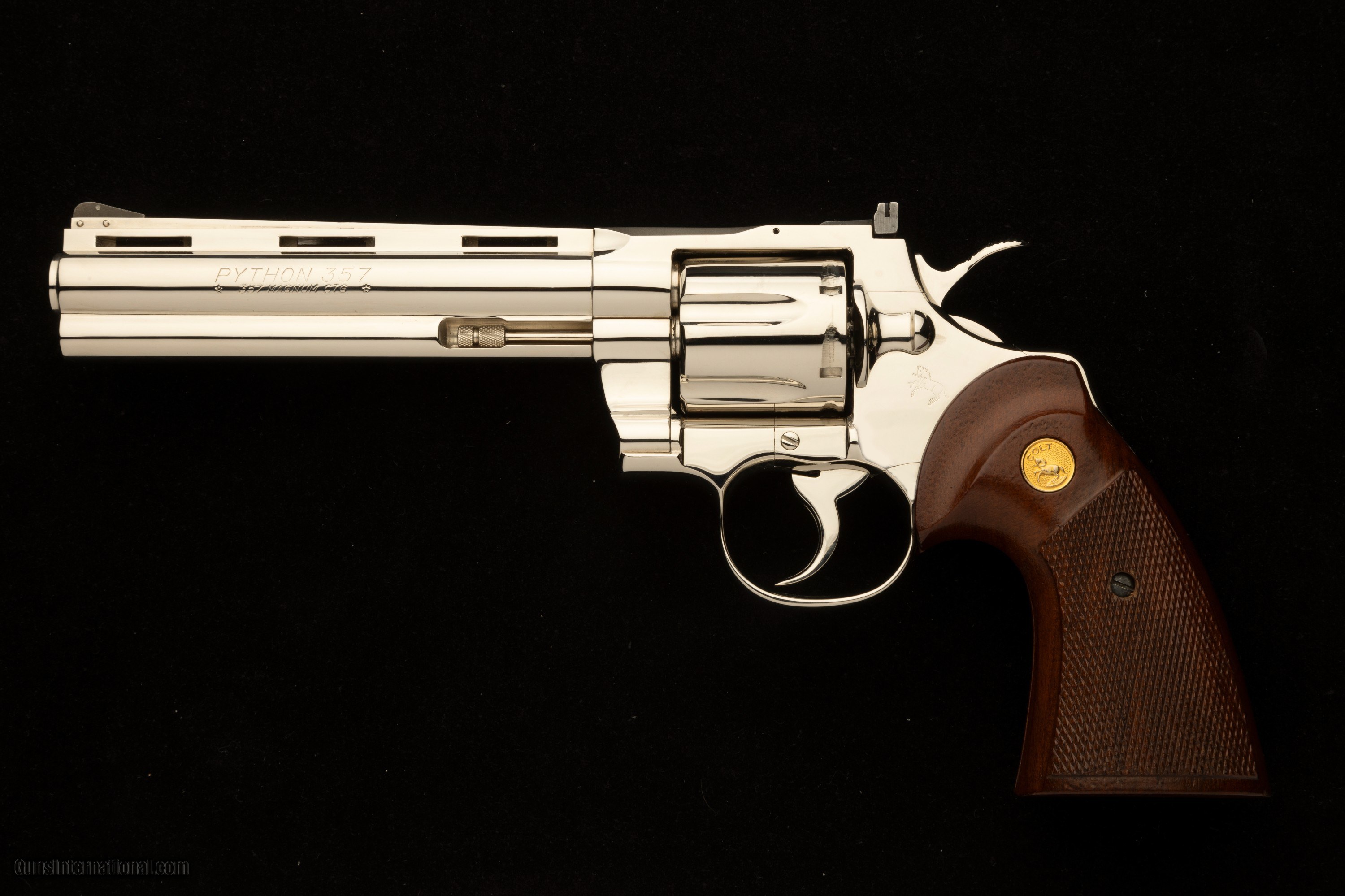 Description: Colt 6" Nickel Flawless Python Manufactureed in 1975. Gun comes with box, warranty card, hang tag, owners manuel and cylinder guard. There are no turn lines or powder burns, There is FREE shipping and three day inspection period. However, buyer pays shipping costs both ways on returns. Seller accepts certified check, moeny order and personal check (item ships after funds clear). Must ship to FFL and sale must comply with all applicable laws. SOLD Handgun Caliber: .357 Magnum Manufacturer: Colt Model: Python Barrel Length: 6 Condition: Excellent/Flawless Finish: Nickel |