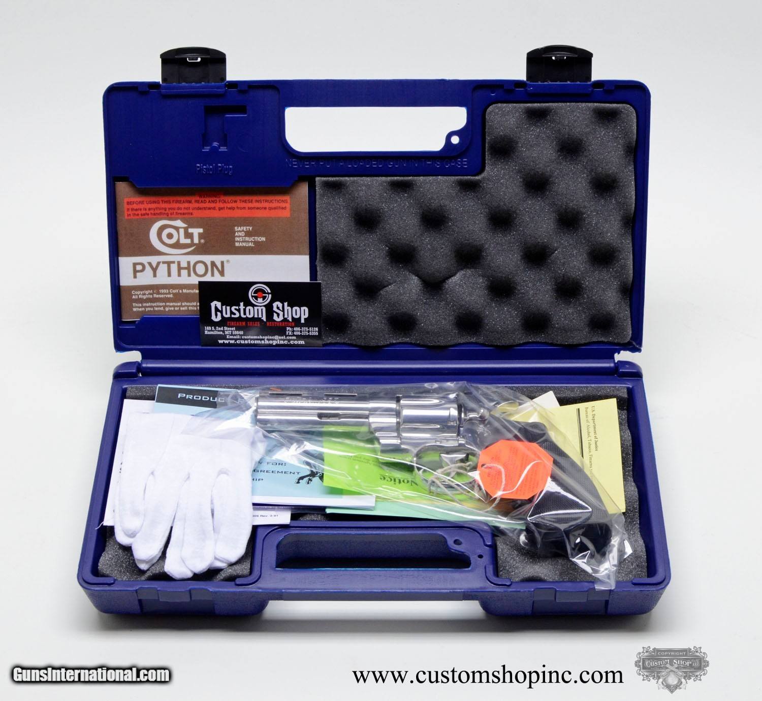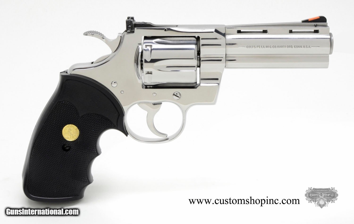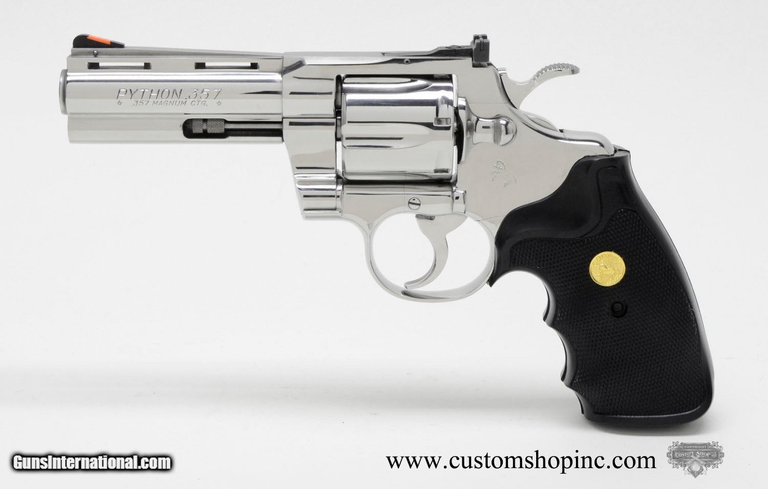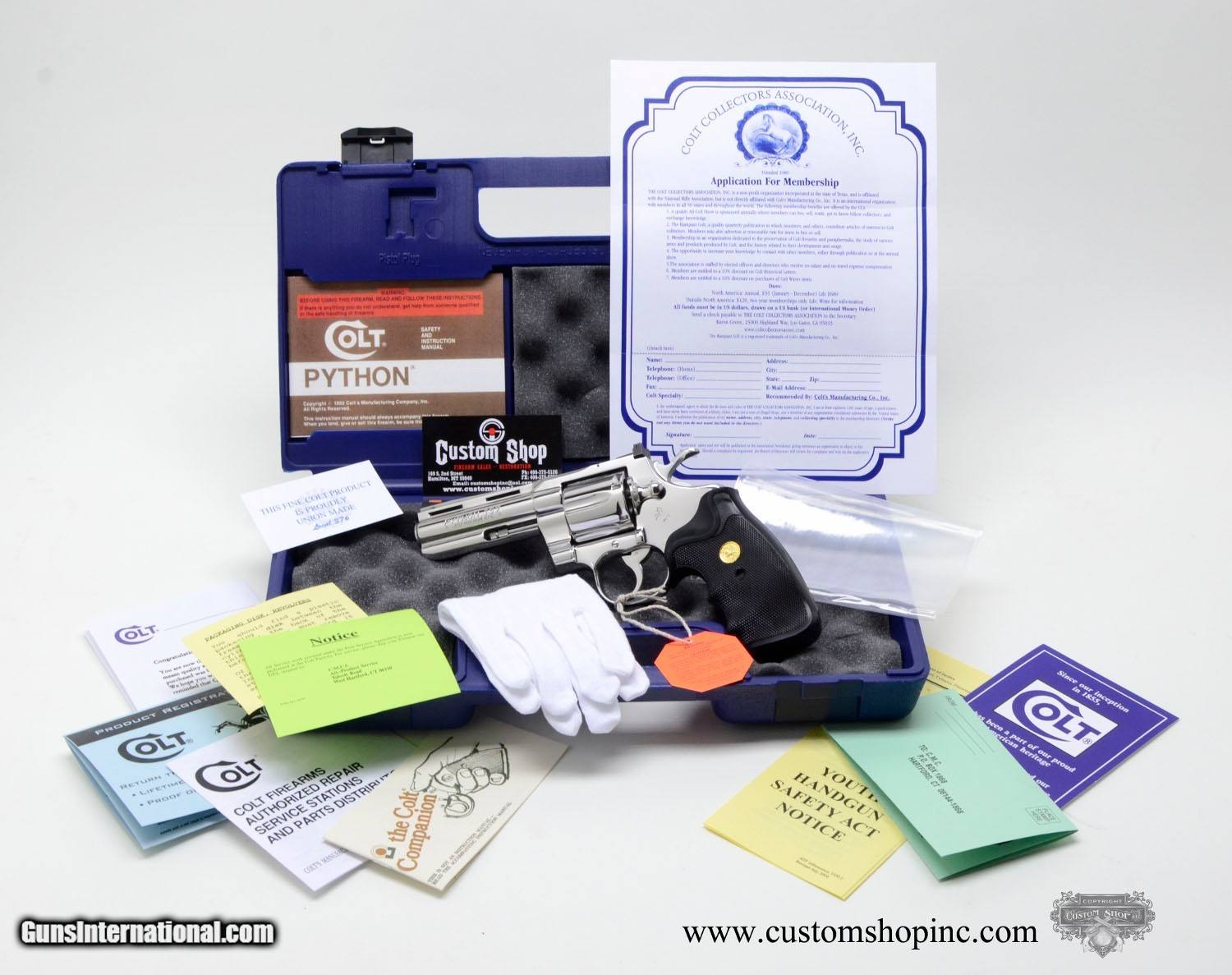 Description: Colt Python .357 Mag. 4 inch. Bright Stainless Finish. Like New In Blue Case. AVAILABLE FOR PURCHASE AT OUR ON-LINE STORE With Custom Shop, Inc.’s knowledge and professional experience as Colt’s Authorized Restoration & Repair Center, our gunsmiths have carefully reconditioned this firearm to the appearance it had the day it left the factory. The firearms we acquire for reconditioning are in Excellent condition all on their own; we just take them back to their original shine, maximizing their potential value. 'The Colt Python is a .357 Magnum caliber revolver formerly manufactured by Colt's Manufacturing Company of Hartford, Connecticut. It is sometimes referred to as a "Combat Magnum".[1] It was first introduced in 1955, the same year as Smith & Wesson's M29 .44 Magnum. The now discontinued Colt Python targeted the premium revolver market segment. Some firearm collectors and writers such as Jeff Cooper, Ian V. Hogg, Chuck Hawks, Leroy Thompson, Scott Wolber, Renee Smeets and Martin Dougherty have described the Python as the finest production revolver ever made. Like New In Blue Hard Case. The Colt Python is a double action handgun chambered for the .357 Magnum cartridge, built on Colt's large I-frame. Pythons have a reputation for accuracy, smooth trigger pull, and a tight cylinder lock-up.[2] They are similar in size and function to the Colt Trooper and Colt Lawman revolvers.' WIKIPEDIA Features Ventilated Rib, Fast-Cocking Wide Spur Hammer & Full Shrouded Ejector Rod.. (000598) SPECIFICATIONS