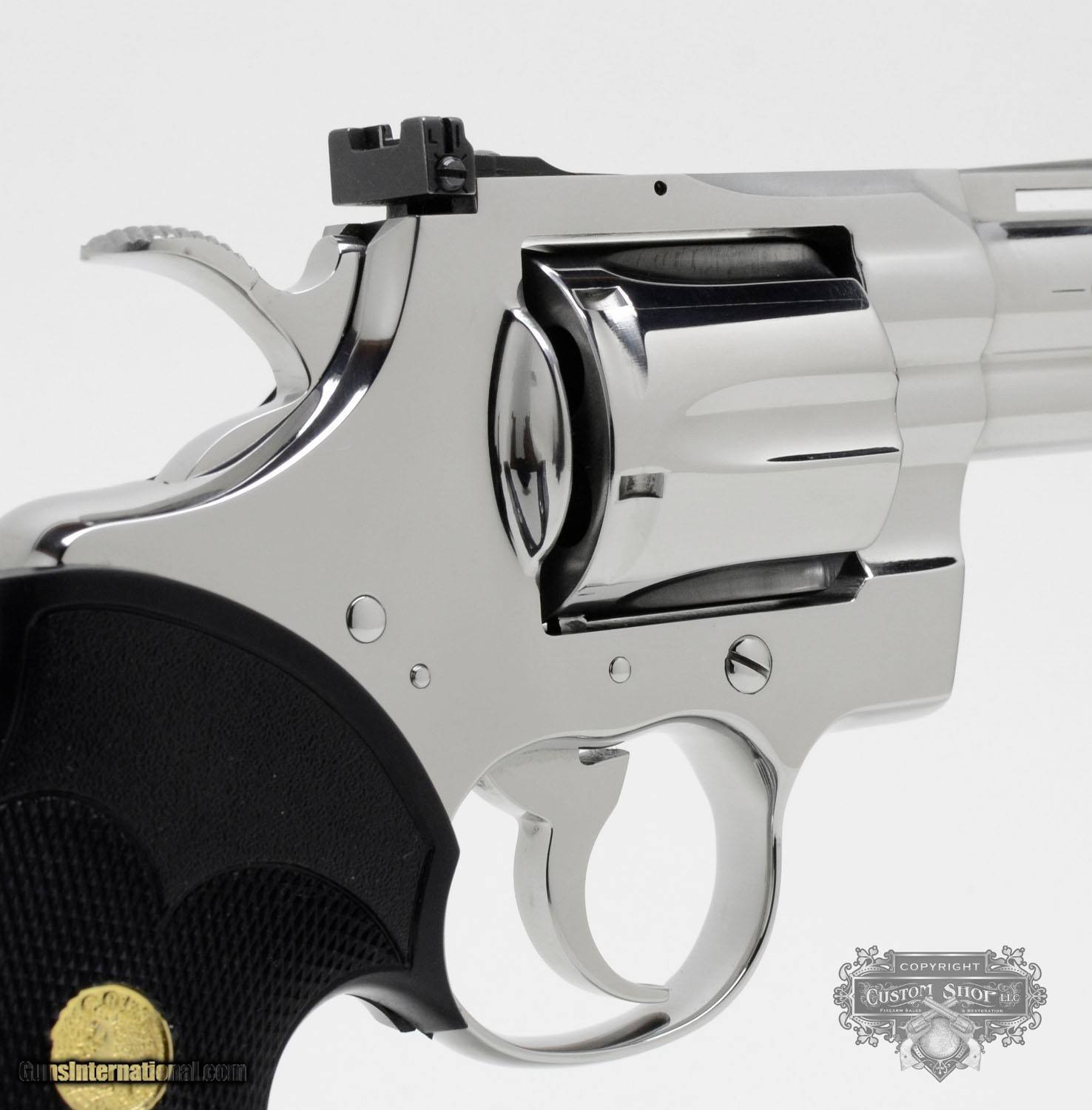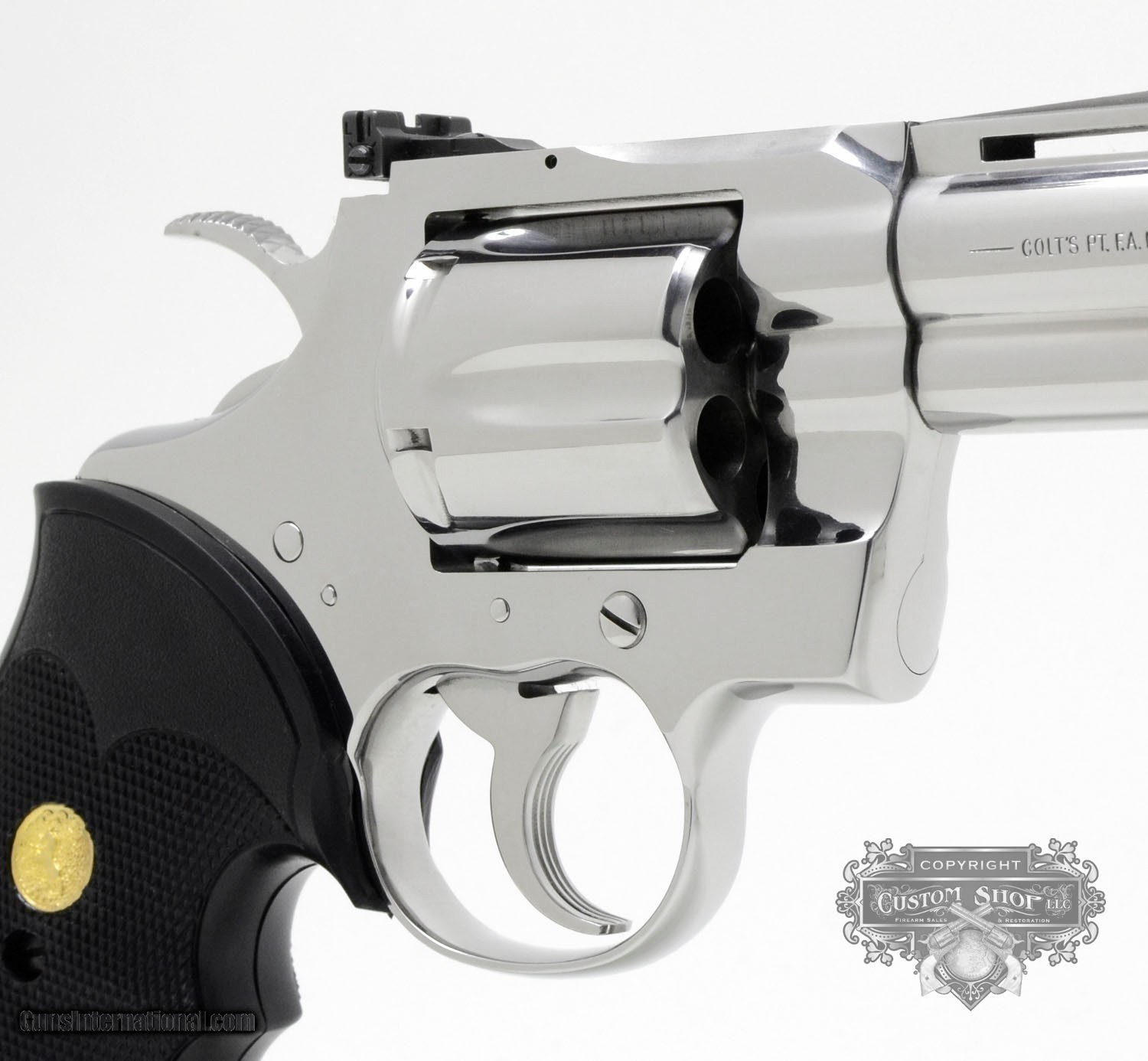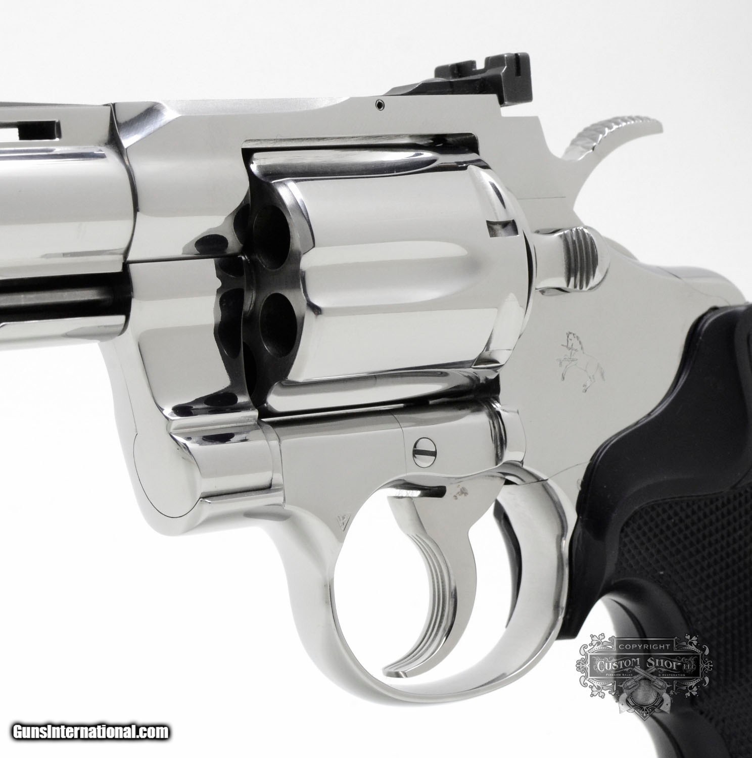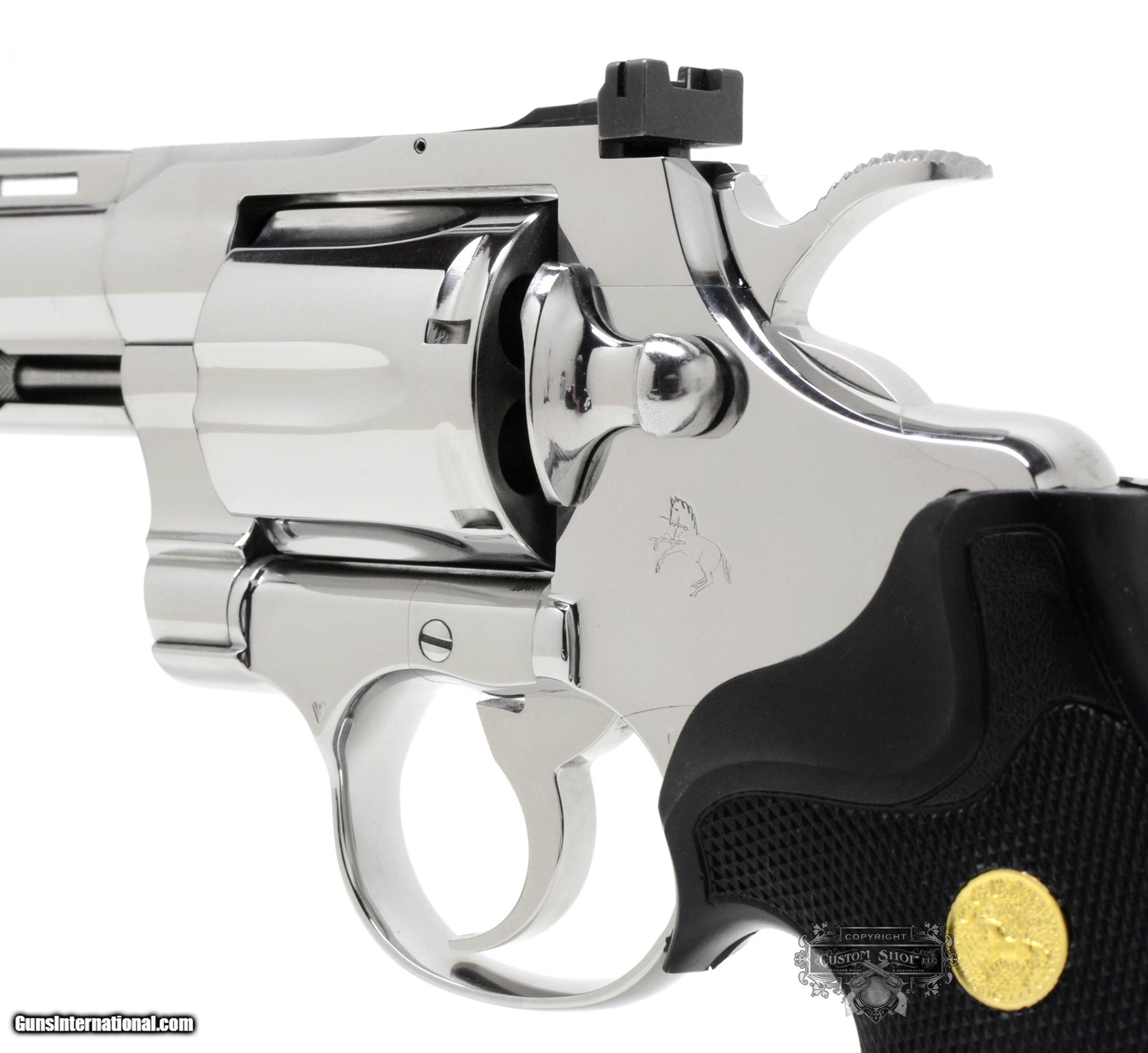 Description: Colt Python .357 Mag. 4 inch. Bright Stainless Finish. Like New In Blue Case. AVAILABLE FOR PURCHASE AT OUR ON-LINE STORE With Custom Shop, Inc.’s knowledge and professional experience as Colt’s Authorized Restoration & Repair Center, our gunsmiths have carefully reconditioned this firearm to the appearance it had the day it left the factory. The firearms we acquire for reconditioning are in Excellent condition all on their own; we just take them back to their original shine, maximizing their potential value. 'The Colt Python is a .357 Magnum caliber revolver formerly manufactured by Colt's Manufacturing Company of Hartford, Connecticut. It is sometimes referred to as a "Combat Magnum".[1] It was first introduced in 1955, the same year as Smith & Wesson's M29 .44 Magnum. The now discontinued Colt Python targeted the premium revolver market segment. Some firearm collectors and writers such as Jeff Cooper, Ian V. Hogg, Chuck Hawks, Leroy Thompson, Scott Wolber, Renee Smeets and Martin Dougherty have described the Python as the finest production revolver ever made. Like New In Blue Hard Case. The Colt Python is a double action handgun chambered for the .357 Magnum cartridge, built on Colt's large I-frame. Pythons have a reputation for accuracy, smooth trigger pull, and a tight cylinder lock-up.[2] They are similar in size and function to the Colt Trooper and Colt Lawman revolvers.' WIKIPEDIA Features Ventilated Rib, Fast-Cocking Wide Spur Hammer & Full Shrouded Ejector Rod.. (000598) SPECIFICATIONS