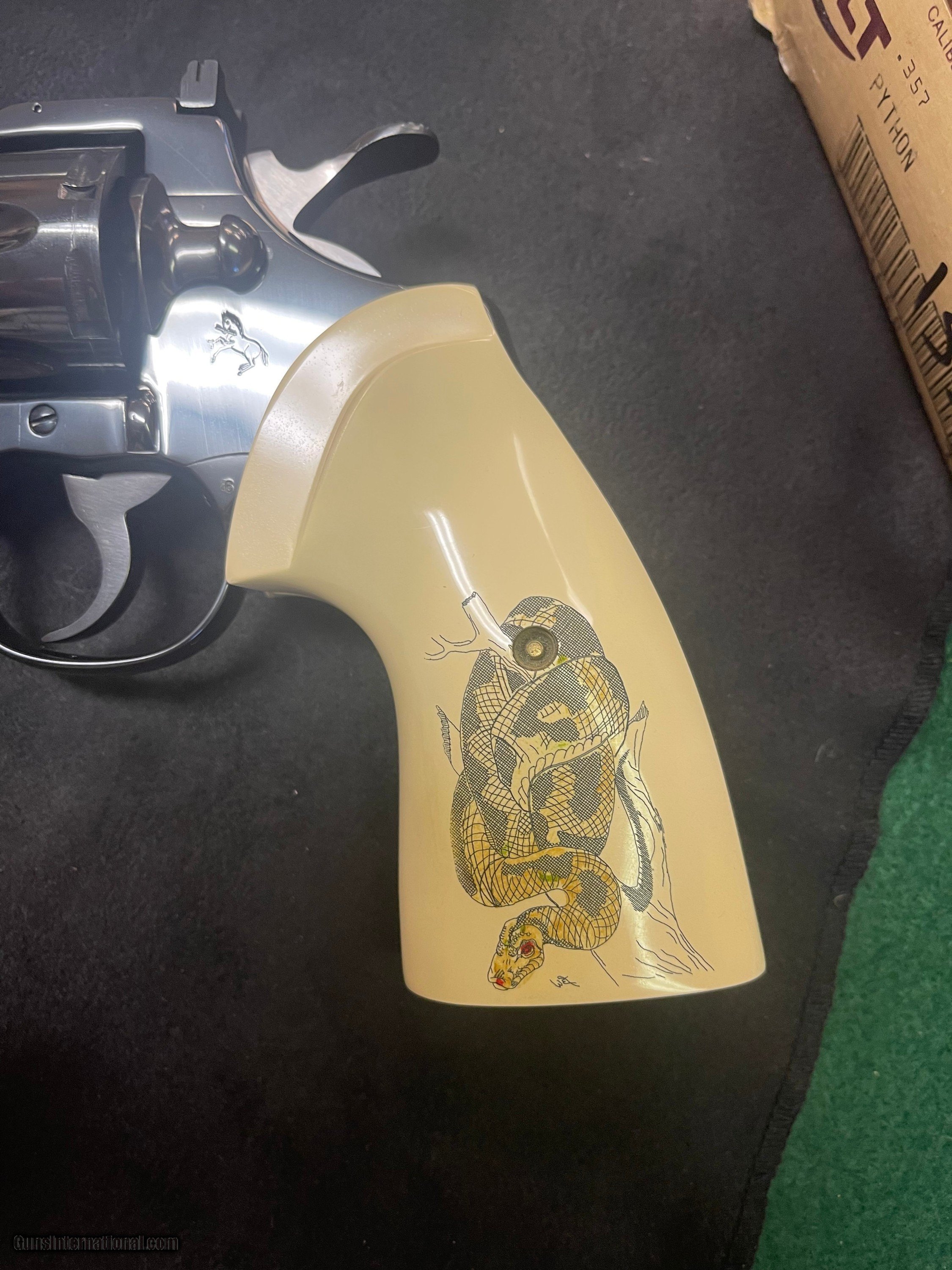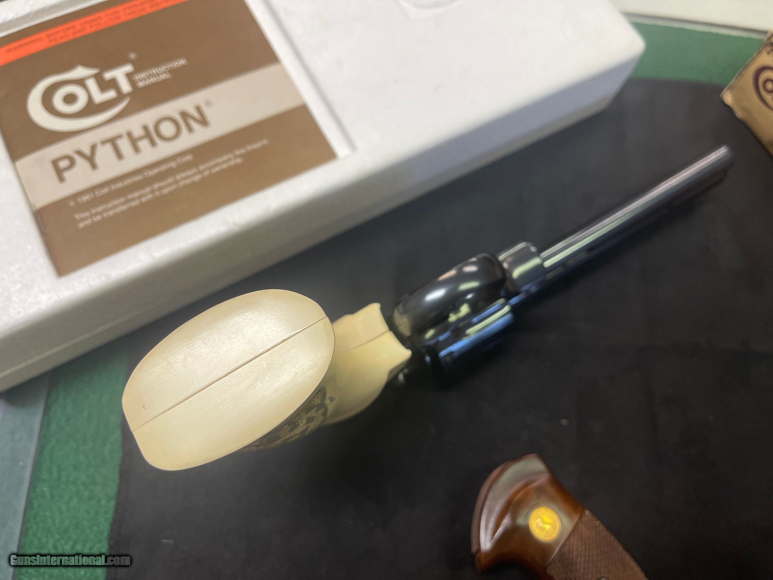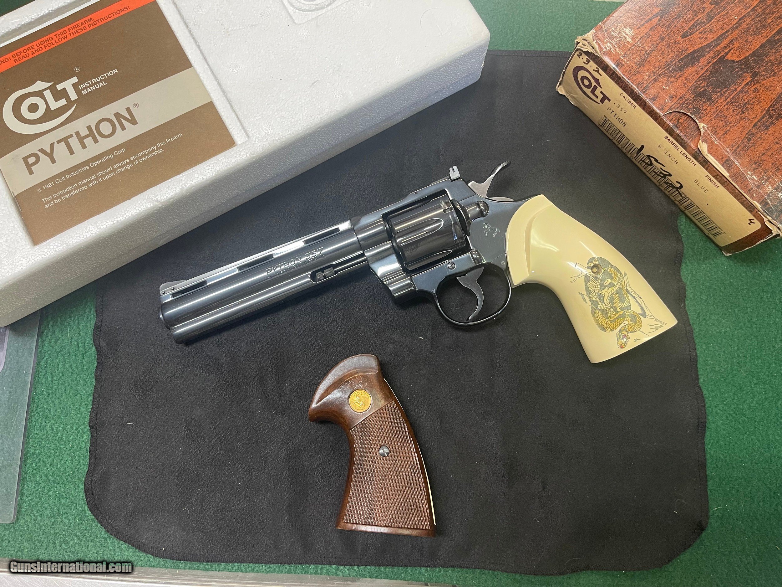 Description: Beautiful Colt Python, 6 inch barrel, 357 magnum, upgraded faux ivory snake grips (original factory grips included) in original factory matching numbered box, 2 piece styrofoam and outer brown faux wood grain box. Has the original manual. This Colt was made in 1981 and is just a beautiful example of what Colt was capable of producing. Has 99% of its blue and both the grips are in very good condition with virtually no spots of wear. Likely not fired, but impossible to say for certain with its age. Thanks for your interest. SOLD Handgun Caliber: .357 Magnum Manufacturer: Colt Model: Python Serial Number: K55723 Condition: Excellent Metal Condition: Excellent Wood Condition: Excellent Bore Condition: Excellent Finish: Royal Blue Manufacture Date: 1981 Extras: Faux Ivory Python Grips Case: Original Box |