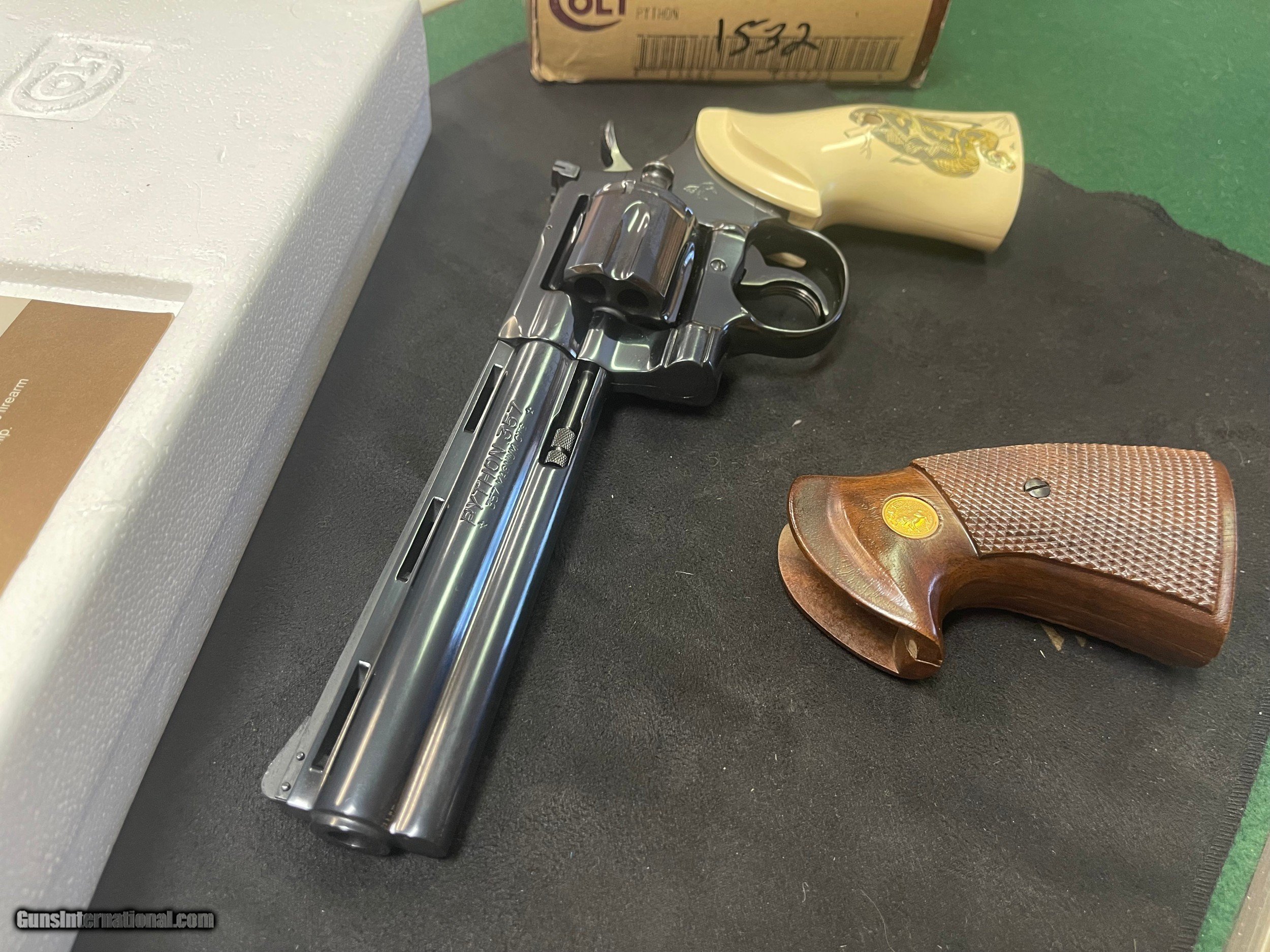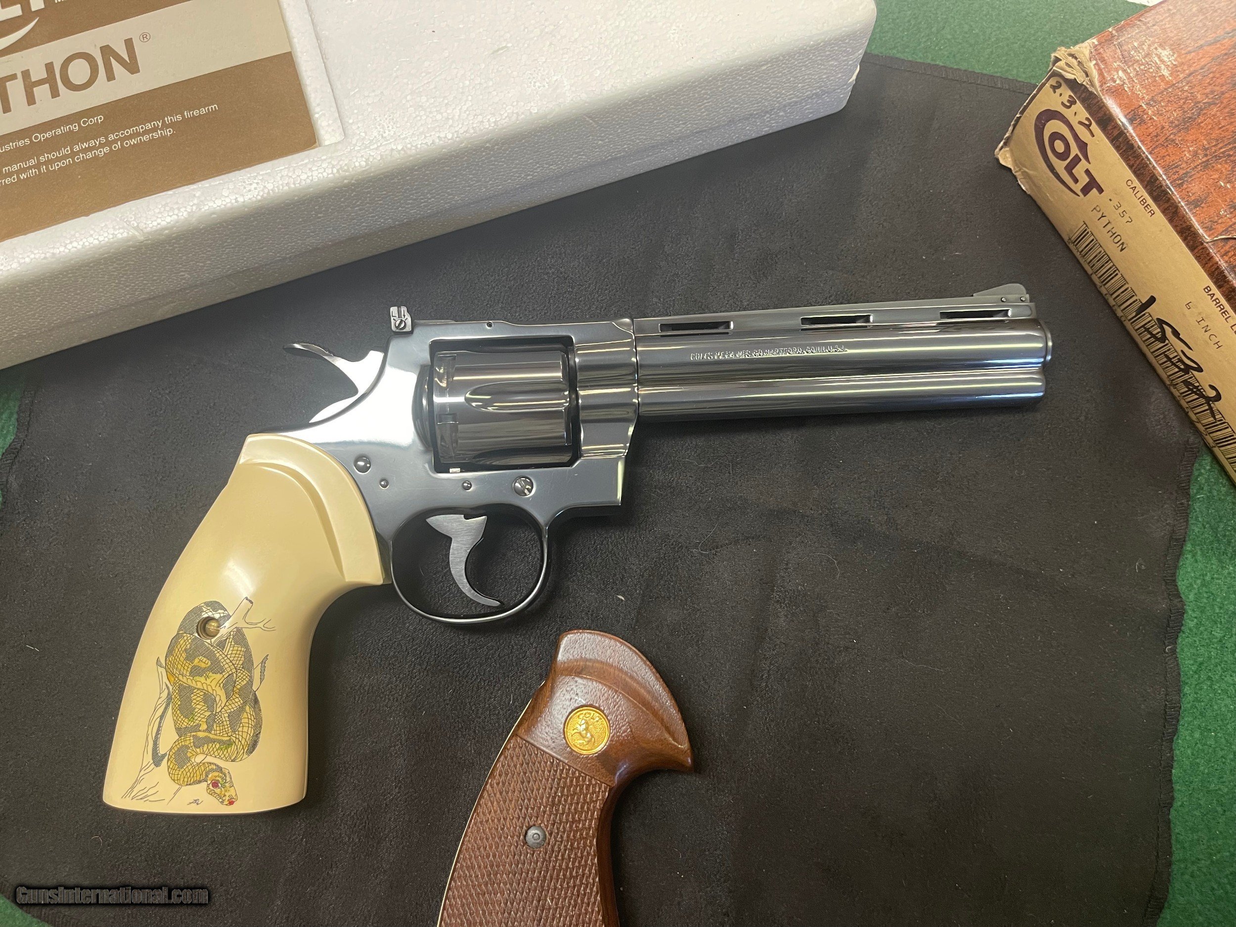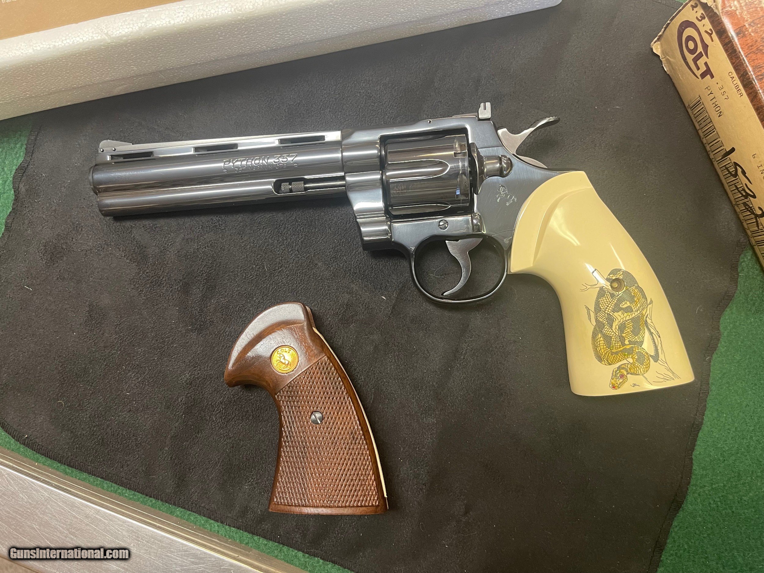 Description: Beautiful Colt Python, 6 inch barrel, 357 magnum, upgraded faux ivory snake grips (original factory grips included) in original factory matching numbered box, 2 piece styrofoam and outer brown faux wood grain box. Has the original manual. This Colt was made in 1981 and is just a beautiful example of what Colt was capable of producing. Has 99% of its blue and both the grips are in very good condition with virtually no spots of wear. Likely not fired, but impossible to say for certain with its age. Thanks for your interest. SOLD Handgun Caliber: .357 Magnum Manufacturer: Colt Model: Python Serial Number: K55723 Condition: Excellent Metal Condition: Excellent Wood Condition: Excellent Bore Condition: Excellent Finish: Royal Blue Manufacture Date: 1981 Extras: Faux Ivory Python Grips Case: Original Box |