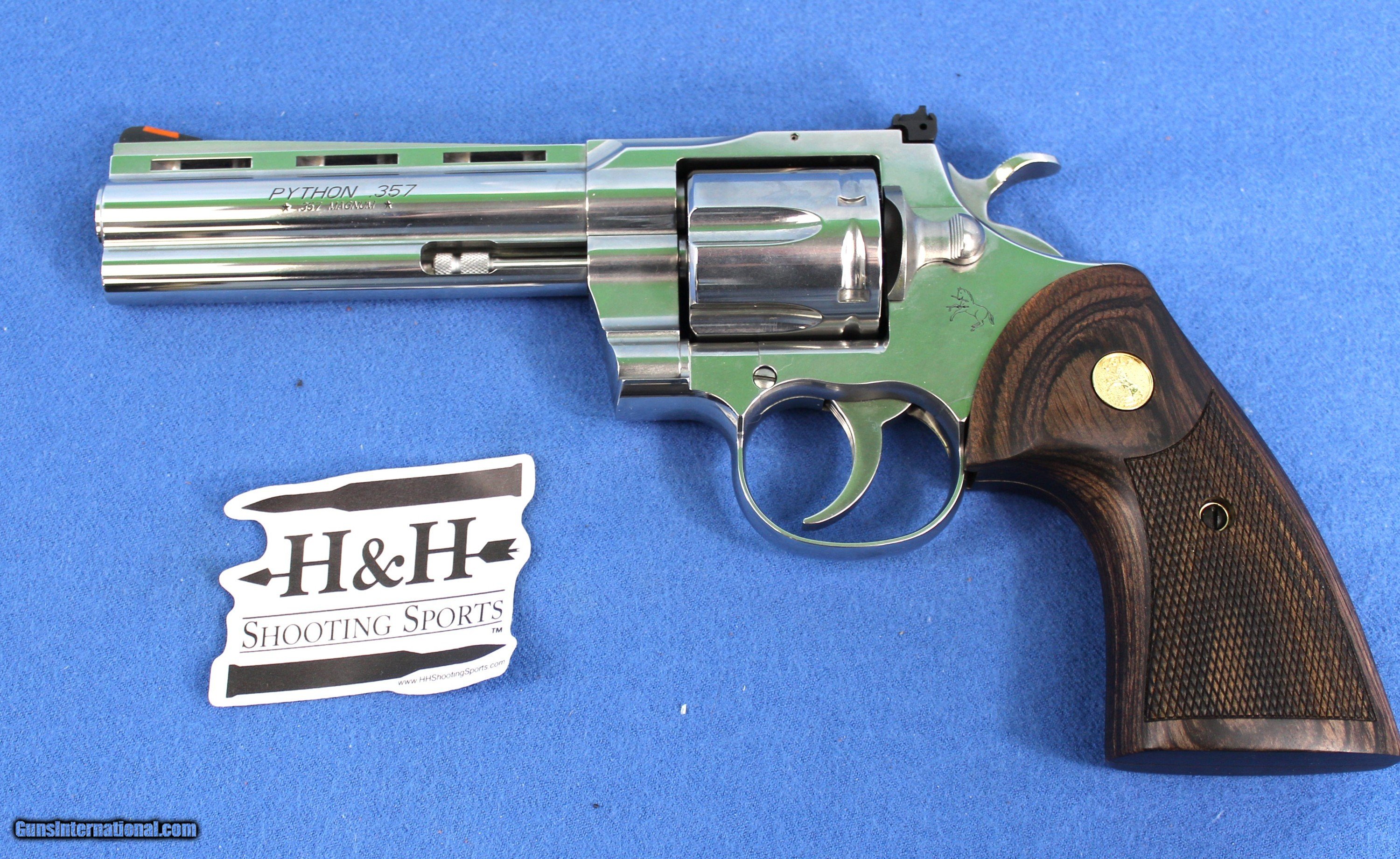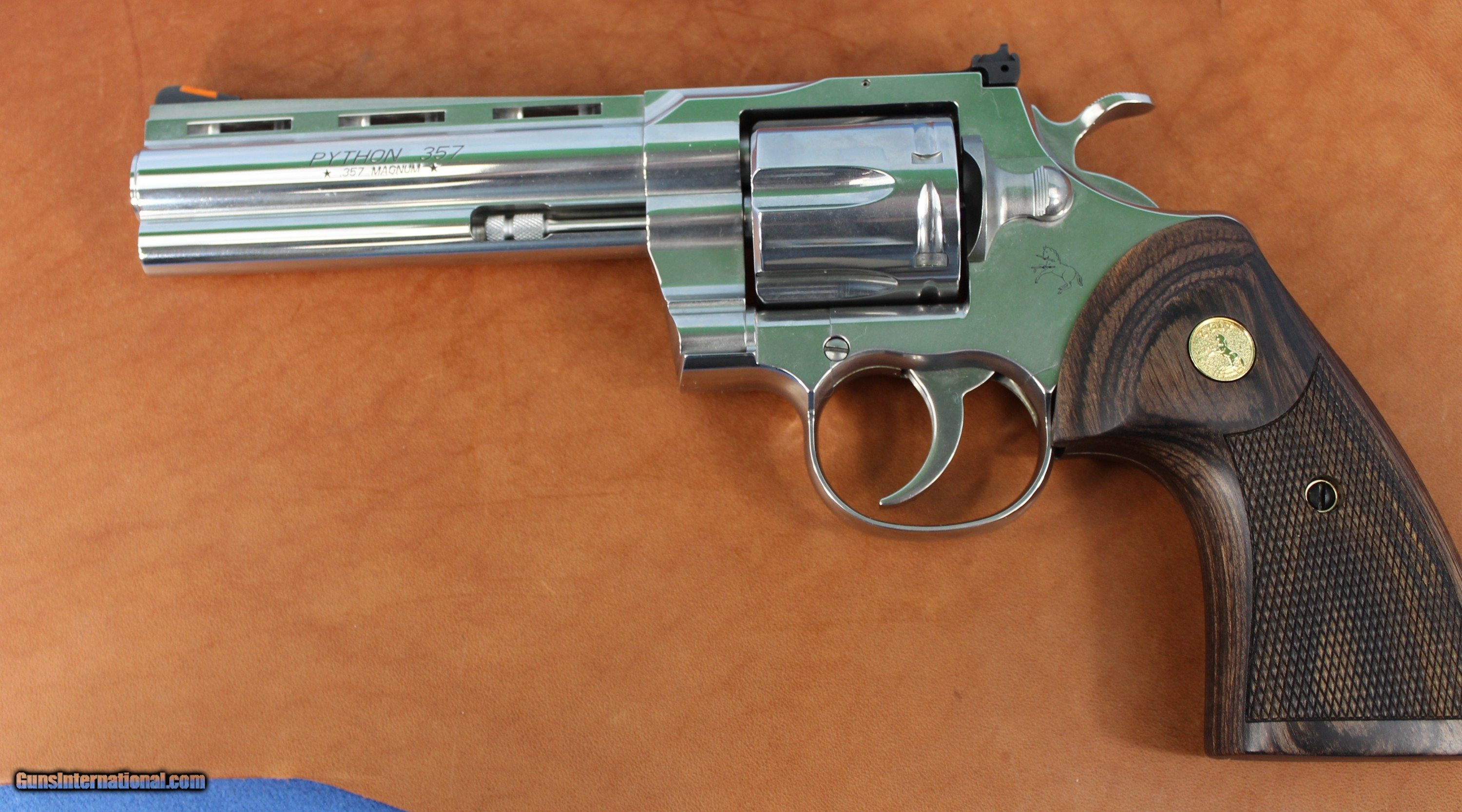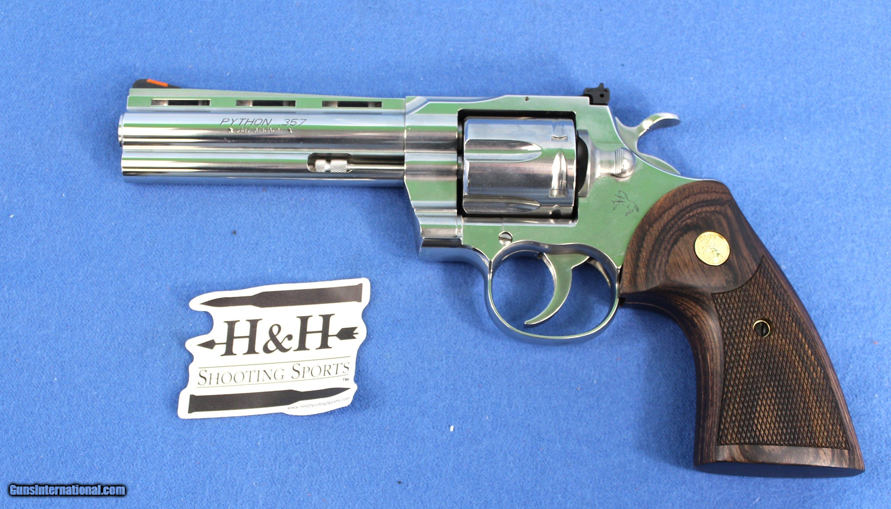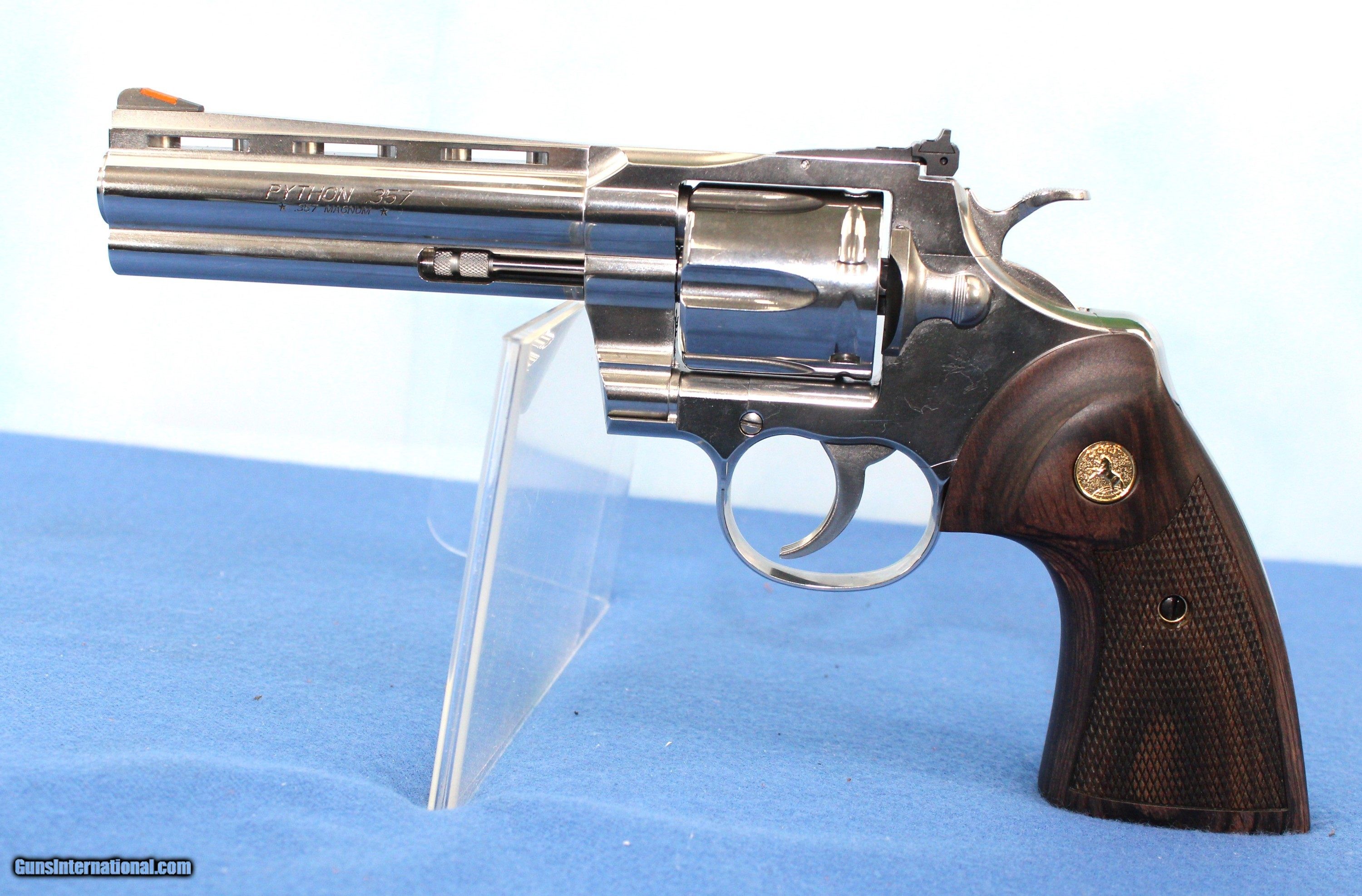 Description: COLT PYTHON .357 MAG PYTHON SP5WTS Description: MODEL: Python TYPE: Revolver ACTION: Double / Single Action CALIBER/GAUGE: 357 Magnum | 38 Special FINISH: Stainless Steel FINISH TYPE: Stainless Steel FRAME: Steel Frame STOCK/GRIPS: Walnut BARREL: 5" OVERALL LENGTH: 10.5" RATE-OF-TWIST: 1-in-14" CAPACITY: 6 SIGHTS: Red Ramp Front/Adjustable Rear SIGHT TYPE: Adjustable Sights WEIGHT: 42 oz. Condition: New Excellent SOLD Handgun Caliber: .357 Magnum Manufacturer: COLT Model: PYTHON Barrel Length: 5 Condition: New - Excellent Metal Condition: Excellent Wood Condition: Excellent Weight: 42 oz. |