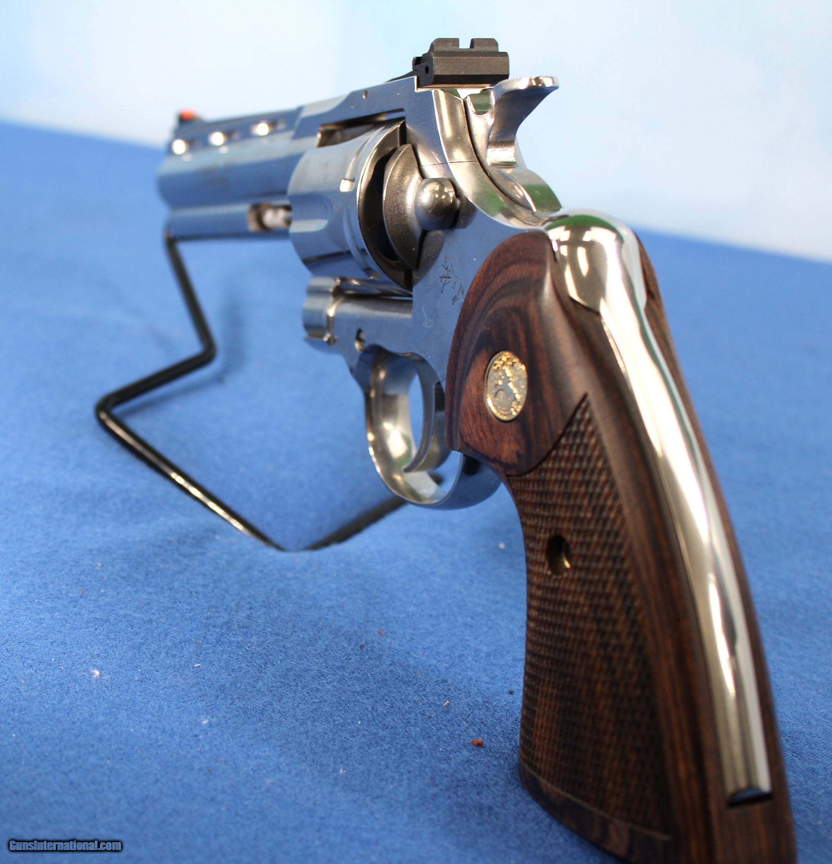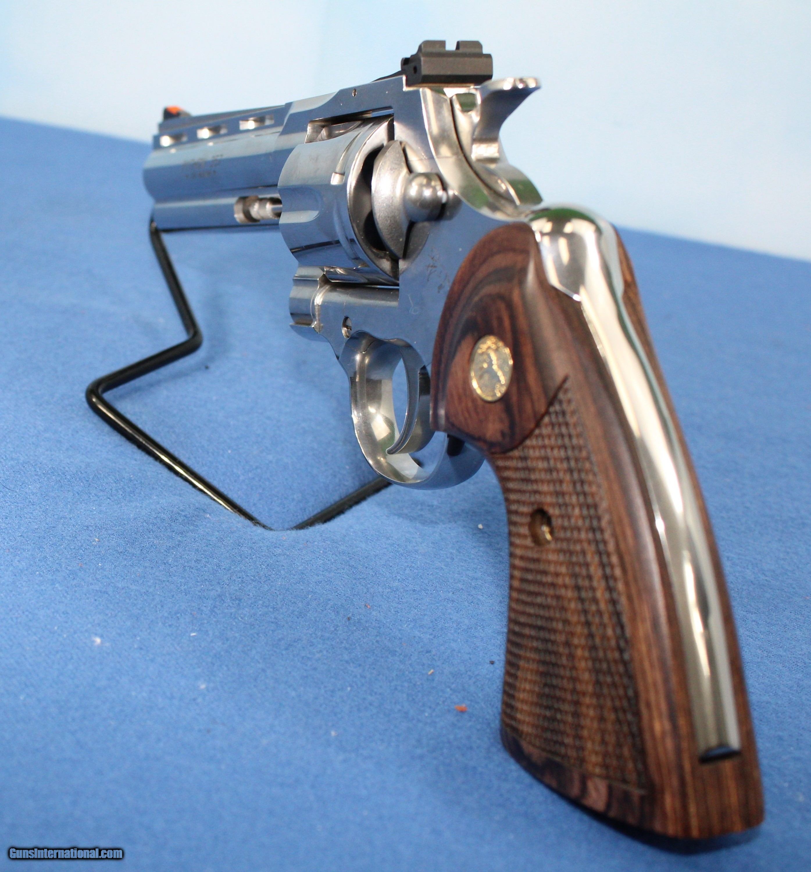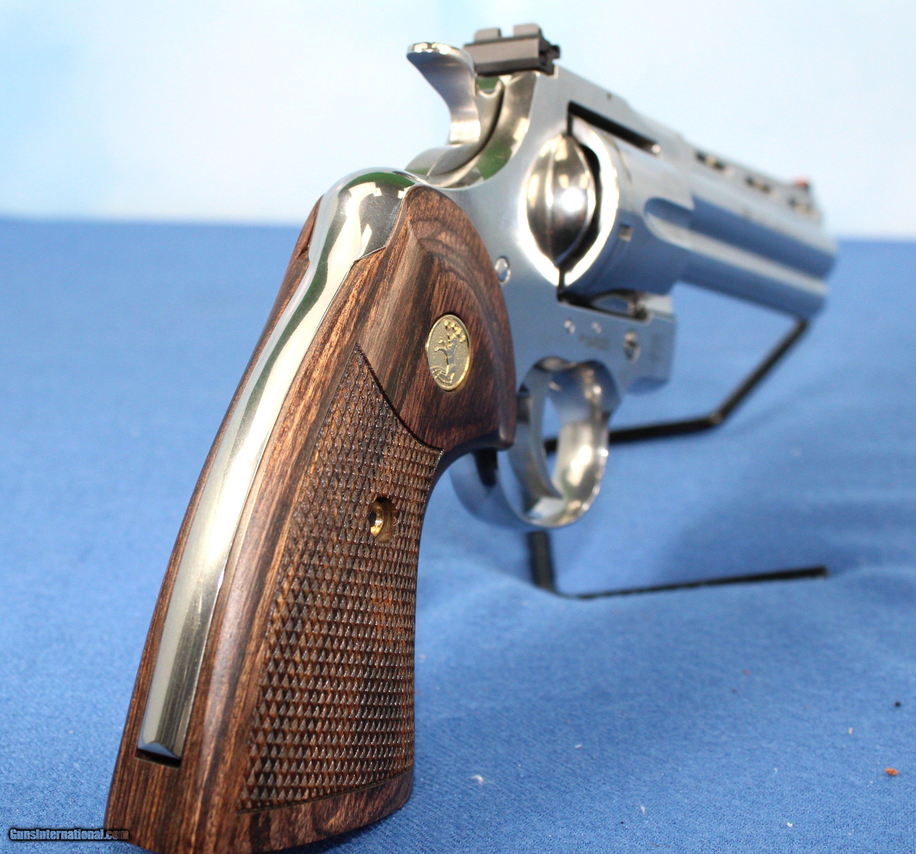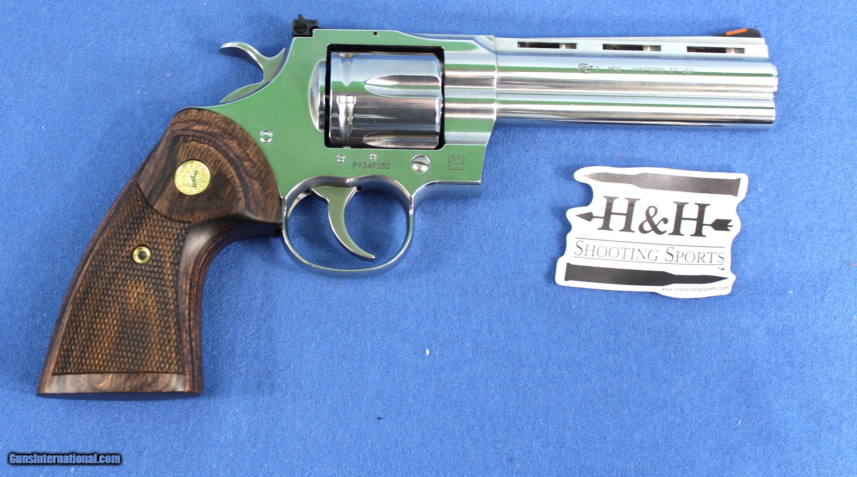 Description: COLT PYTHON .357 MAG PYTHON SP5WTS Description: MODEL: Python TYPE: Revolver ACTION: Double / Single Action CALIBER/GAUGE: 357 Magnum | 38 Special FINISH: Stainless Steel FINISH TYPE: Stainless Steel FRAME: Steel Frame STOCK/GRIPS: Walnut BARREL: 5" OVERALL LENGTH: 10.5" RATE-OF-TWIST: 1-in-14" CAPACITY: 6 SIGHTS: Red Ramp Front/Adjustable Rear SIGHT TYPE: Adjustable Sights WEIGHT: 42 oz. Condition: New Excellent SOLD Handgun Caliber: .357 Magnum Manufacturer: COLT Model: PYTHON Barrel Length: 5 Condition: New - Excellent Metal Condition: Excellent Wood Condition: Excellent Weight: 42 oz. |