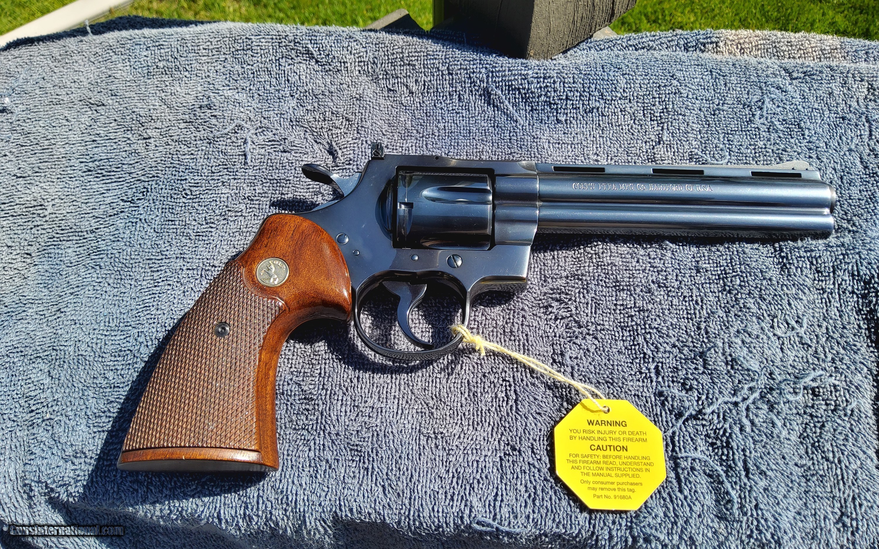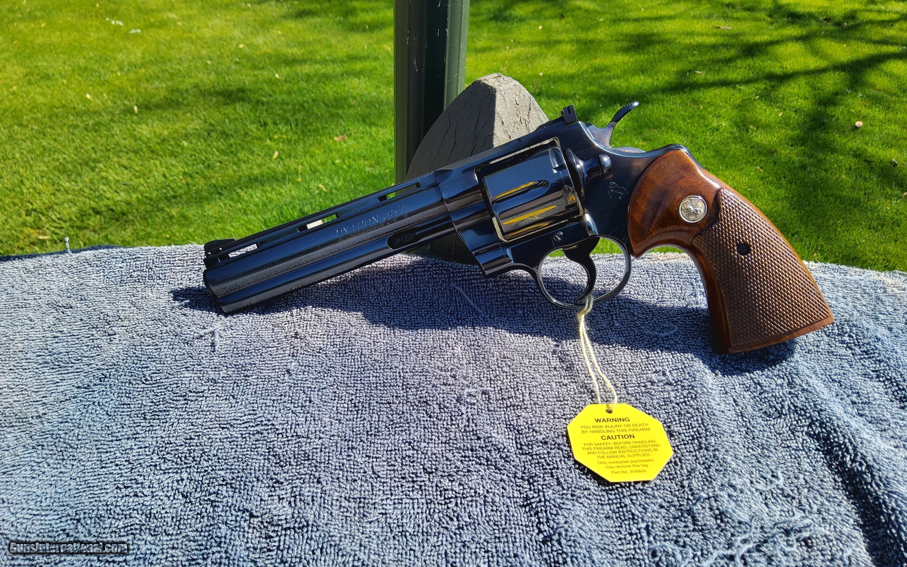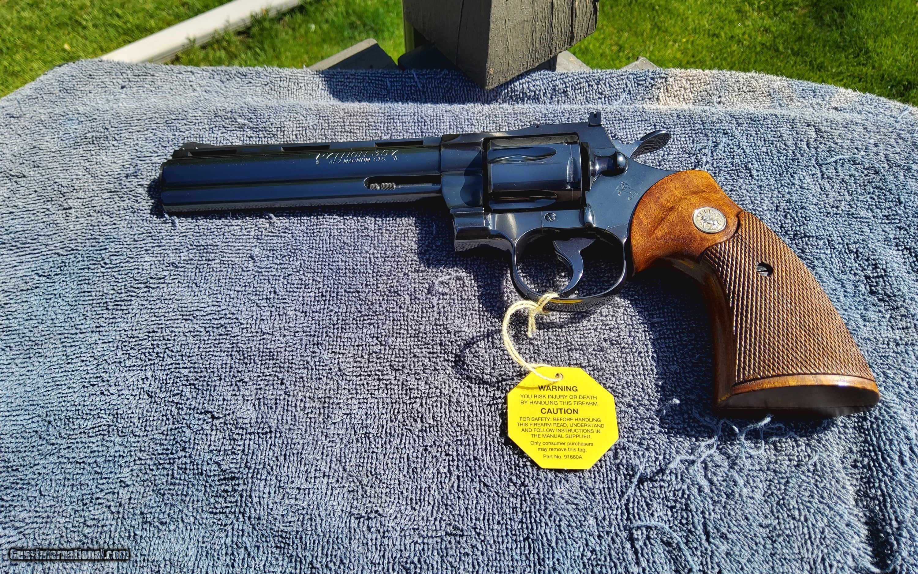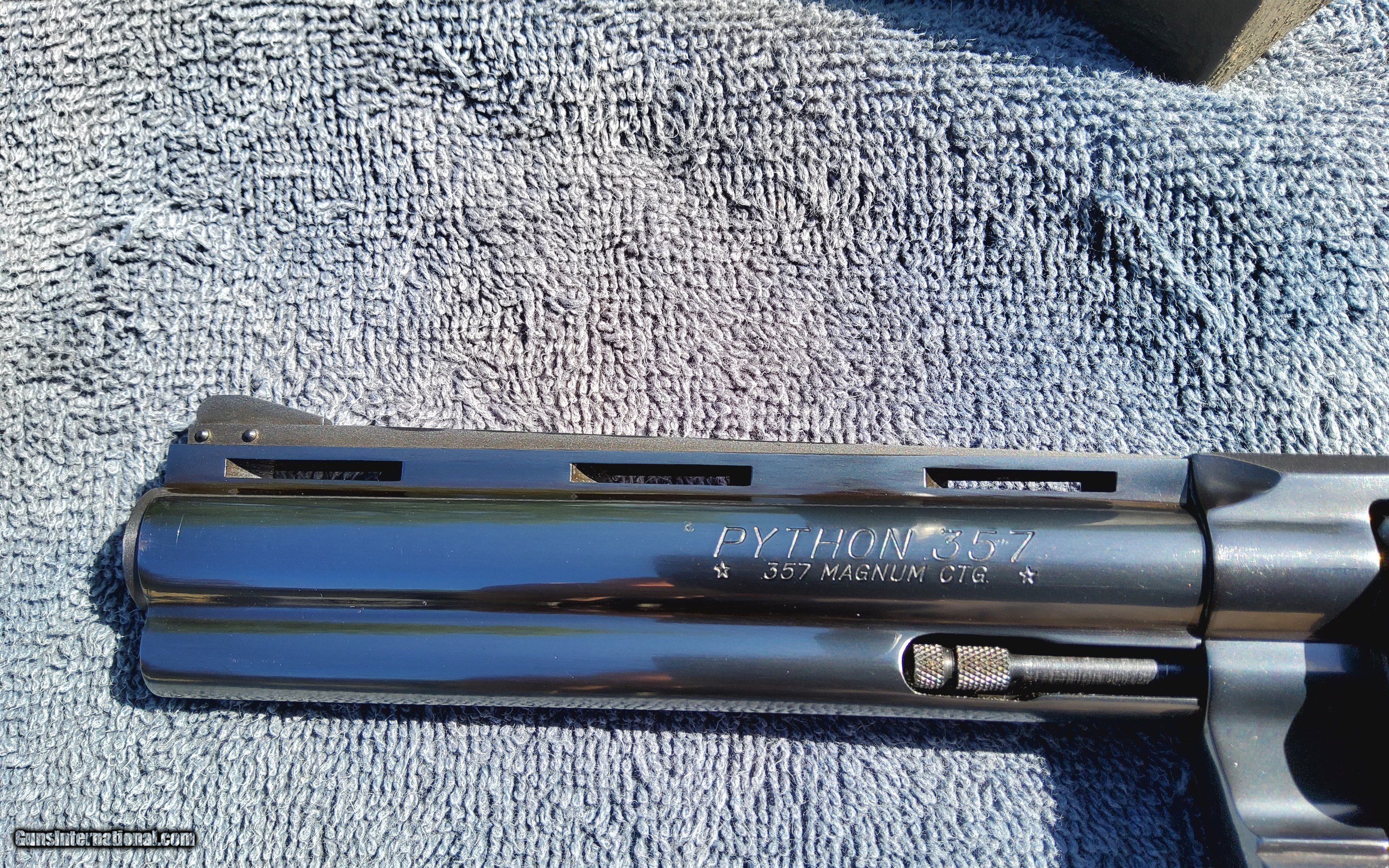 Description: Colt python from 1970 New old stock. Has original Box everything it came from the factor with it The gun looks completely on fired minor scratch Light. on the cylinder from the factory testing. It grips grips are also mend condition. Still has original Hand tag the trigger guard. Definitely will not be disappointed in this one. This is a highly solid after collector pistol. SOLD Curio/Relic: Yes Rifle Caliber: .17 Hornet Handgun Caliber: .357 Magnum Manufacturer: Colt Model: Python Serial Number: E12582 Condition: Mint Metal Condition: Mint Wood Condition: Mint Bore Condition: Mint |