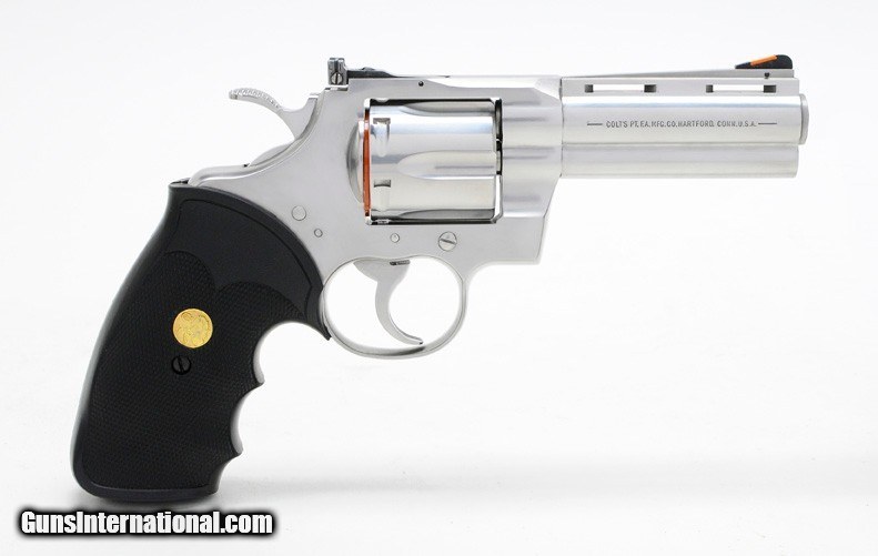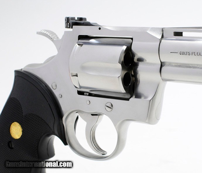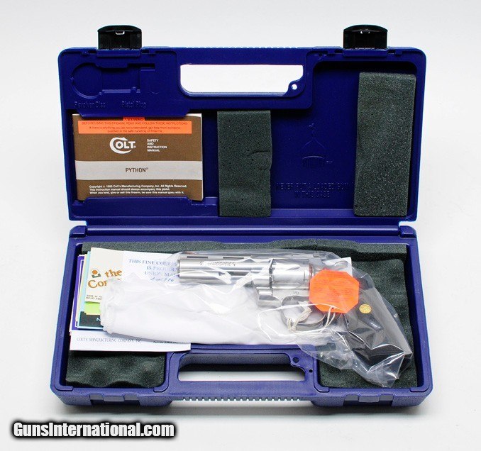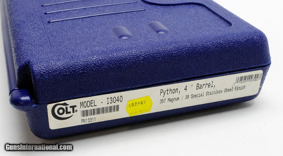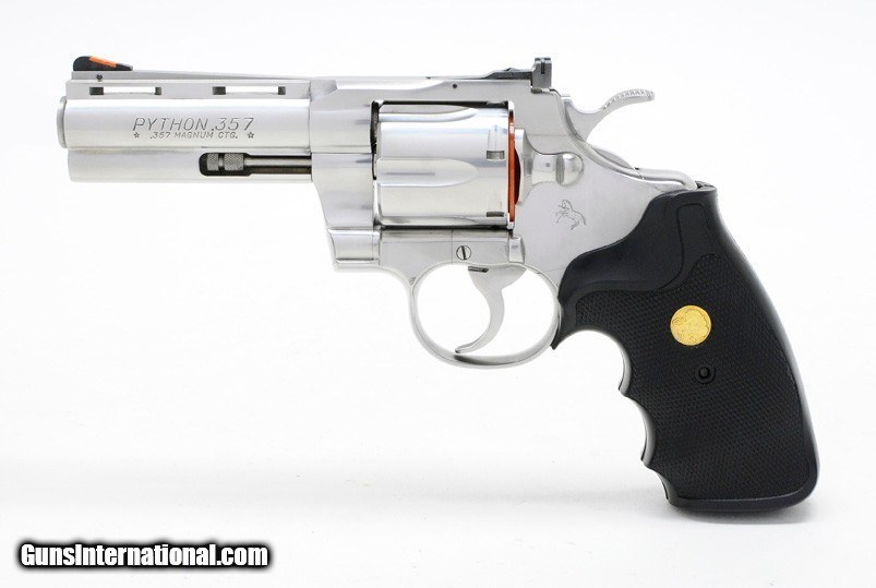 Description: Colt Python 357 Mag. 4 Inch Satin Stainless Finish. Like New In Blue Hard Case AVAILABLE FOR PURCHASE AT OUR ON-LINE STORE Like New Condition In Blue Hard Case. Features Ventilated Rib, Fast-Cocking Wide Spur Hammer & Full Shrouded Ejector Rod. The Colt Python is a .357 Magnum caliber revolver formerly manufactured by Colt's Manufacturing Company of Hartford, Connecticut. It is sometimes referred to as a "Combat Magnum". It was first introduced in 1955, the same year as Smith & Wesson's M29 .44 Magnum. The now discontinued Colt Python targeted the premium revolver market segment. Some firearm collectors and writers such as Jeff Cooper, Ian V. Hogg, Chuck Hawks, Leroy Thompson, Scott Wolber, Renee Smeets and Martin Dougherty have described the Python as the finest production revolver ever made DOM 1996 SPECIFICATIONS