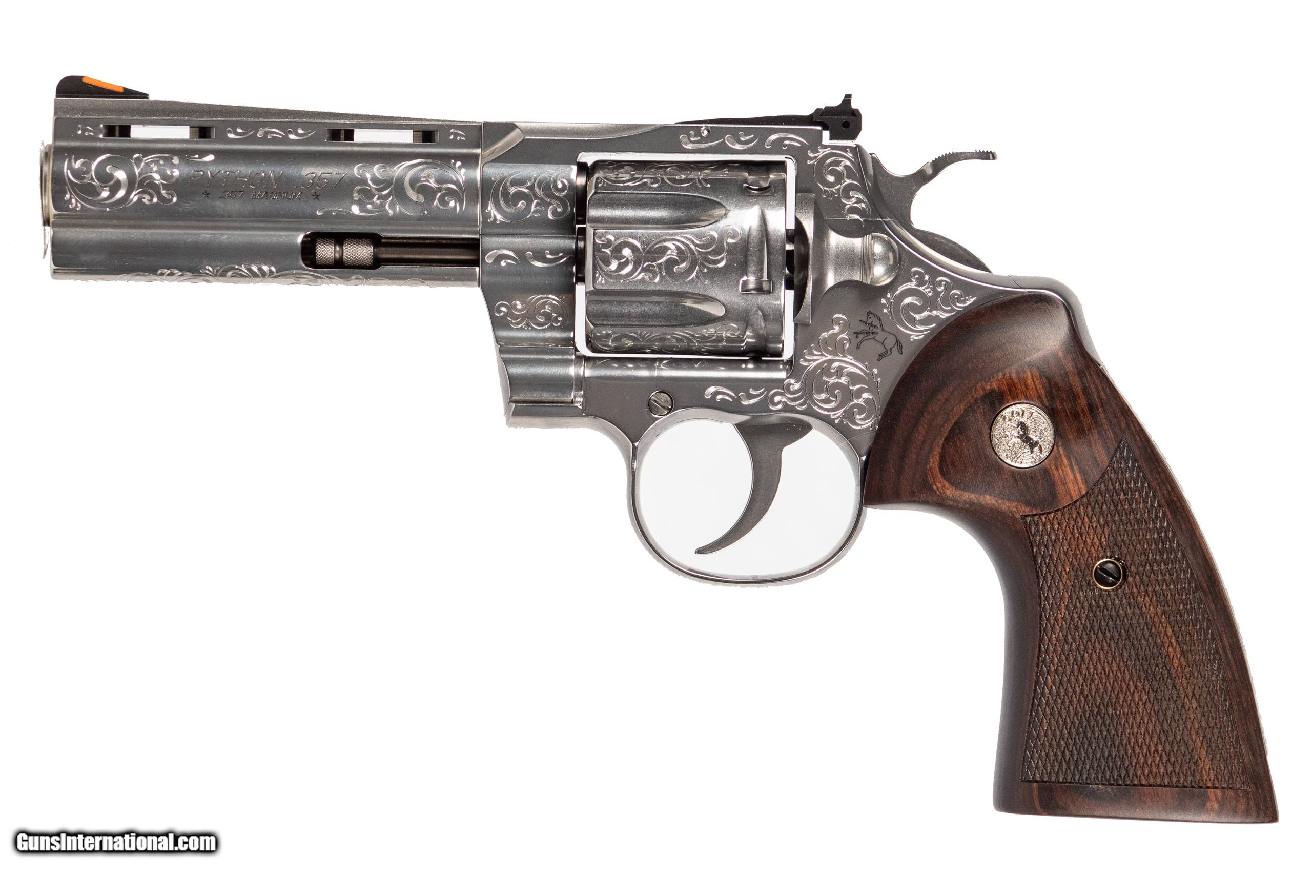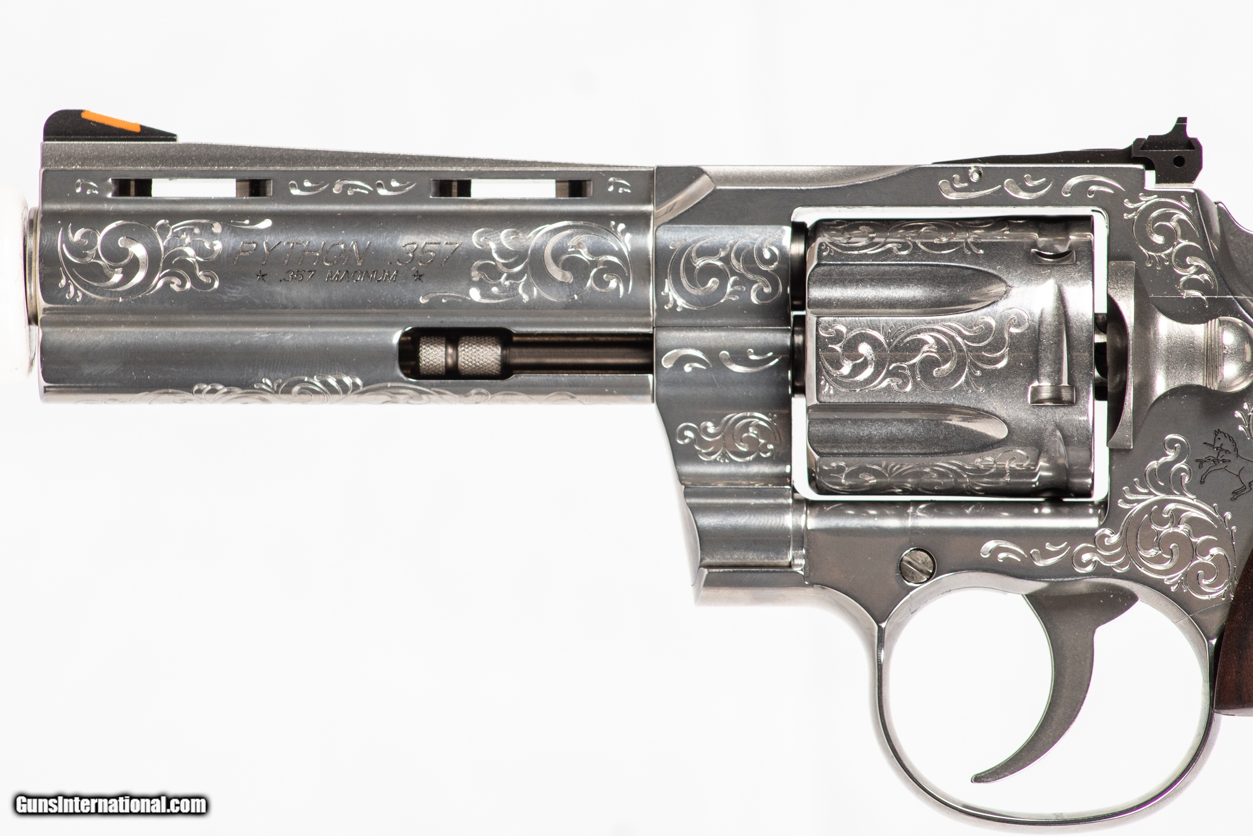 Description: Colt Python chambered in 357MAG, 4 inch barrel, bright and shiny bore. Scroll engraving done by Colt's Custom Workshop. The NRA grading condition for this NIB firearm is Excellent. Dury's Lifetime Warranty: All firearms purchased from Dury’s Gun Shop, NEW or USED, are covered by a lifetime warranty. We will repair or replace, at our discretion, any firearm purchased from Dury’s Gun Shop, Inc. for as long as it is owned by the purchaser. This warranty is not transferable. WE BUY GUNS! NO COLLECTION TOO BIG OR SMALL FOR OUR GUNS INTERNATIONAL CUSTOMERS ALL OF OUR FIREARMS CAN BE PURCHASED DIRECTLY FROM OUR DURY'S GUNS ! SOLD Manufacturer: Colt Model: PYTHON Caliber Info: 357 MAG Barrels: 4inches |